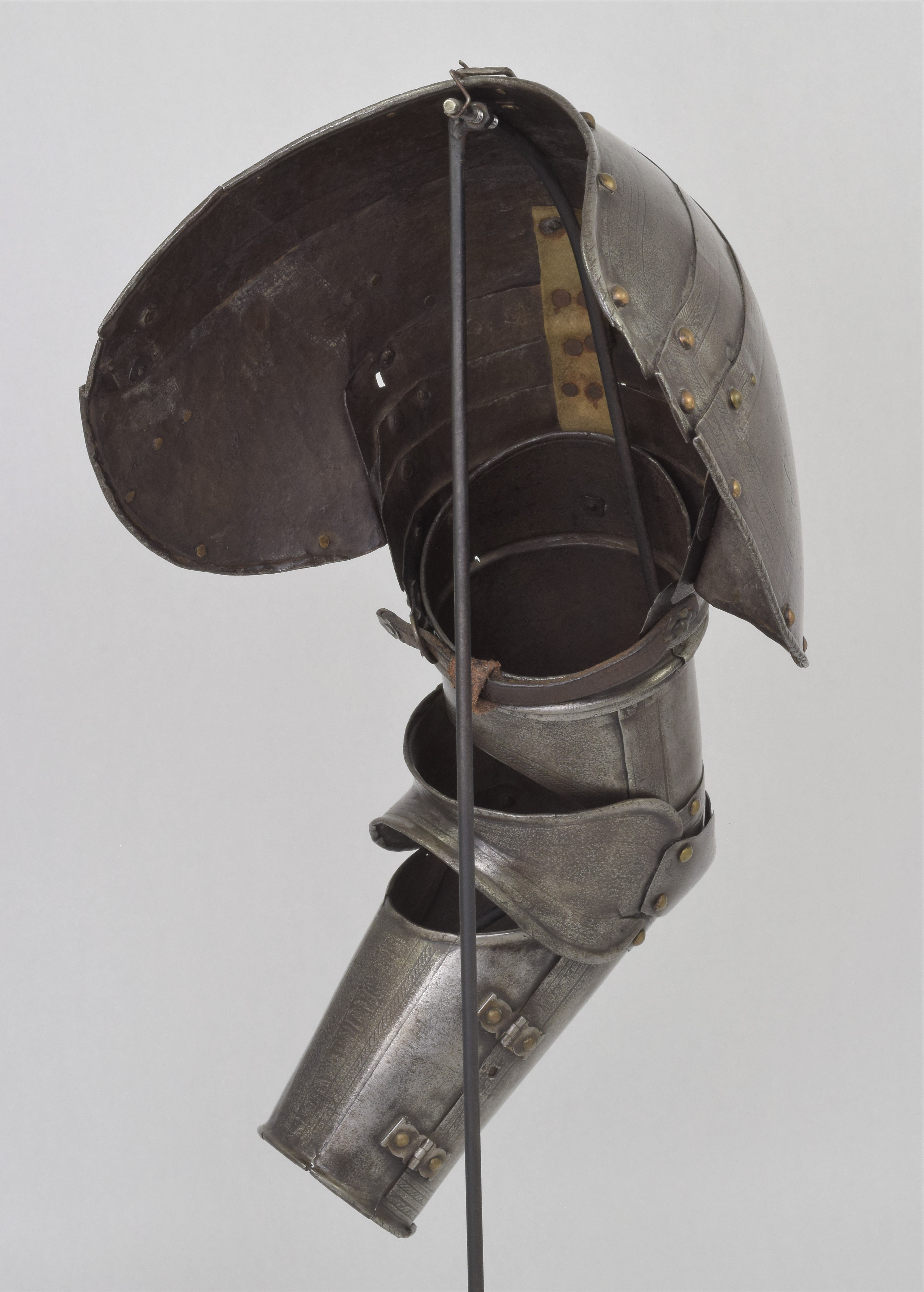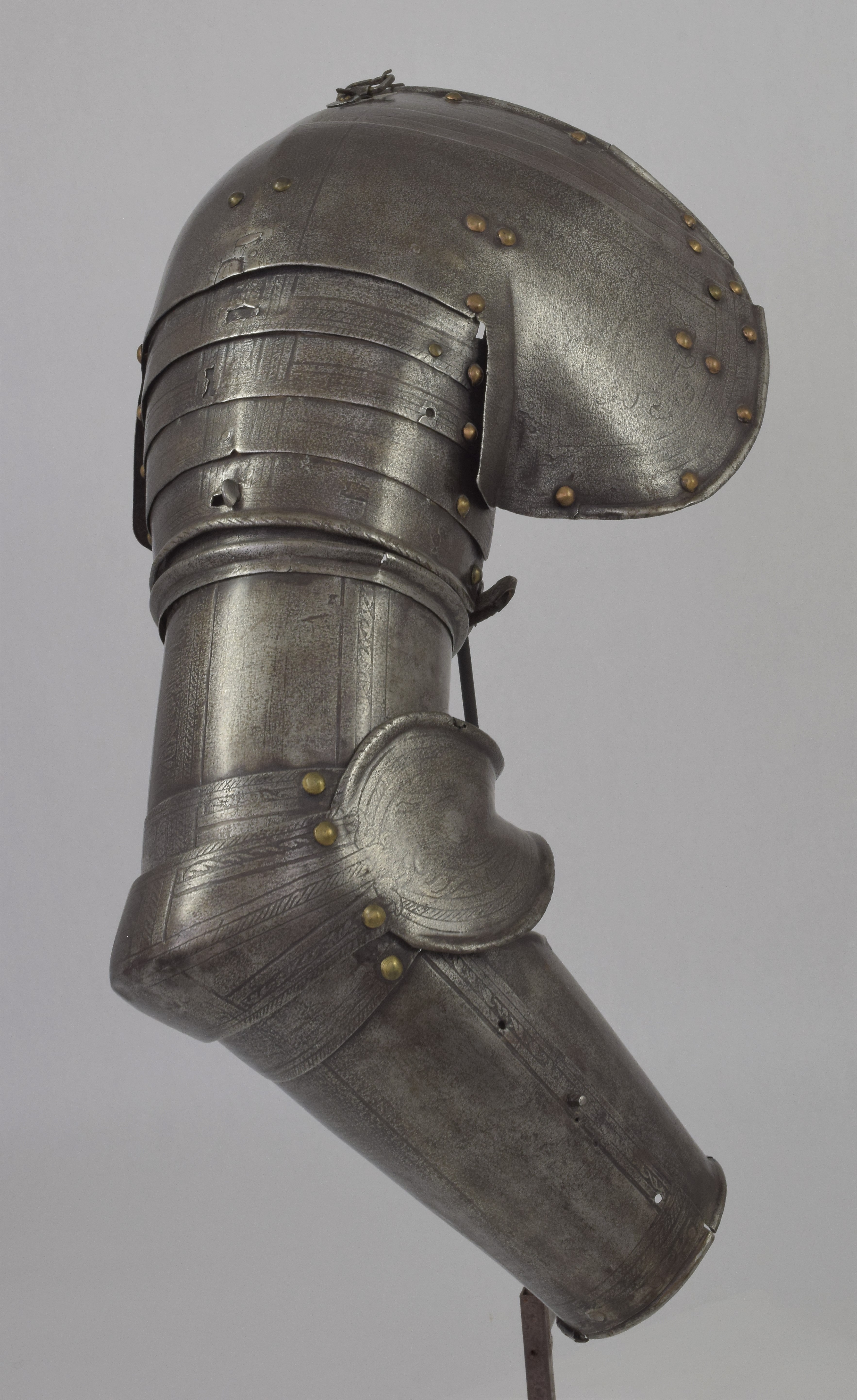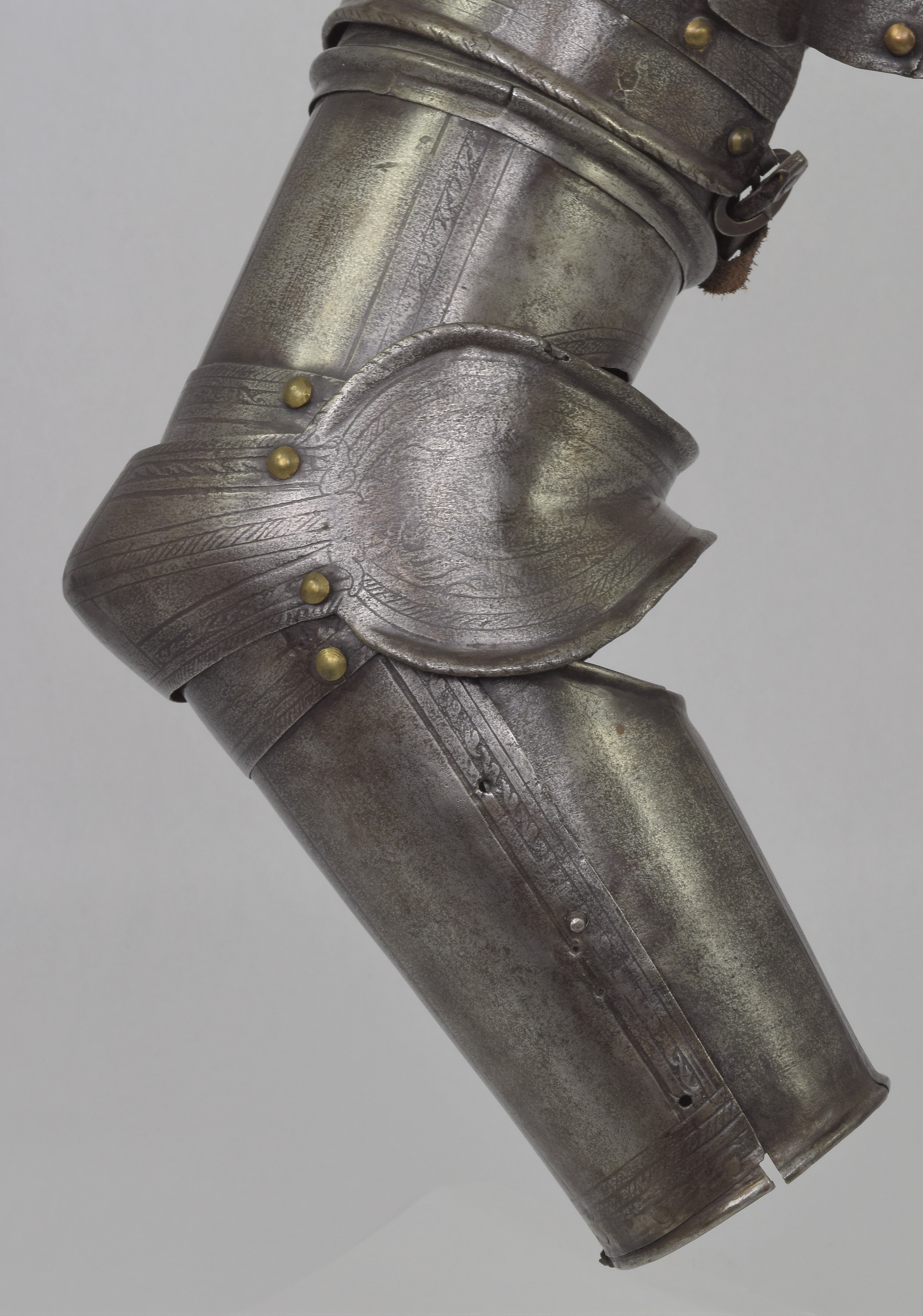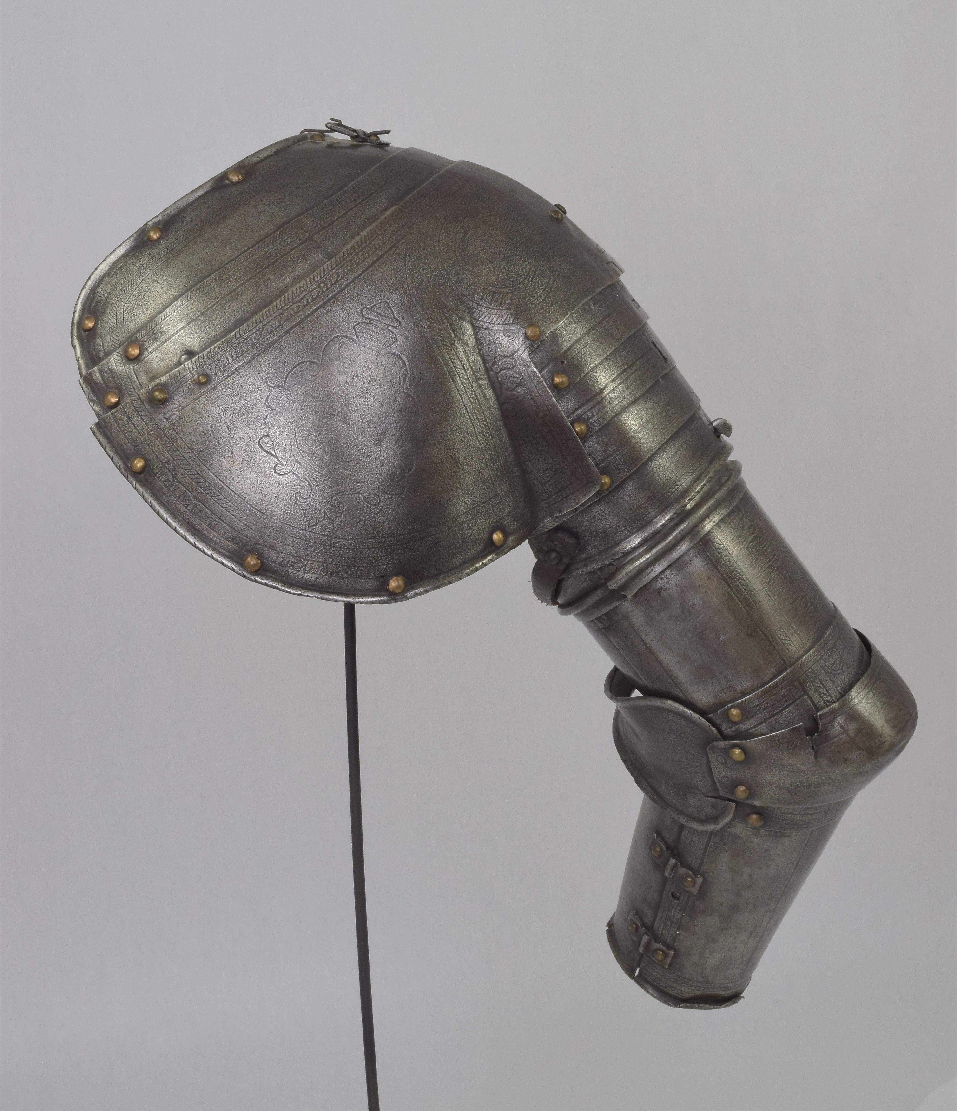 Etched in the 'Pisan' fashion. Separate pauldron and arm. For the right arm. Pauldron of 7 lames, 2 above and 4 below the large main plate (similar form and etching, but the right pauldron somewhat larger) The uper plates of the right pauldron are currently secured to the main plate by a rivet at the front and the back. Holes on the plates indicate that the second plate was originally secured to the main plate with a rivet at the back and leathers at the front and center. Outer edge of the main plates with inward turned and roped border. Bottom edge of the bottom lame turned n the same manner. Rectangular hole in the center of the bottom plate to engage a turning pin in the arm harness. Strap and buckle on the inside of the bottom lame to secure it to the pauldron. Arms formed of a tubular upper cannon with rotating collar, lower cannon of inner and outer plates attached by pairs of hinges at the back and a pin on the inner plate engaging a hole in the outer plate at the front, elbows of bracelet form joined at the back with rolled edges on the wing attached to the uper and lower cannons by one articulating lame.