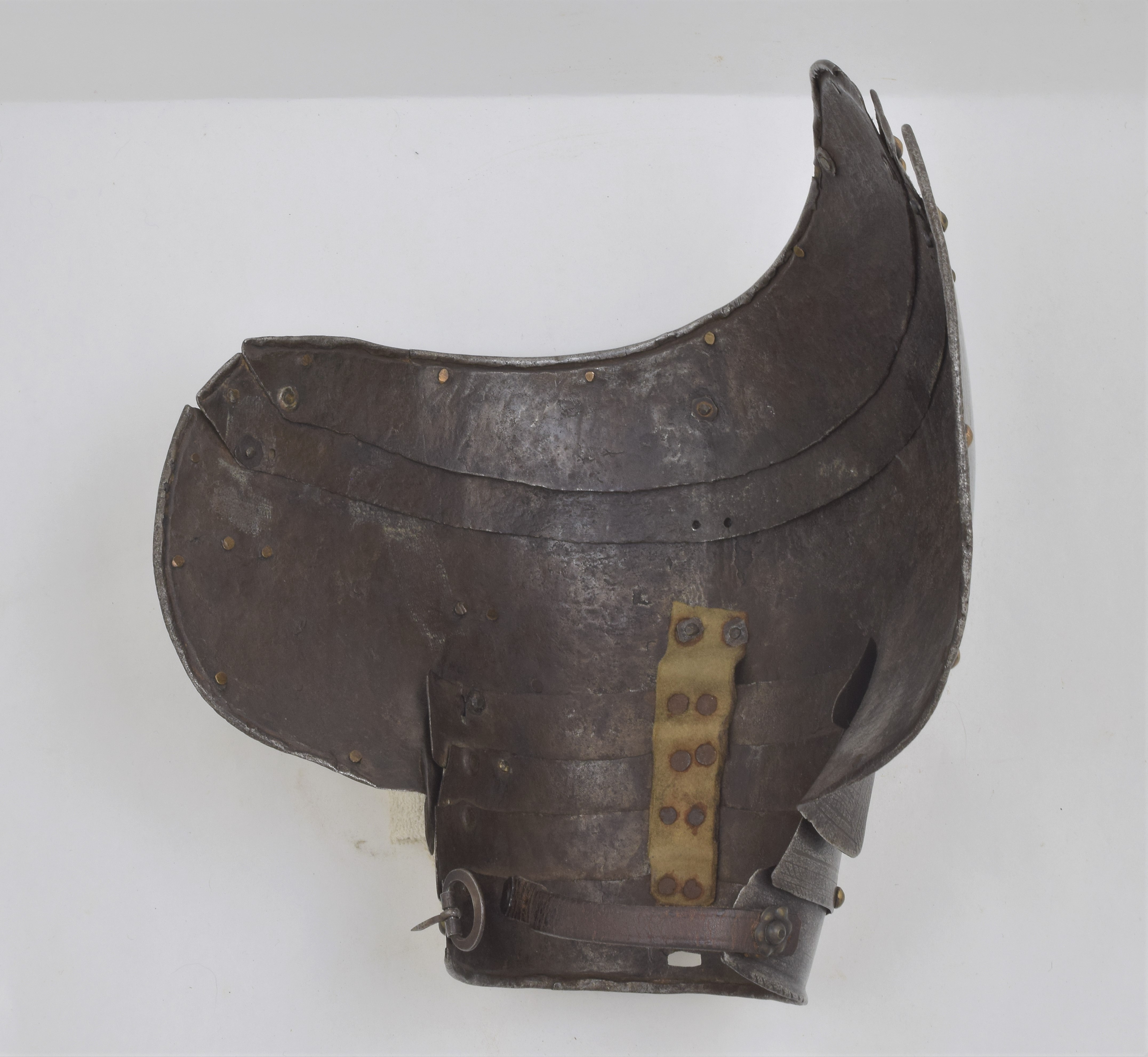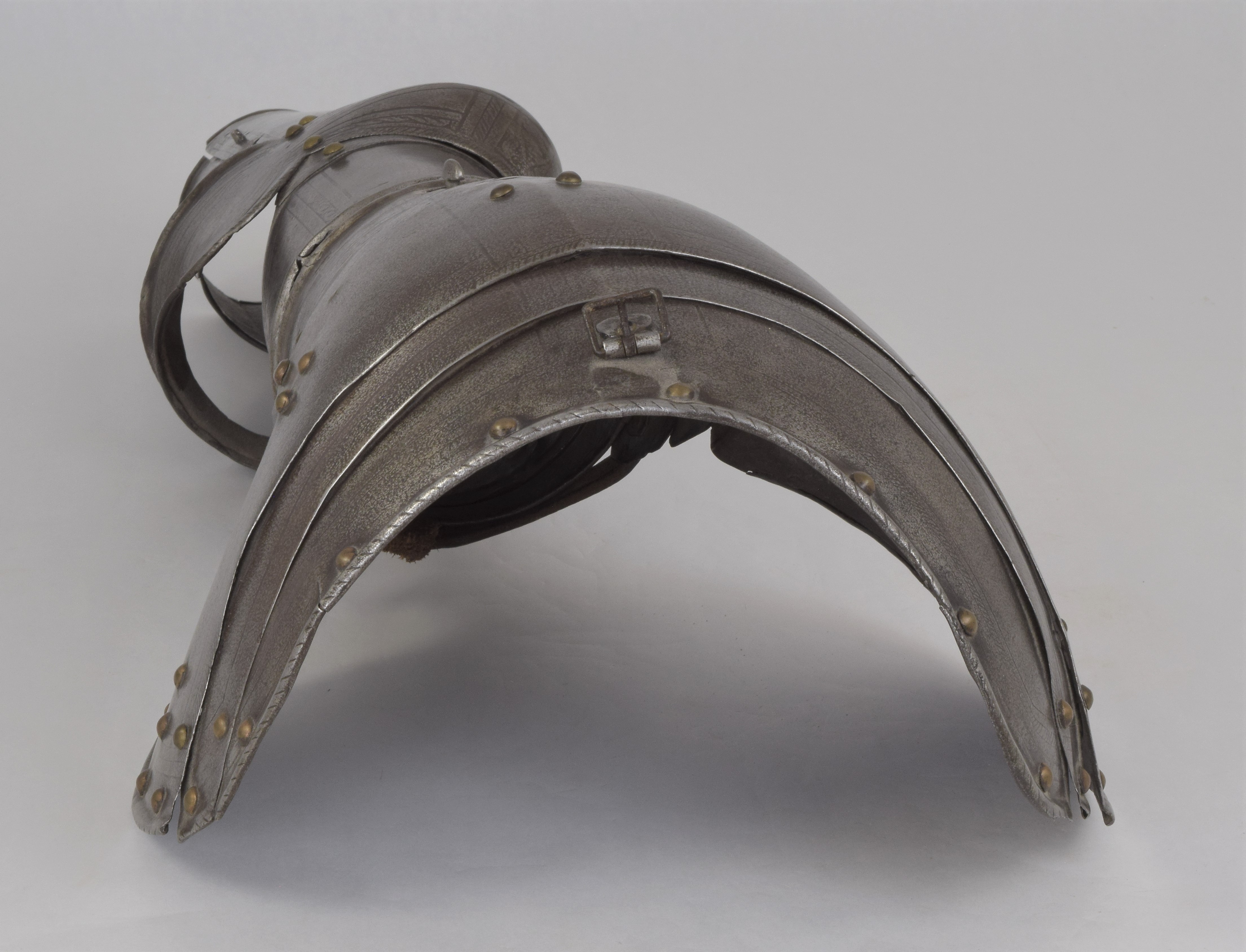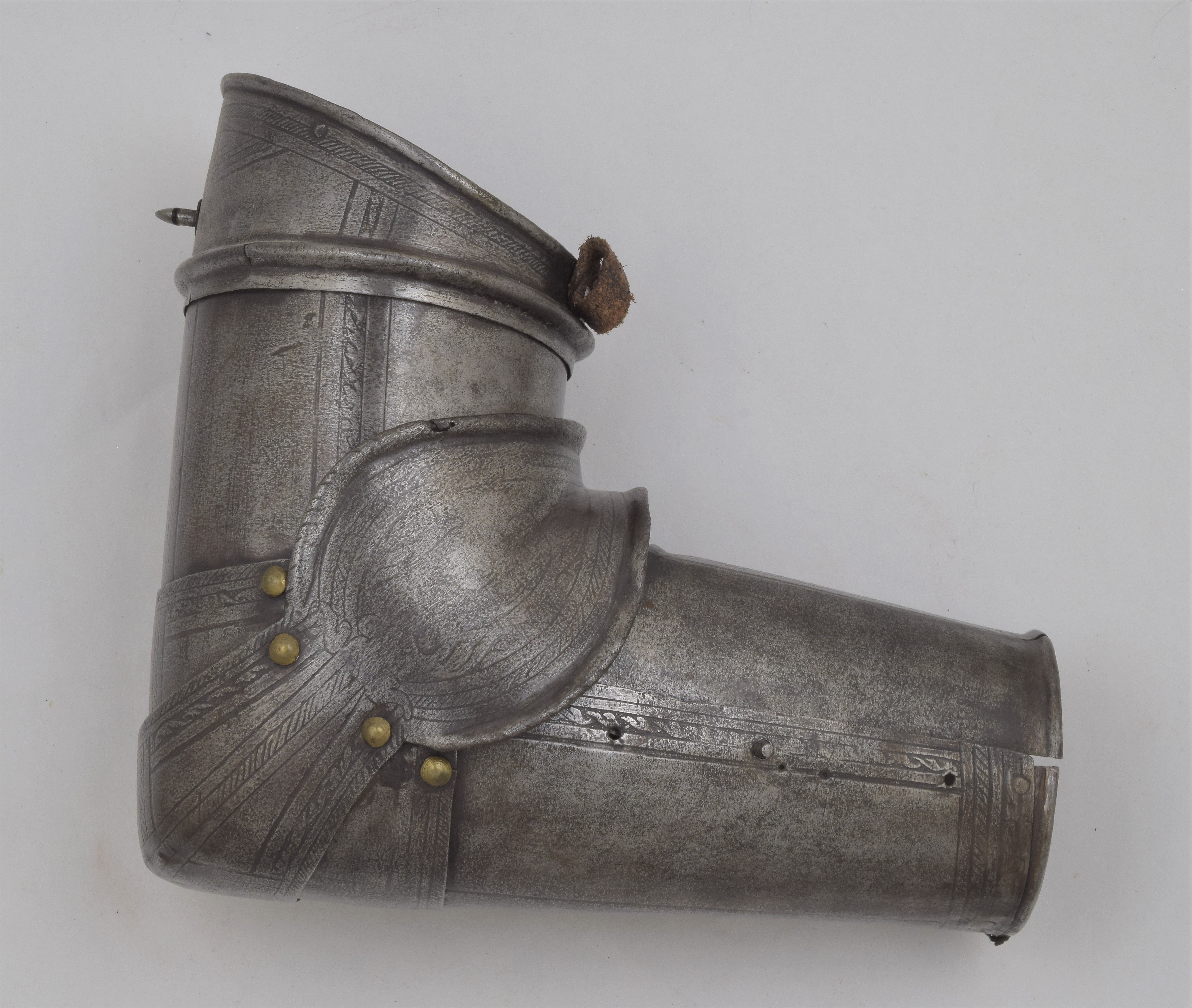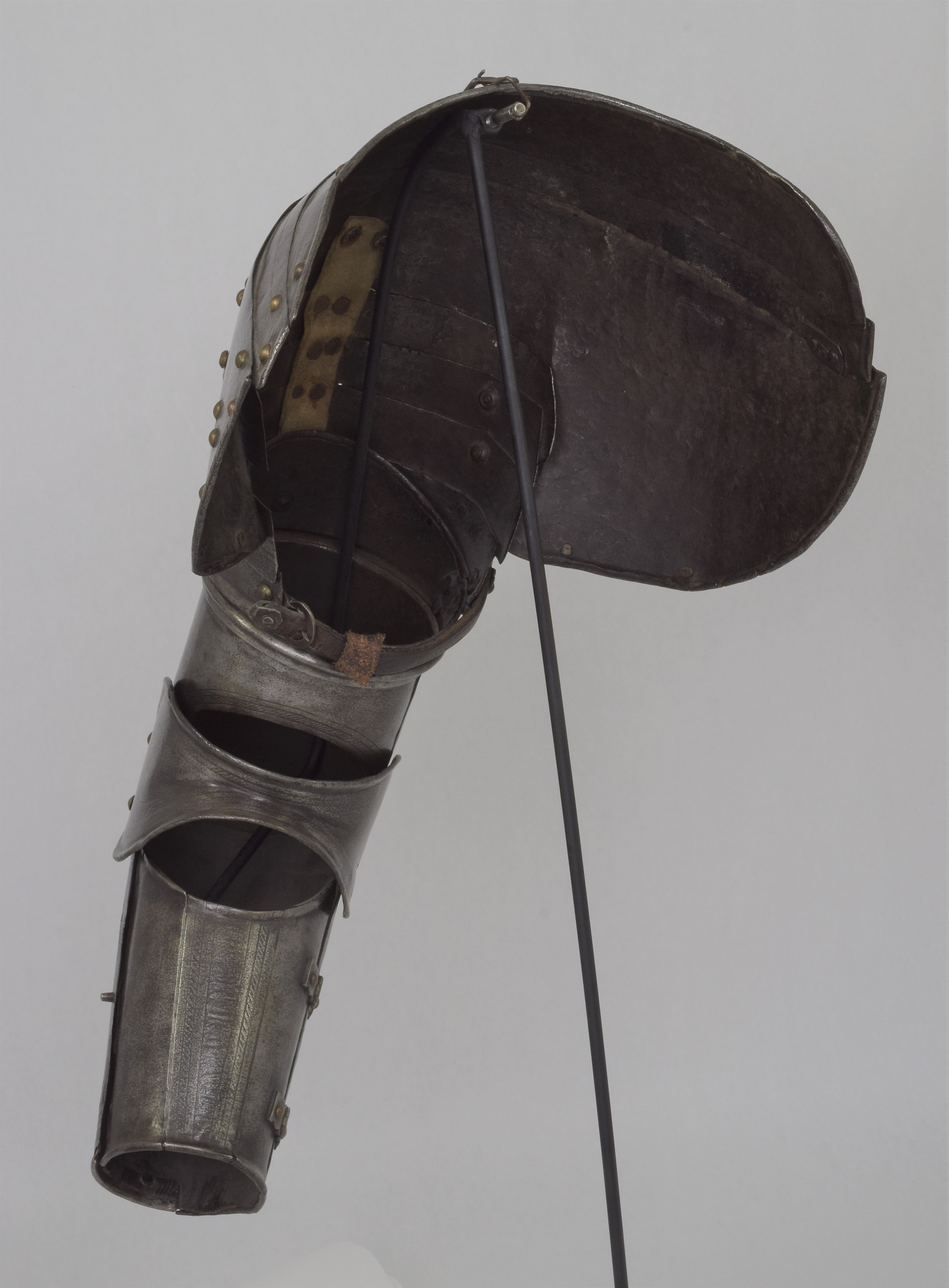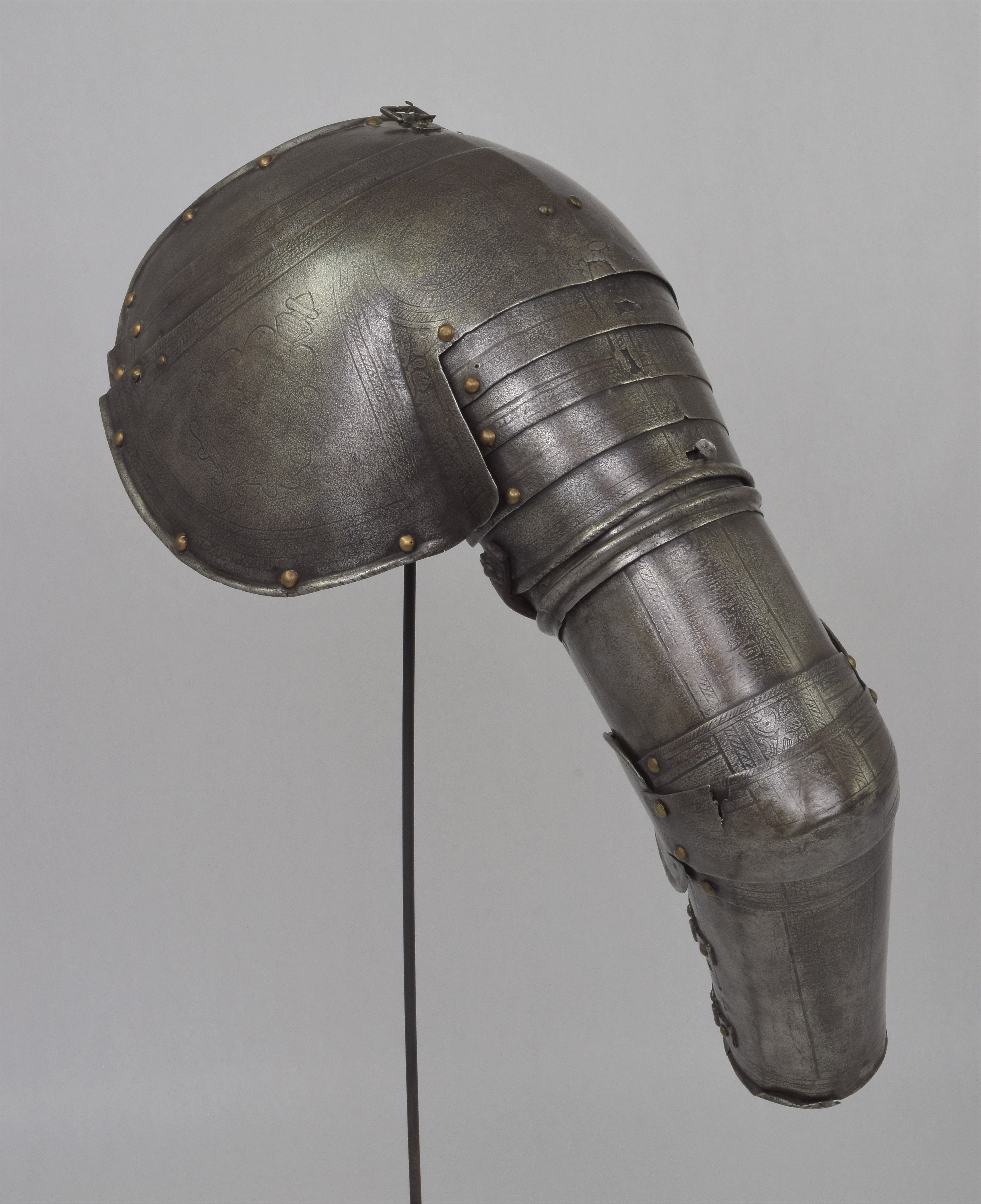 Etched in the 'Pisan' fashion. Separate pauldron and arm. For the right arm. Pauldron of 7 lames, 2 above and 4 below the large main plate (similar form and etching, but the right pauldron somewhat larger) The uper plates of the right pauldron are currently secured to the main plate by a rivet at the front and the back. Holes on the plates indicate that the second plate was originally secured to the main plate with a rivet at the back and leathers at the front and center. Outer edge of the main plates with inward turned and roped border. Bottom edge of the bottom lame turned n the same manner. Rectangular hole in the center of the bottom plate to engage a turning pin in the arm harness. Strap and buckle on the inside of the bottom lame to secure it to the pauldron. Arms formed of a tubular upper cannon with rotating collar, lower cannon of inner and outer plates attached by pairs of hinges at the back and a pin on the inner plate engaging a hole in the outer plate at the front, elbows of bracelet form joined at the back with rolled edges on the wing attached to the uper and lower cannons by one articulating lame.