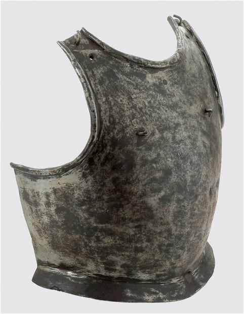Breastplate. Very heavy construction. Rounded form. Flare at the waist. Squared tapered outward rolls at the neck and arms. Holes for shoulder straps and turning hooks for use with plate covered shoulder straps like a trooper's breast in the 17th. century. 2 dents from bullet shots in the center left of the breast. The form and rolls are what you would expect of a breastplate of c. 1500. Weighs app 18 pounds. I know that I have seen a pile of similar breastplates that are associated with a group of 17th c. pieces. The weight, bullet marks and shoulder pin locations are reasonable for a 17th c. date. Outward turned rolls like this are very much not normal for the 17th c., but I have seen very heavy breastplates which are at least turned out. The square fom of the rolls is very odd. I don't see any reason to expect that this is a later piece, but attribution to a common type is difficult.