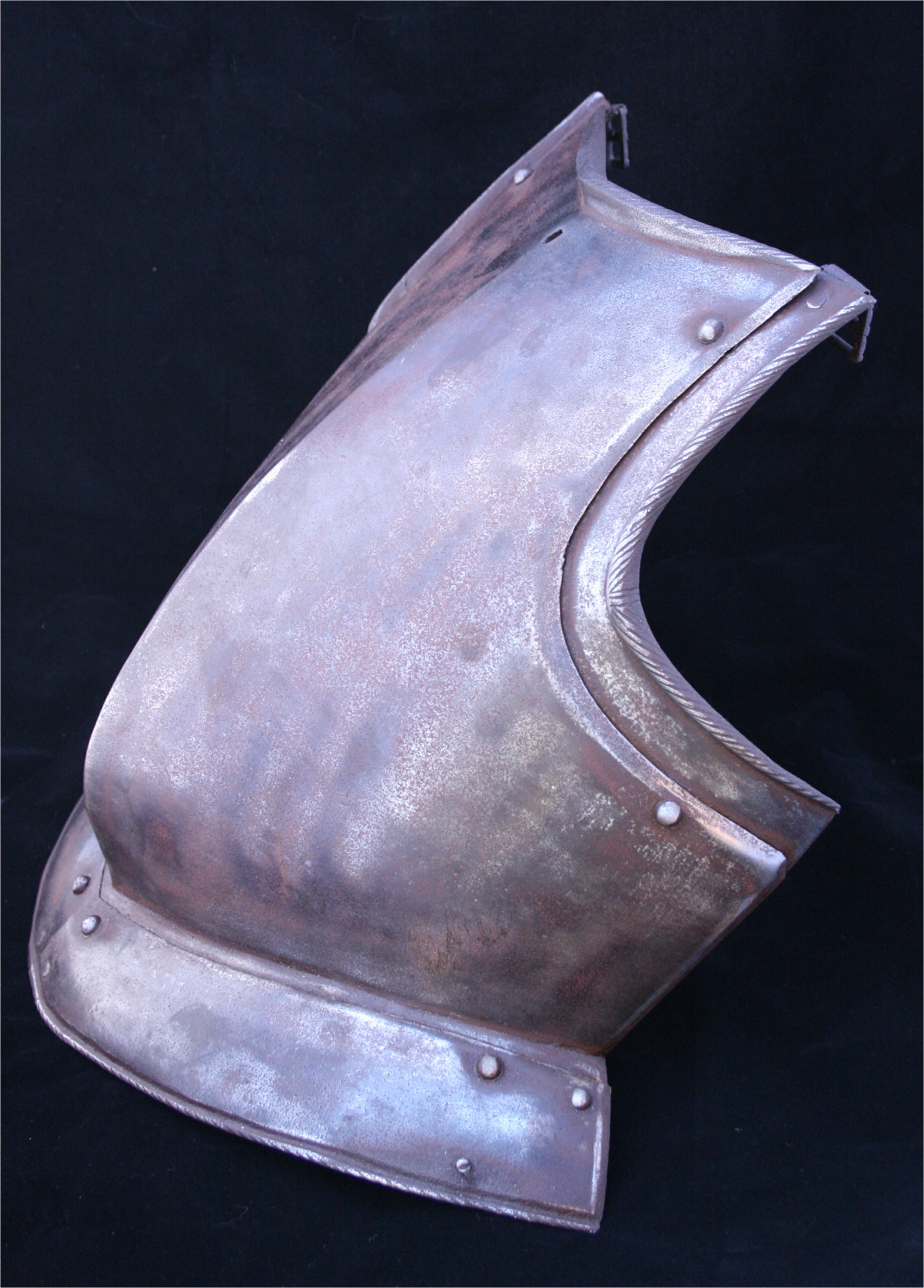 With a central crease drawn out to a rounded central point. There is a small rectangular hole near the center of the neck. This appears to be for securing the peg that would be used to secure the buff. The edges of the breastplate at the arm holes and sides are heavily beveled. Tapering inward-turned rolls at the neck and arms. Arms with sliding gussets. Gussets and upper roll with fine roping. Waist with a single lame fauld with turning pins at the sides for securing a removeable fauld. The single fauld lame has a roped roll a the bottom edge. The central hole at the neck and decorative style indicate that this is likely of Brunswick origin.