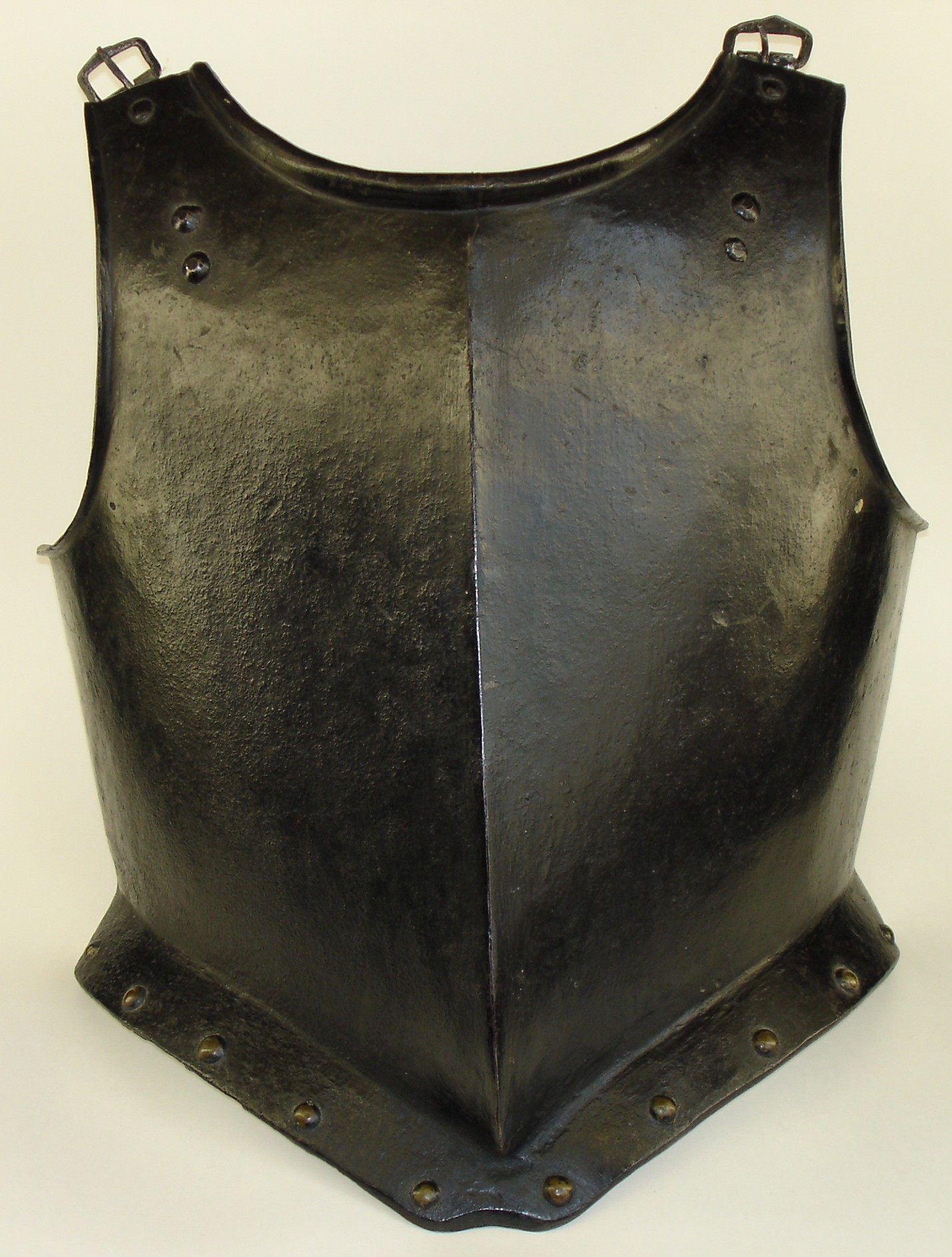 Black. Heavy shot proof. with good full-form pinched peascod. Full inward turn at the neck tapering toward the ends. Simple flares at the arms and flared at the waist. There are signs of delamination on the inside. Simple buckles at each shoulder. There are additional holes below the buckles which were likely used to secure the backplate in other configurations.