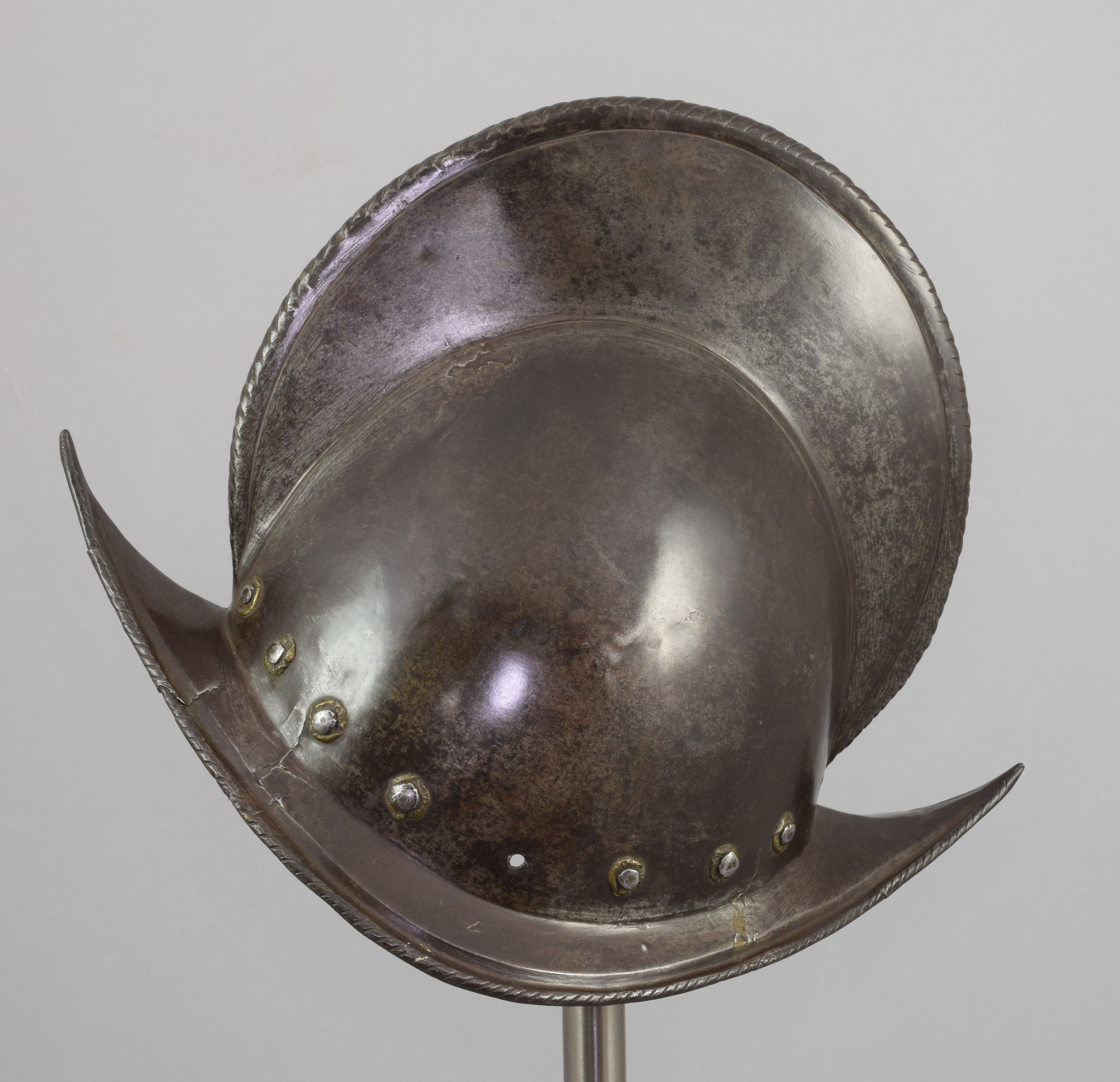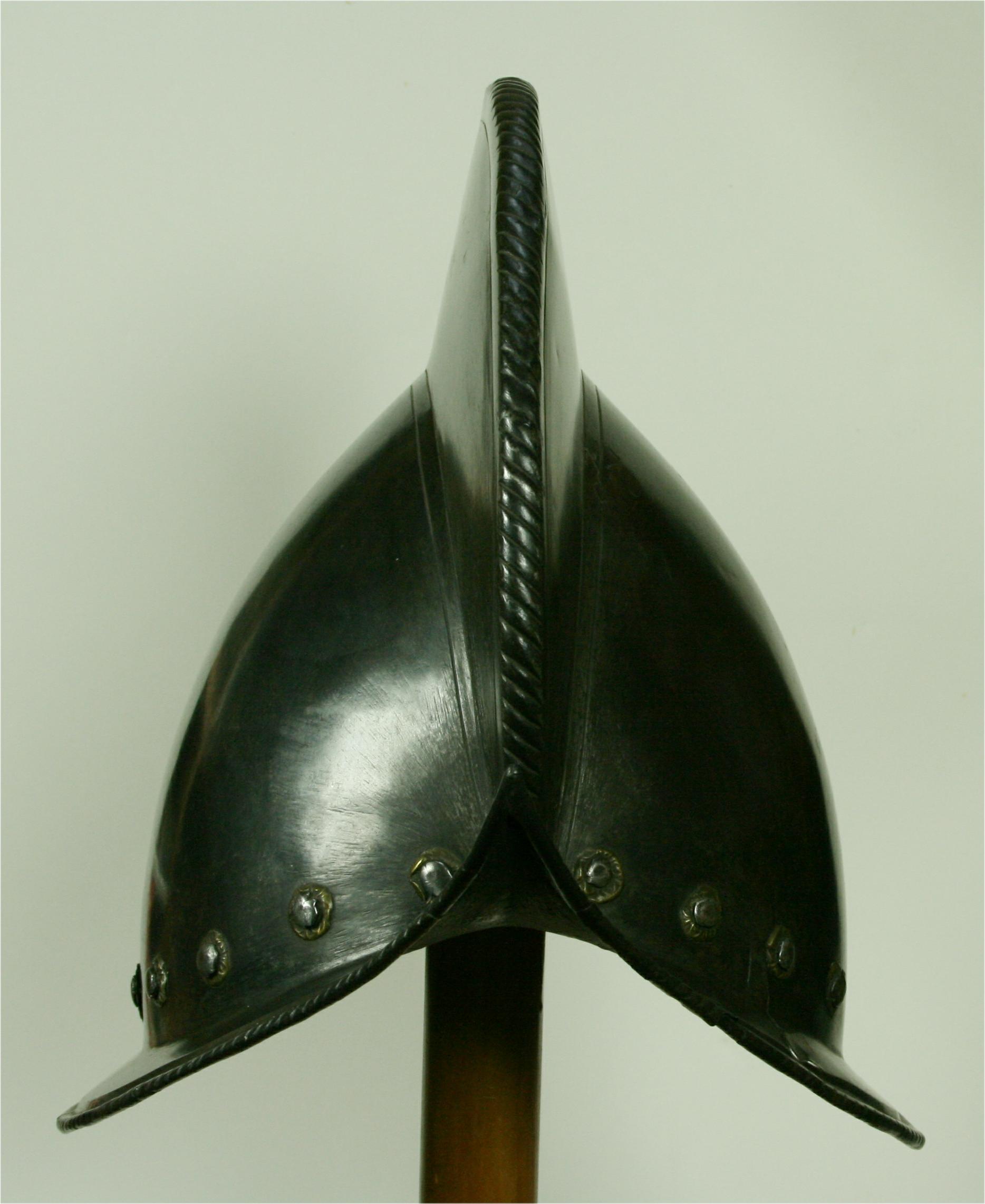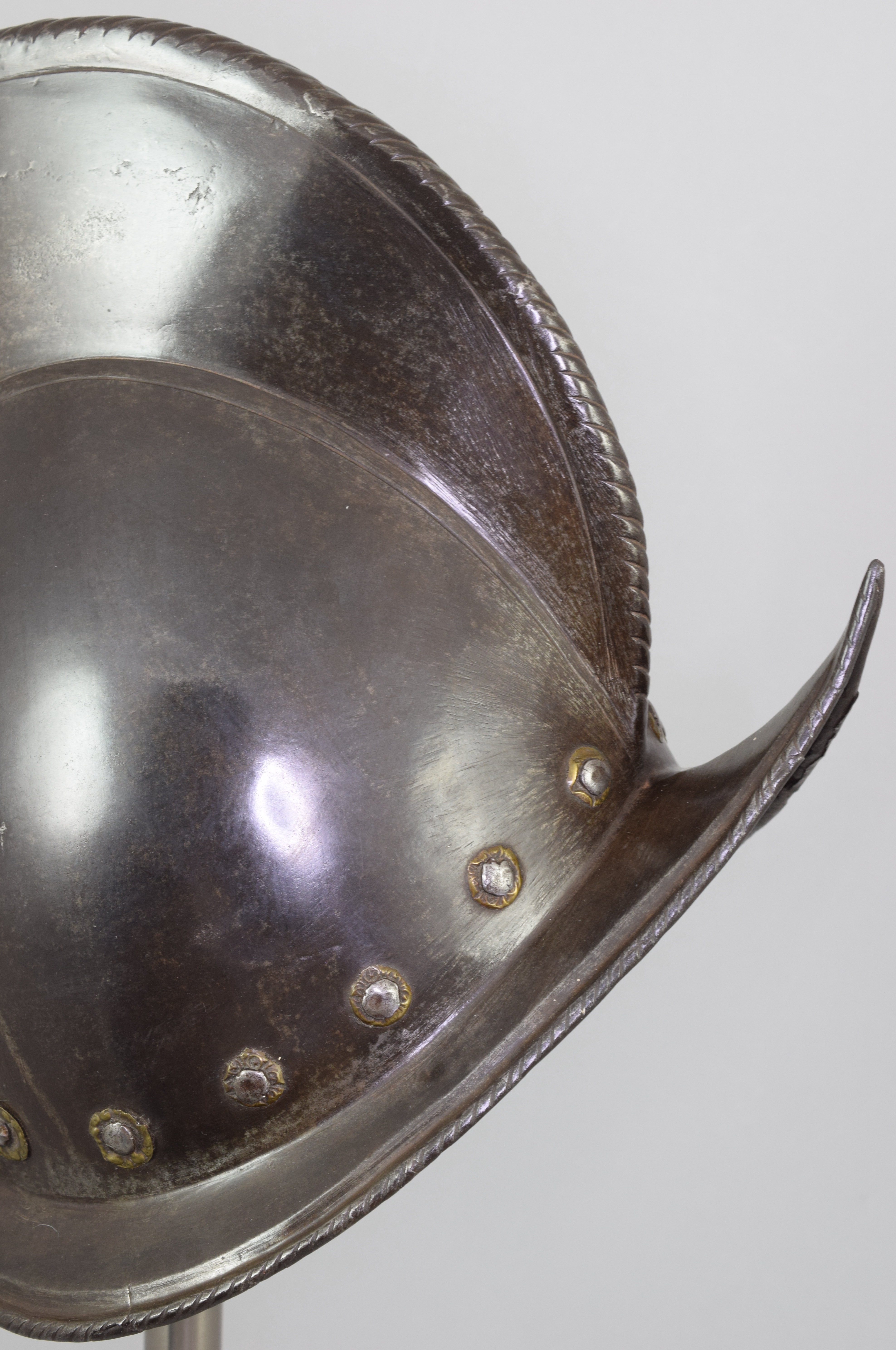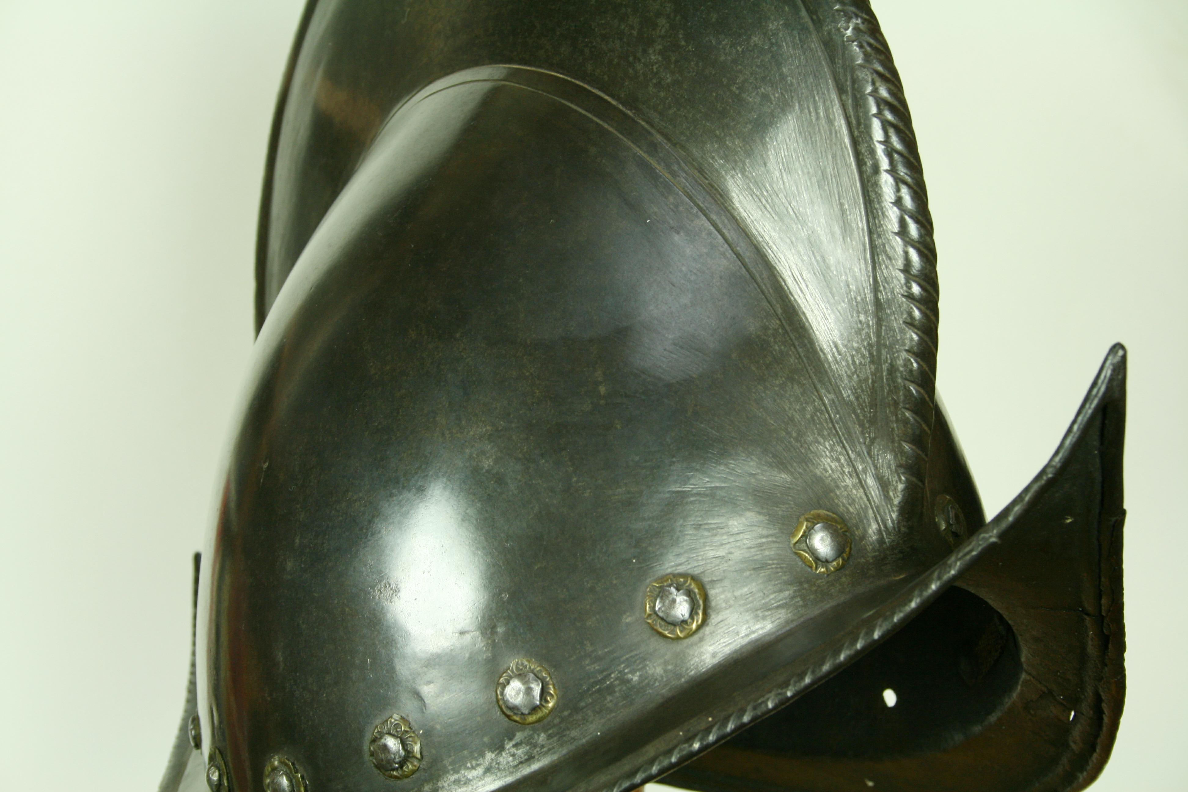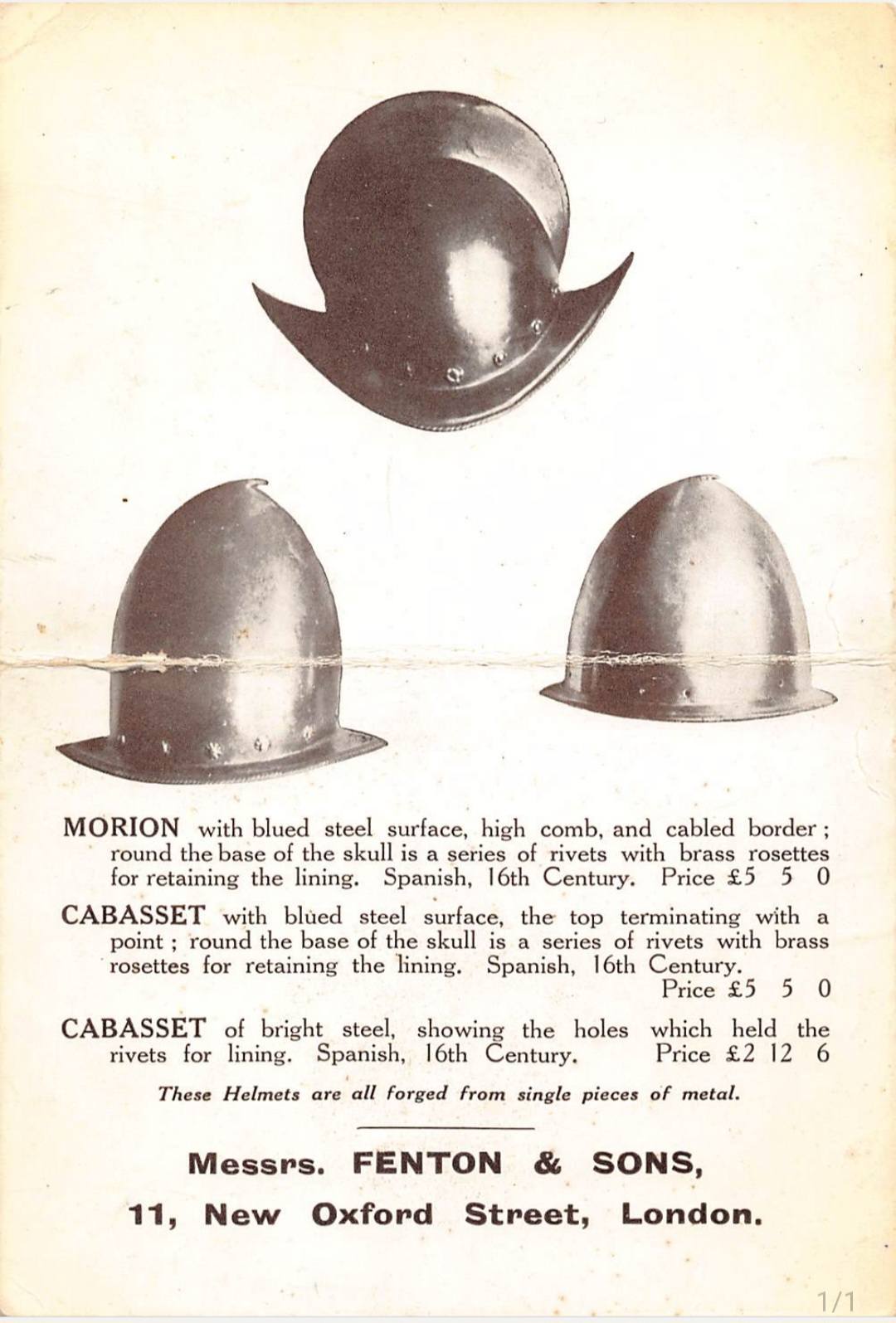 Made in Northern Italy. Finely formed in one piece with a hight roped comb and swept brim. The comb is broad at the base, tapering to a rounded top. The top of the crest is roped and there is an engraved line parallel to the top of the comb. The transition from the comb to bowl is accentuated with an engraved line at the crease and an additional engraved parallel line on the bowl. The edge of the brim is bordered by an inward-turned roped roll over wire and a narrow recess. It is uncommon in that it retains its original blued finish. The original finish covers a smooth finish over most of the surface with signs of file marks near the points of the skull and comb which would have been difficult to access with polishing wheels. The base of the skull with a row of iron lining rivets with decorative brass washers on the outside and small iron washers and remains of a cloth lining strap on the inside. This is a fine example of a group of morions and cabassets sold by Fenton and Sons of 11 New Oxford Street, London between the 2 world wars. I include a picture of an earlier advertisement for Fenton which appeared in "Academy Notes" - a journal published by the Royal Academy of Arts in 1898 and another advertisement that shows a similar morion. Others from the same source can be found in the Royal Armouries (IV. 449), Fitzwilliam Museum Cambridge (Hen. M.32, 33 and 34-1933) and Glasgow (The Real Fighting Stuff page 45). There are some small delaminations in the comb and some cracks in the brim.