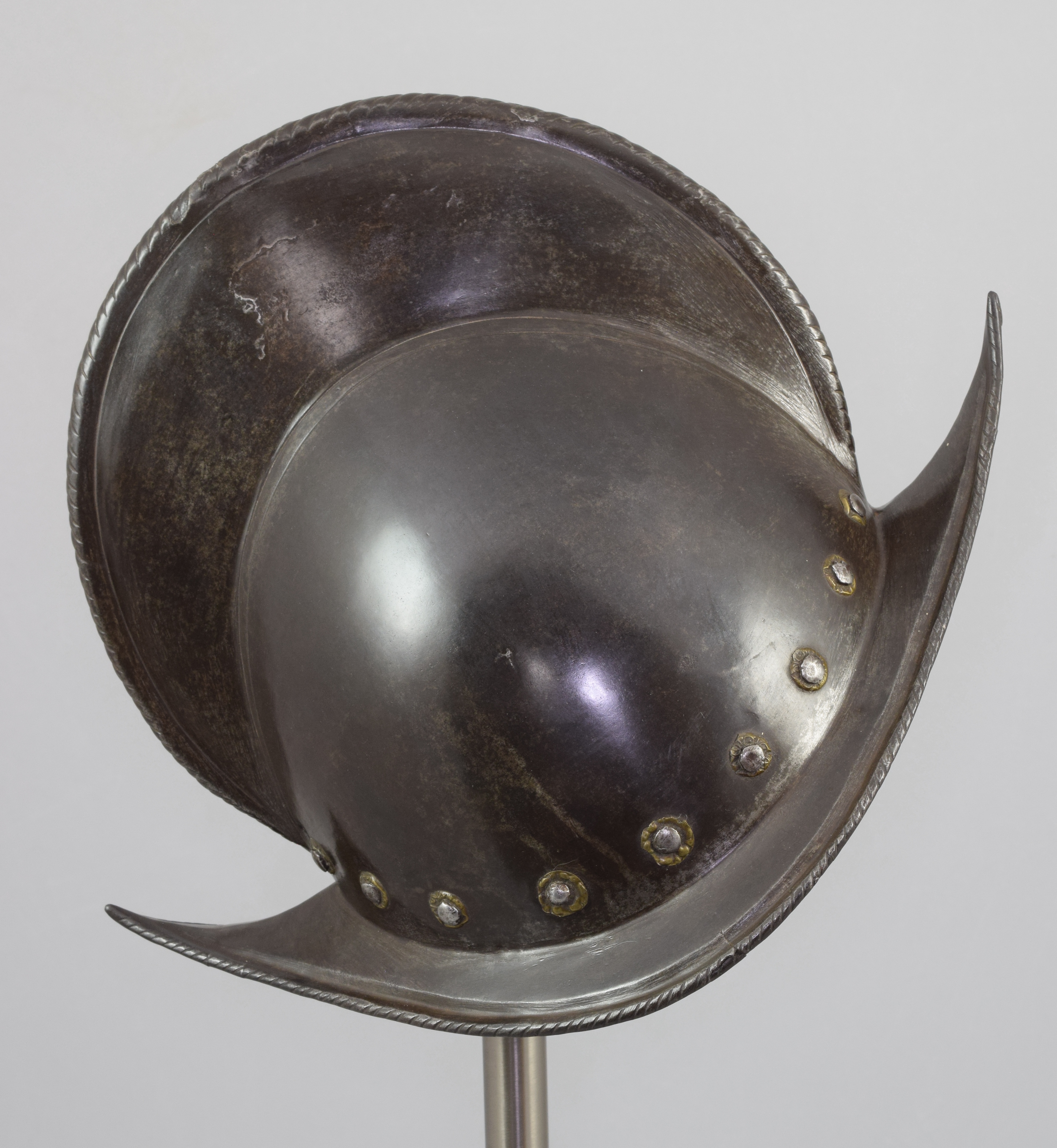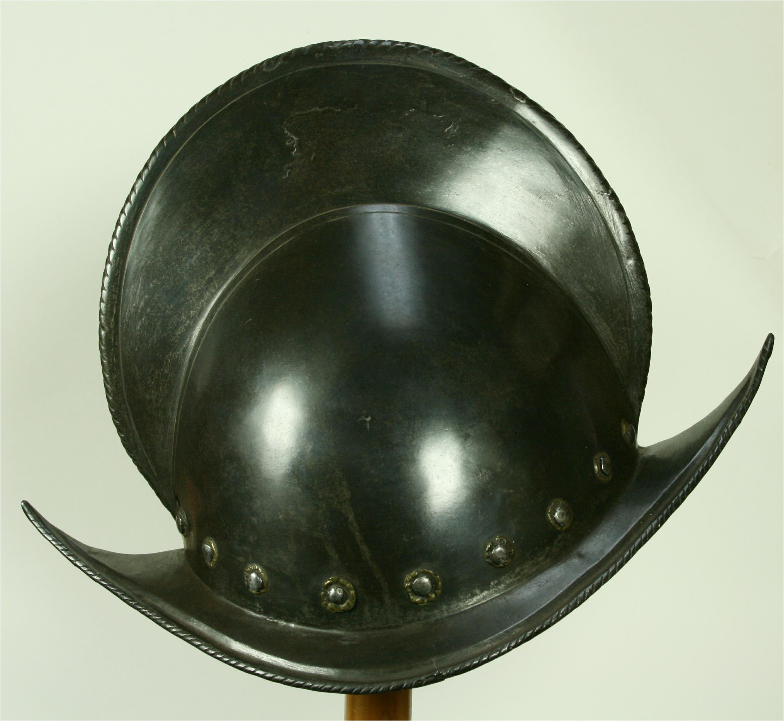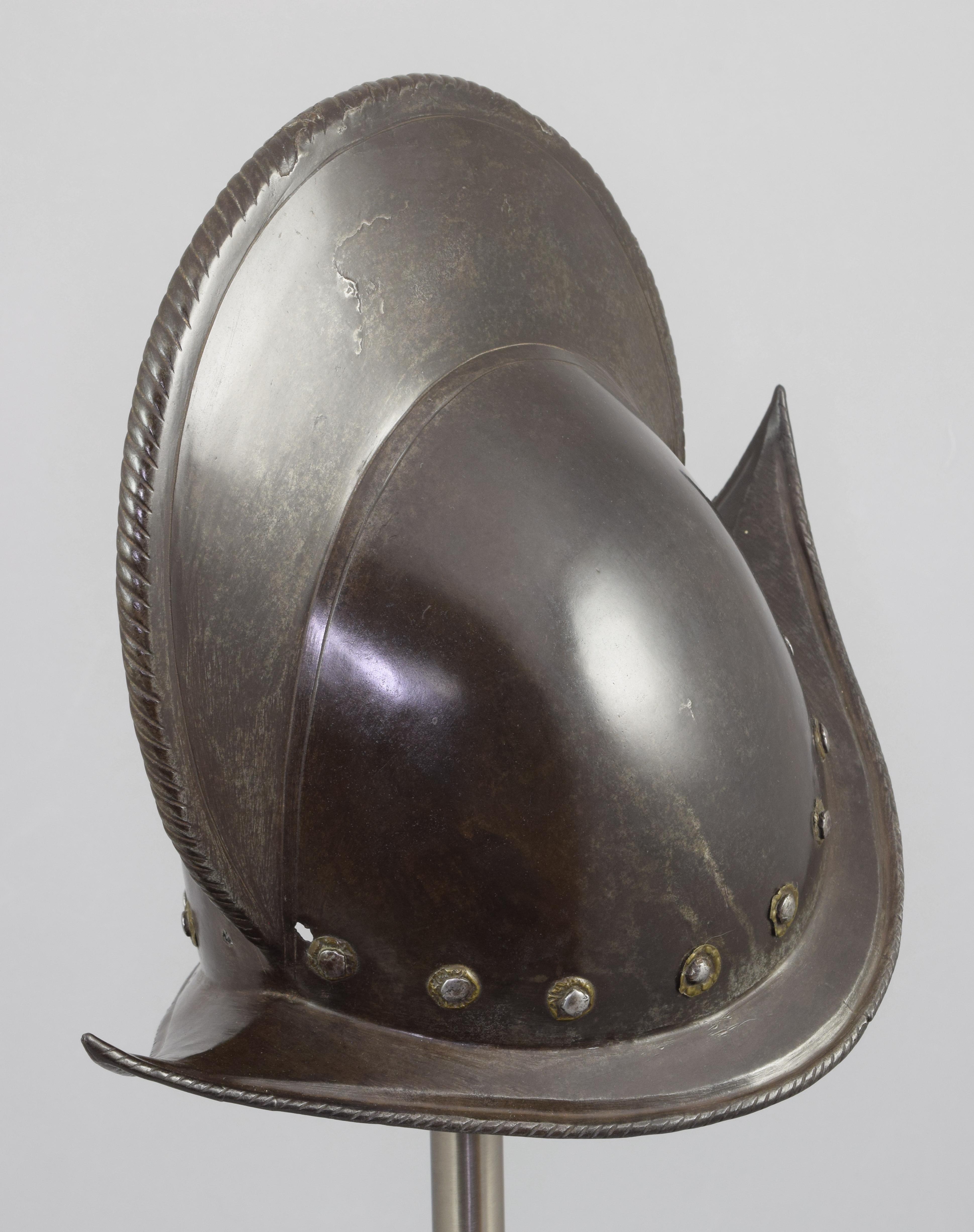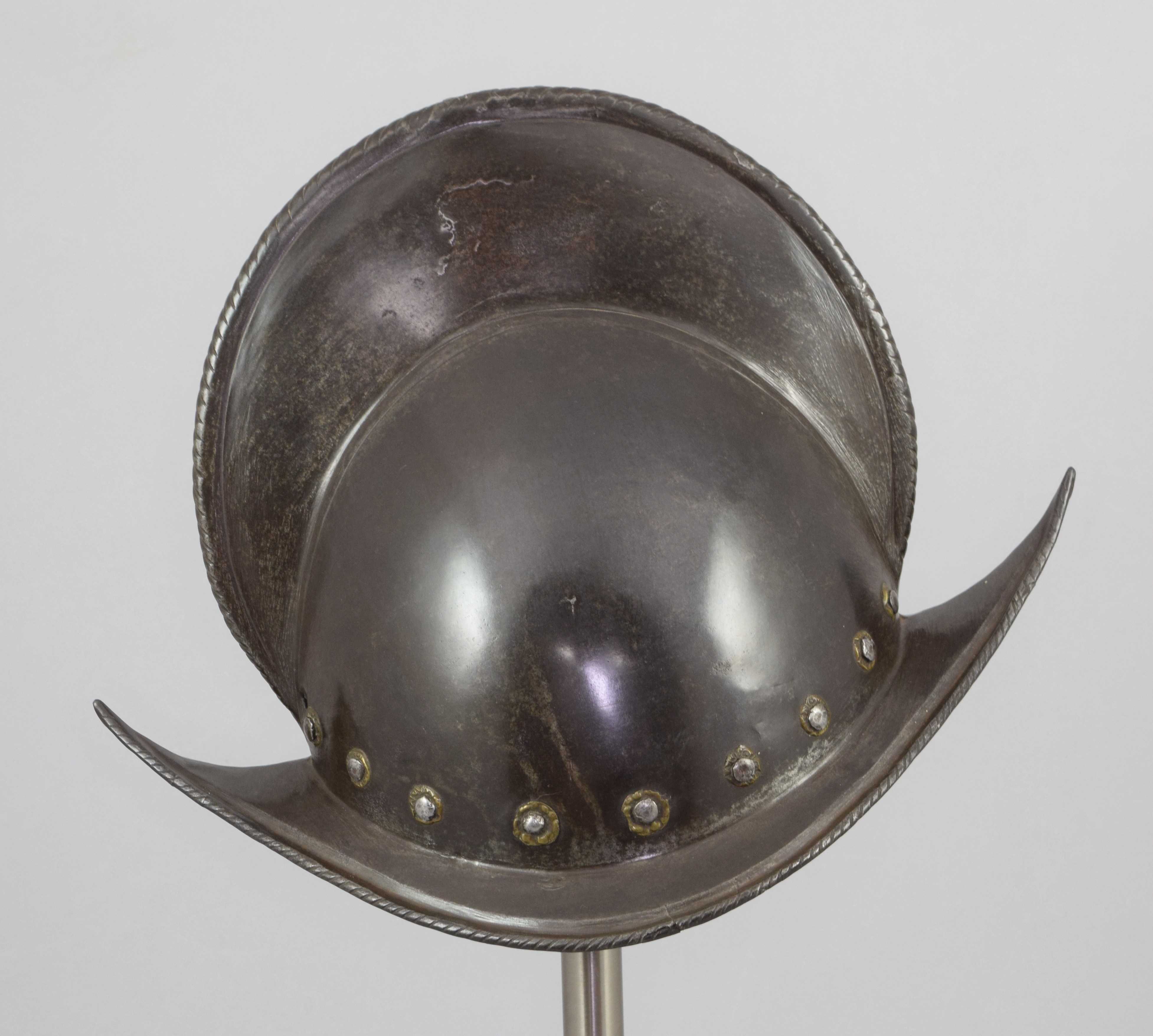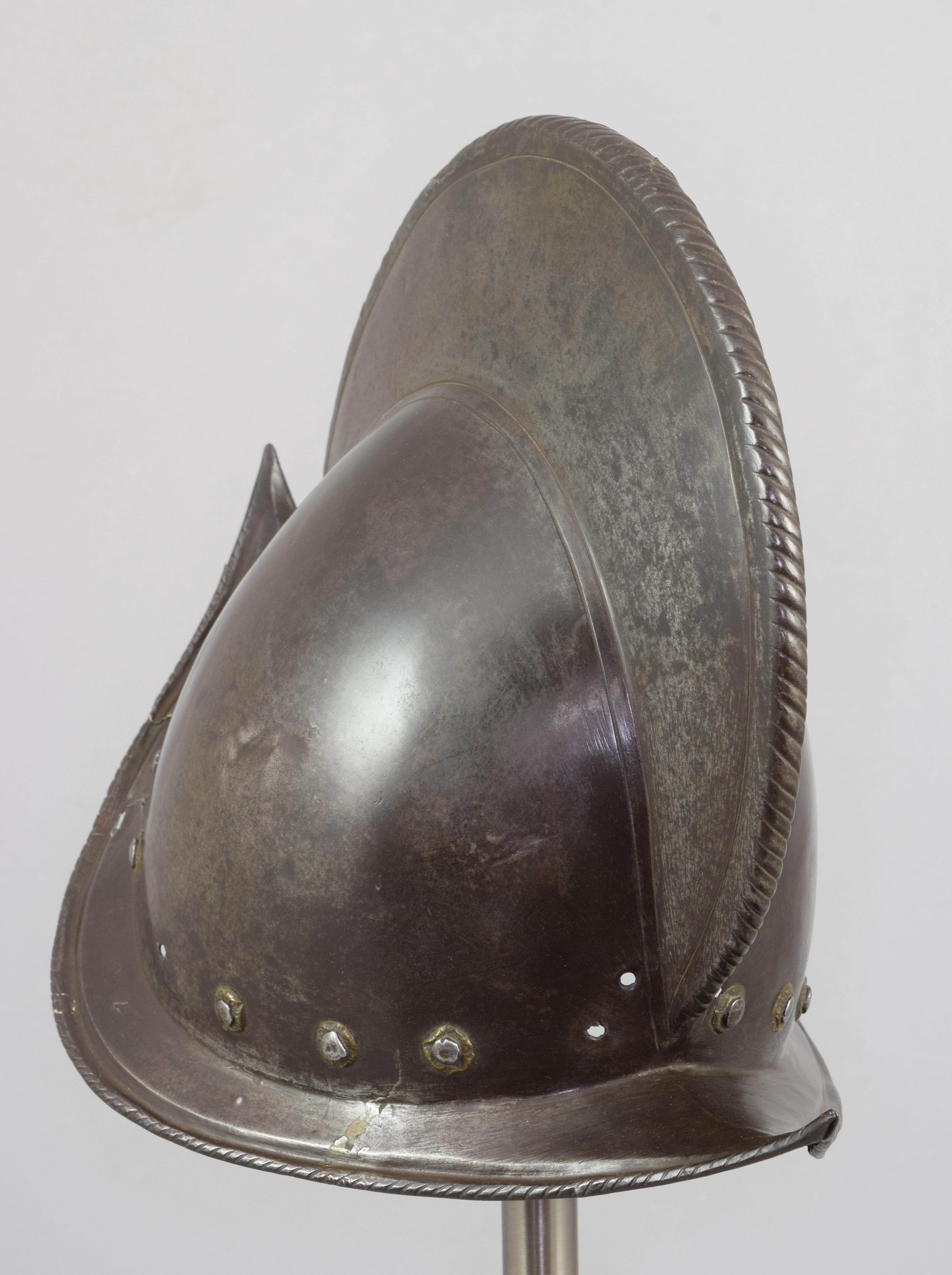 Made in Northern Italy. Finely formed in one piece with a hight roped comb and swept brim. The comb is broad at the base, tapering to a rounded top. The top of the crest is roped and there is an engraved line parallel to the top of the comb. The transition from the comb to bowl is accentuated with an engraved line at the crease and an additional engraved parallel line on the bowl. The edge of the brim is bordered by an inward-turned roped roll over wire and a narrow recess. It is uncommon in that it retains its original blued finish. The original finish covers a smooth finish over most of the surface with signs of file marks near the points of the skull and comb which would have been difficult to access with polishing wheels. The base of the skull with a row of iron lining rivets with decorative brass washers on the outside and small iron washers and remains of a cloth lining strap on the inside. This is a fine example of a group of morions and cabassets sold by Fenton and Sons of 11 New Oxford Street, London between the 2 world wars. I include a picture of an earlier advertisement for Fenton which appeared in "Academy Notes" - a journal published by the Royal Academy of Arts in 1898 and another advertisement that shows a similar morion. Others from the same source can be found in the Royal Armouries (IV. 449), Fitzwilliam Museum Cambridge (Hen. M.32, 33 and 34-1933) and Glasgow (The Real Fighting Stuff page 45). There are some small delaminations in the comb and some cracks in the brim.
