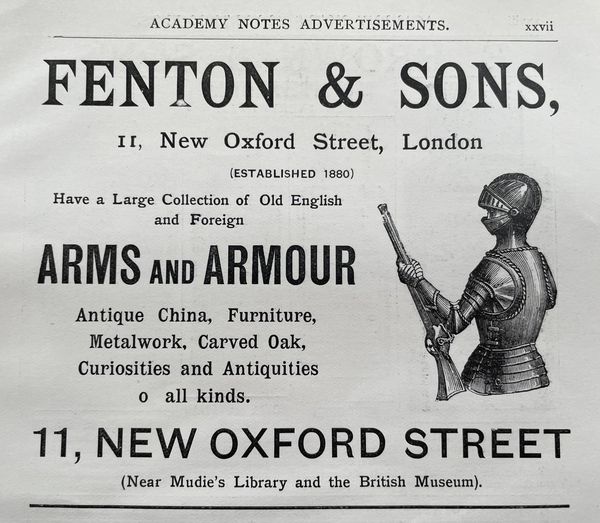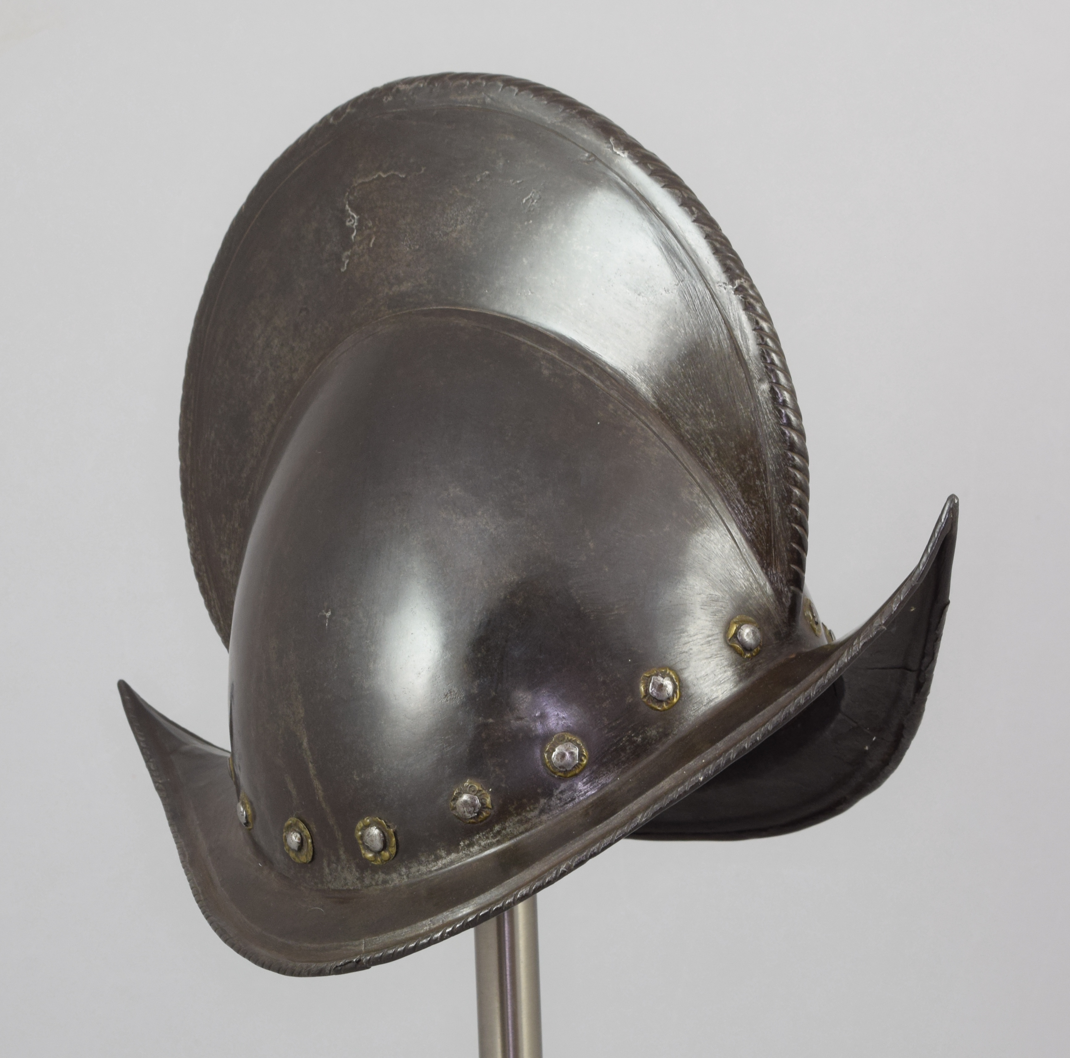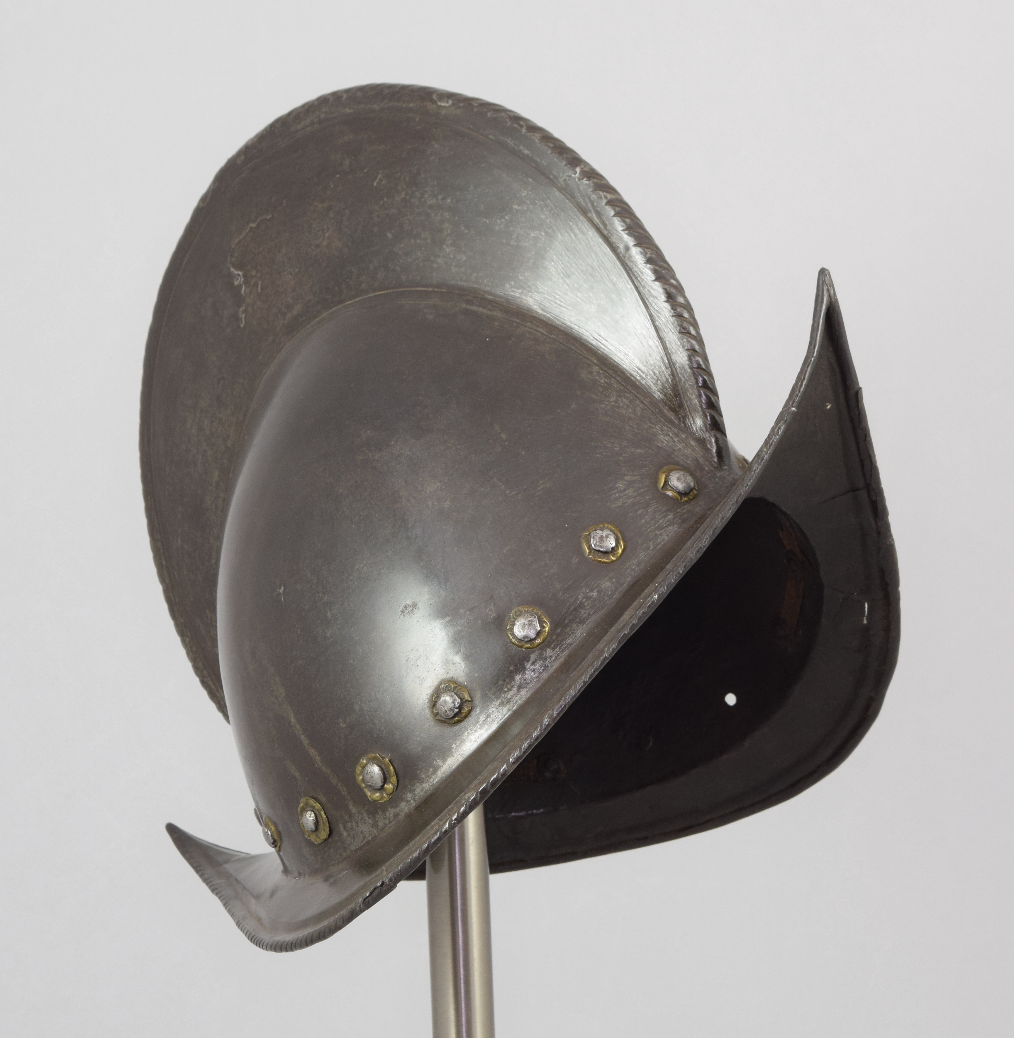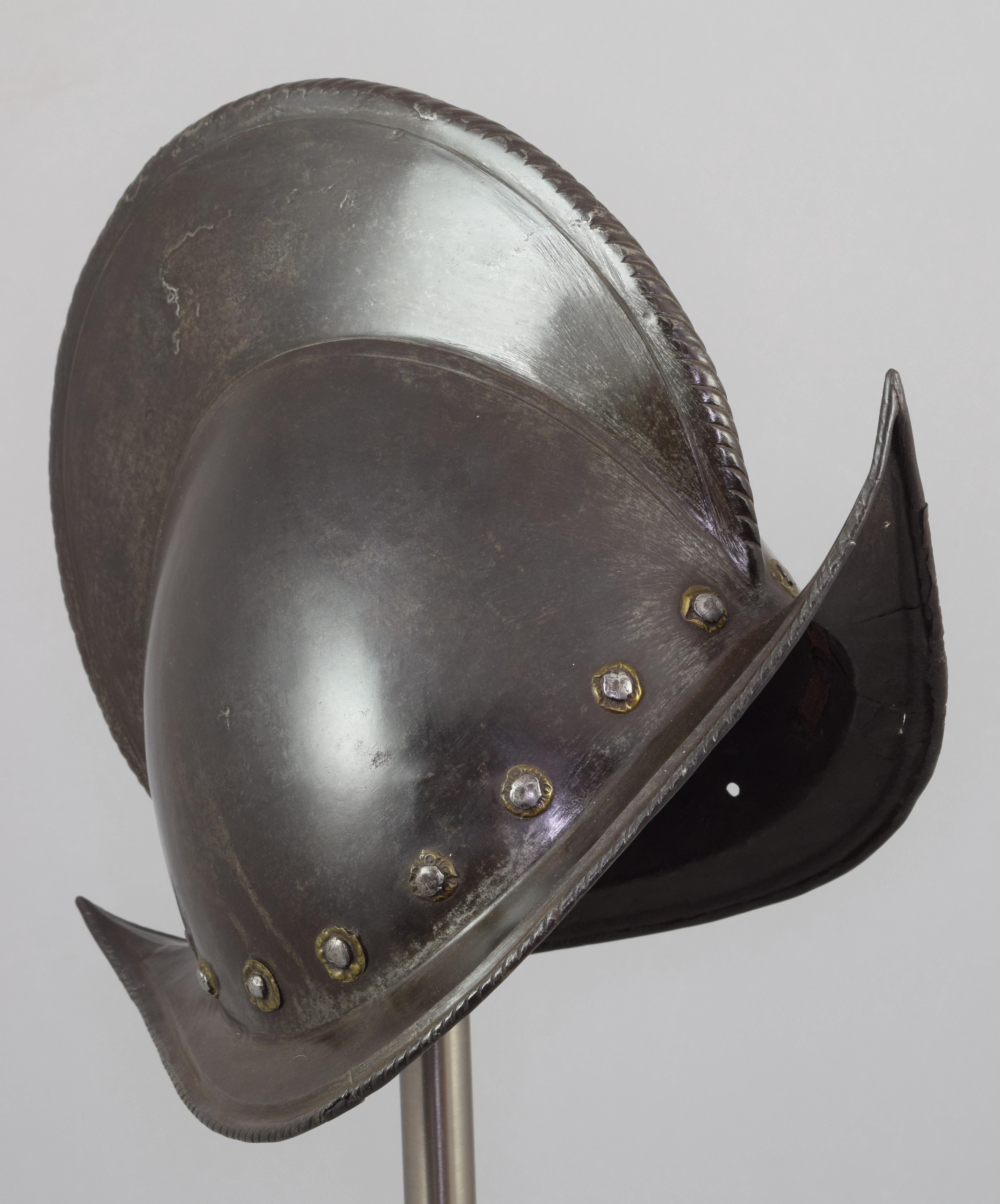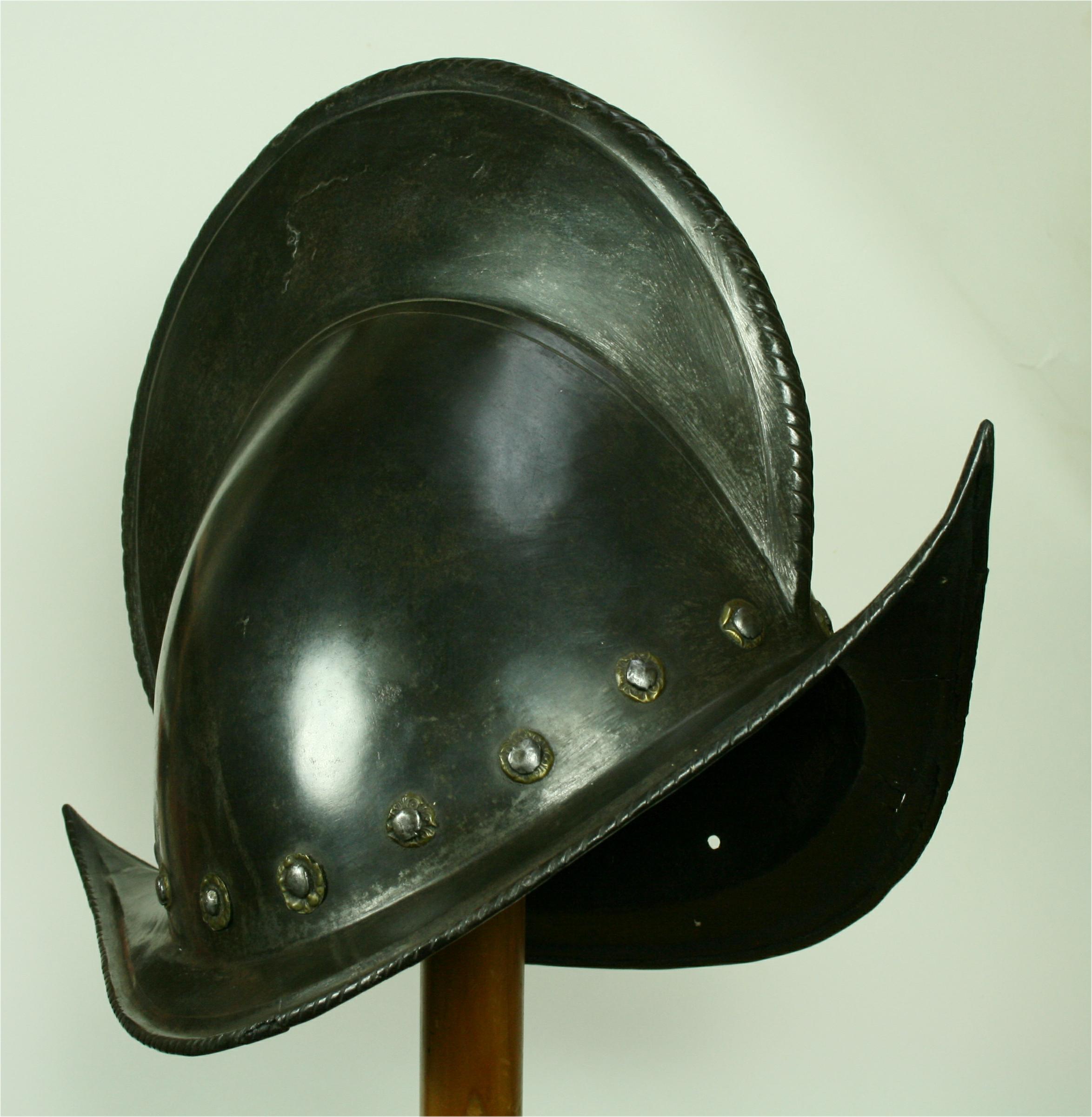 Made in Northern Italy. Finely formed in one piece with a hight roped comb and swept brim. The comb is broad at the base, tapering to a rounded top. The top of the crest is roped and there is an engraved line parallel to the top of the comb. The transition from the comb to bowl is accentuated with an engraved line at the crease and an additional engraved parallel line on the bowl. The edge of the brim is bordered by an inward-turned roped roll over wire and a narrow recess. It is uncommon in that it retains its original blued finish. The original finish covers a smooth finish over most of the surface with signs of file marks near the points of the skull and comb which would have been difficult to access with polishing wheels. The base of the skull with a row of iron lining rivets with decorative brass washers on the outside and small iron washers and remains of a cloth lining strap on the inside. This is a fine example of a group of morions and cabassets sold by Fenton and Sons of 11 New Oxford Street, London between the 2 world wars. I include a picture of an earlier advertisement for Fenton which appeared in "Academy Notes" - a journal published by the Royal Academy of Arts in 1898 and another advertisement that shows a similar morion. Others from the same source can be found in the Royal Armouries (IV. 449), Fitzwilliam Museum Cambridge (Hen. M.32, 33 and 34-1933) and Glasgow (The Real Fighting Stuff page 45). There are some small delaminations in the comb and some cracks in the brim.