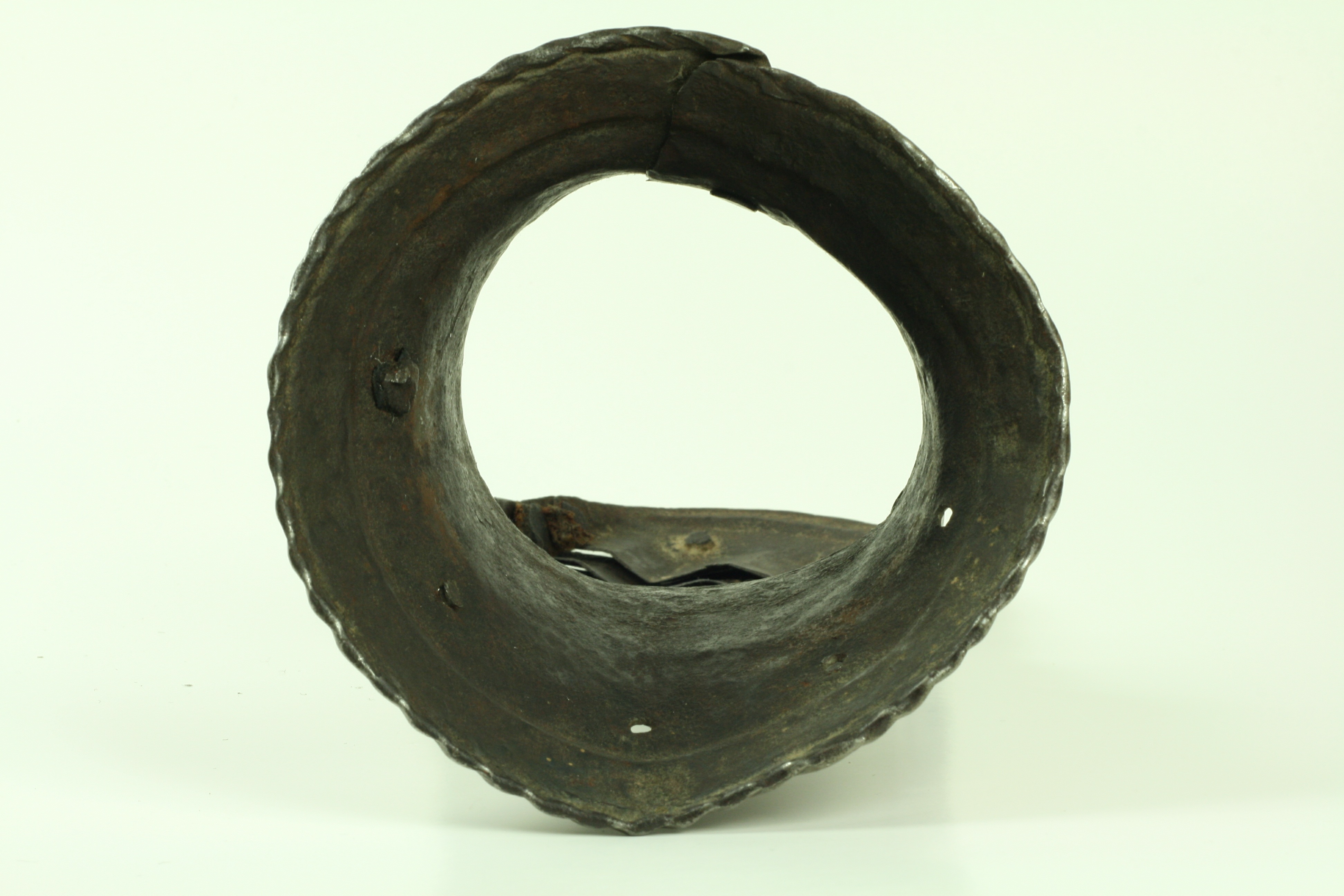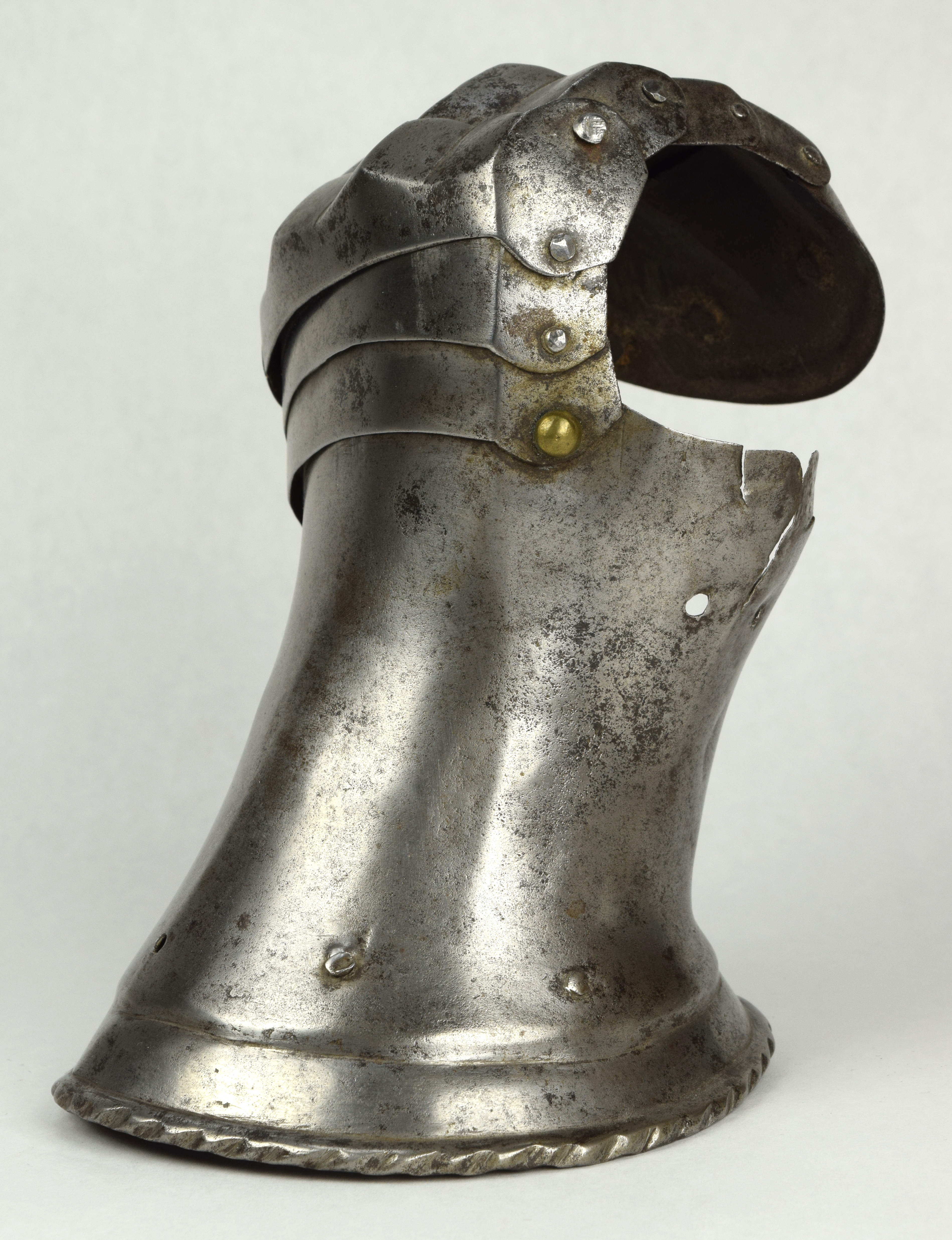 One piece cuff flaring from the wrist. Outer edge with an inward-turned, roped roll with a parallel recessed band. Central crease in the cuff. The main plate extends to cover half of the back of the hand and over the base of the thumb. The remainder of the back of the hand covered by 2 plates. The back of hand creased at the corners and at the center of the base of the thumb. Fingers covered by four plates, joined to the back of hand by a knuckle rider. The front of the knuckle rider and the fingers with fluted creases over the fingers. The end of the final finger plate with a hollow inward partial turn. The base line between the fingers accented by engraved lines. The ends of the plates are decorated with a filed notch on the end opposite the thumb. The thumb area is cracked. The form of the cracks and stiffness indicate it may have been tempered. Some original rivets remain, some replaced. The rivets on the terminal plate, articulation rivets between the last 3 plates, two of the metacarpal lame rivets, two rivets for securing the glove to the cuff and one of the rivets securing the inside of the wrist appear original. There are some small remains of fabric under some of the rivet heads. These appear to have been used to secure the glove.