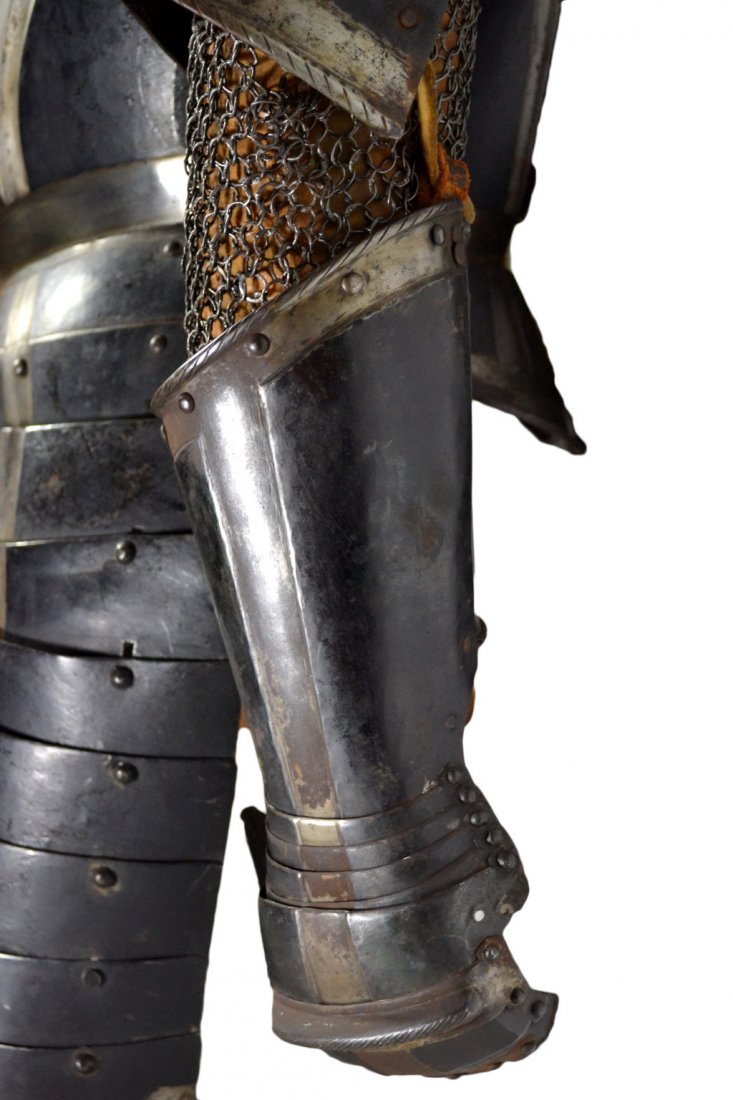 German. Nuremberg. Cuffs formed from two plates, back of hand covered by five plates, a knuckle rider and short mittens of two plates. The gauntlets are decorated with a central recessed band without a central crease. The border of the cuff is bordered by a recessed border and an inward turned rolled and roped border. The thumbs are protected by one main plate over the base of the thumb and three small scales over the thumb. They are currently secured to the metacarpal plates by a later leather. The gauntlets are nearly a pair. The right gauntlet has a rubbed mark in the recess of the cuff and signs of part of another one. The left gauntlet appears to have an associated inner cuff plate.