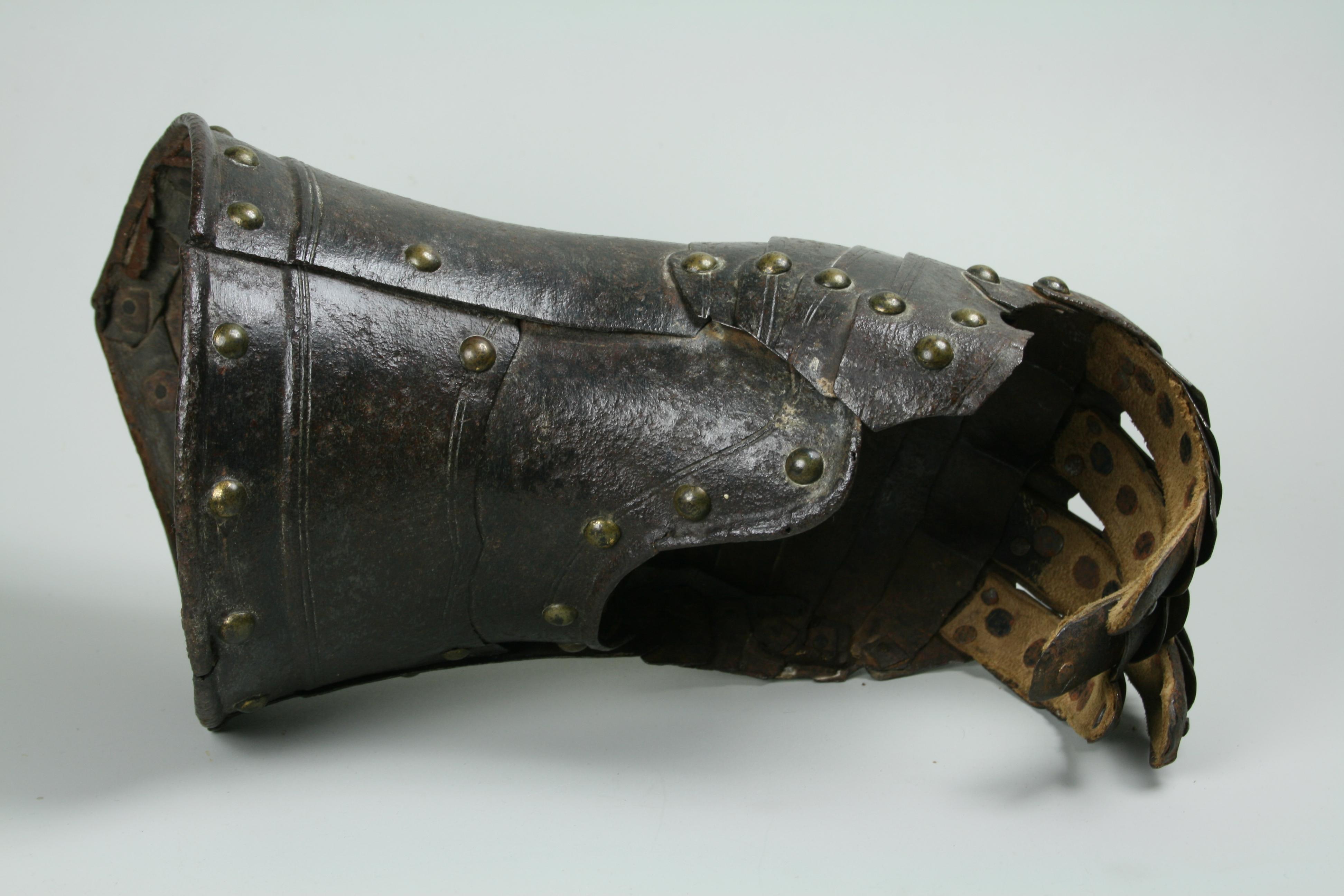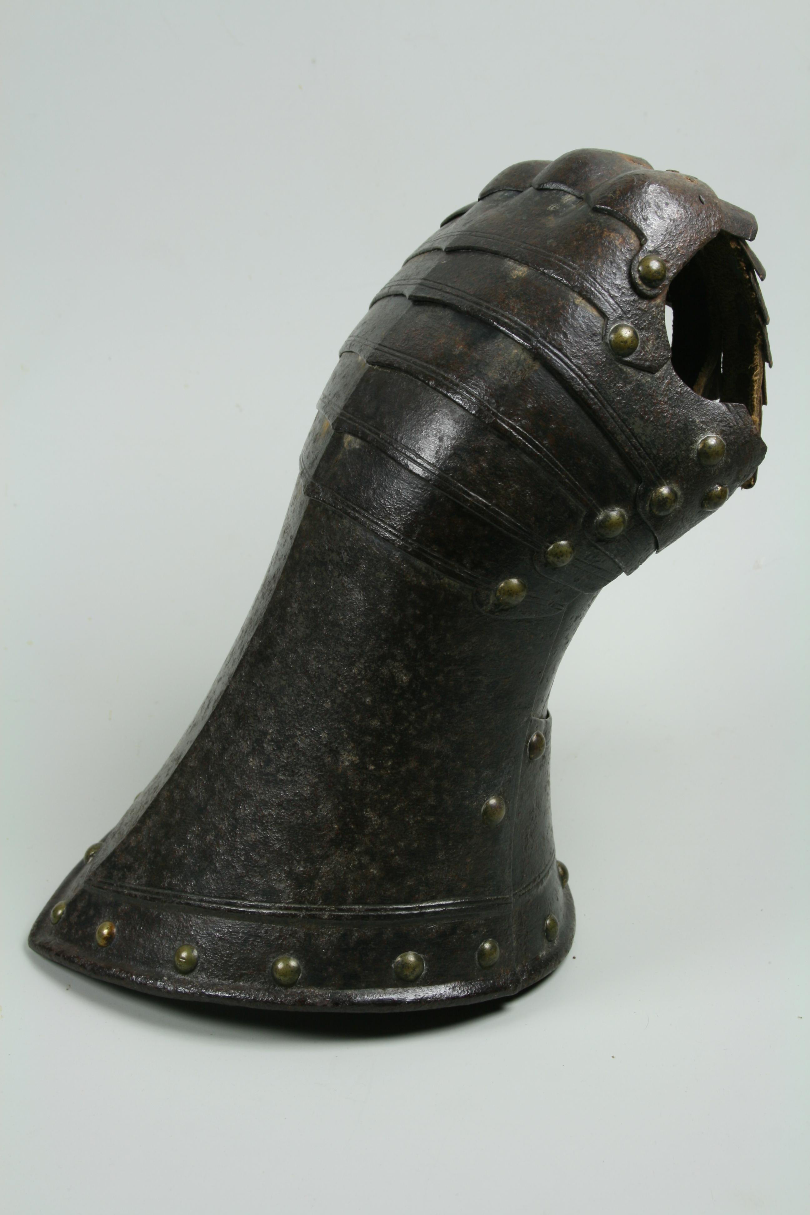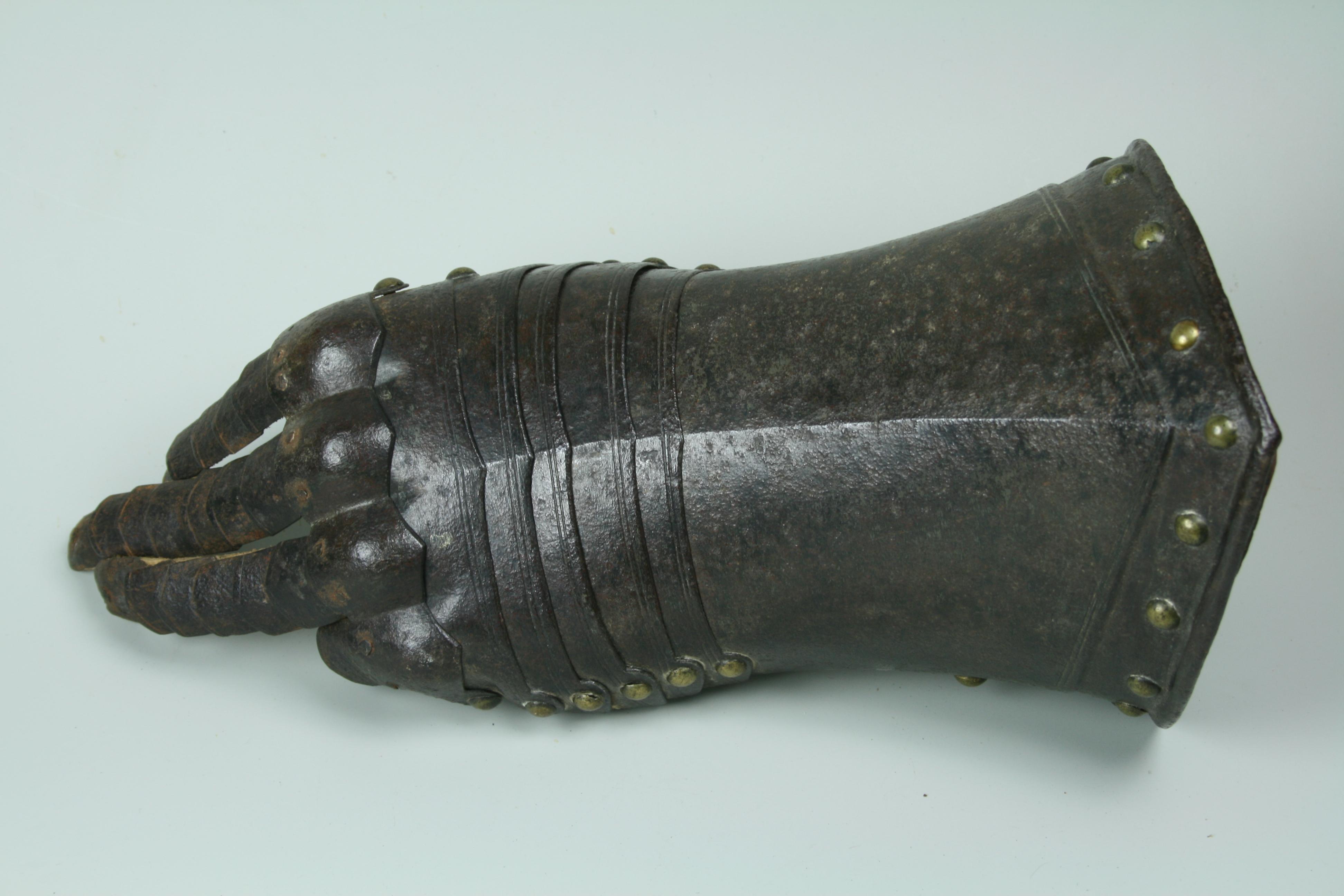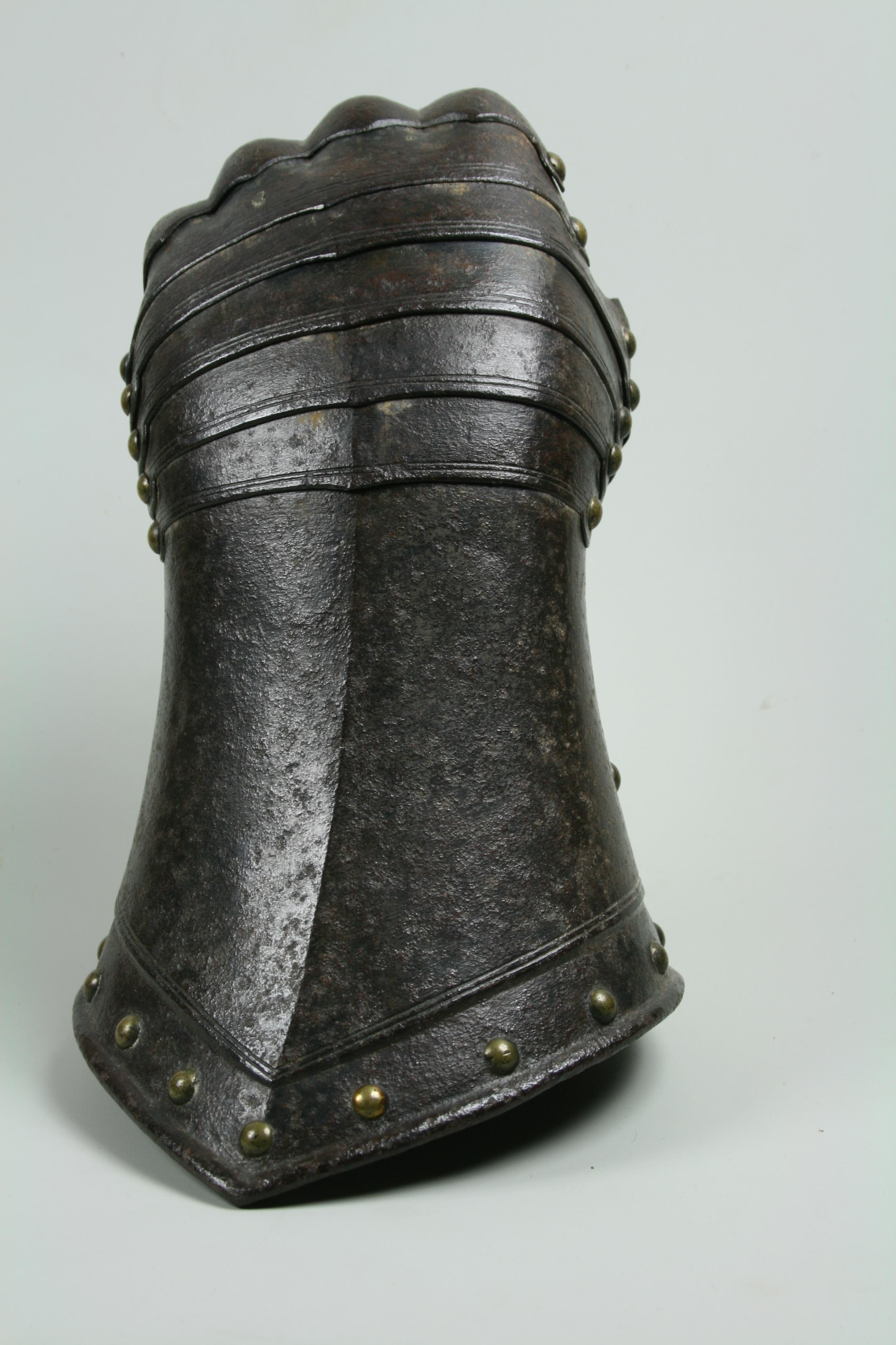 English, Almost certainly Greenwich. Cuff of flared form with a small point at the center and with a central crease. The cuff is formed of a large, shaped outer plate and a small inner plate. The inner plate is fitted with a wrist plate that extends over the base of the thumb. The end of the cuff borndered by a plain inward roll, a recessed border and two parallel engraved lines. The forward edge of the inner thumb plate with a plain inward turn and a pair of engraved lines. The back of the hand and base of the thumb covered by five metecarpal plates and a plate shaped over the knuckles. The fingers and thumb covered by pointed scales with a longer scale covering the finger tip. The edges of all of large plates bordered by pairs of engraved lines. The finger plates bordered by single engraved lines. Lining and articulation rivets capped with brass. Remains of lining leathers at the outer edge of the cuff, along the edge of the wrist/thumb plate and under the articulation rivets opposite the thumb. The back of the hand is elegantly shaped. The points at the center of the metacarpal plates and the centers of the knuckles identify this as a 17th century piece. The central crease in the cuff and metacarpal plates is curved to allow it to follow the center of the natural bend of the hand away from the thumb. The two close up images of the back of the hand show the plates (almost) fully collapsed and fully extended.