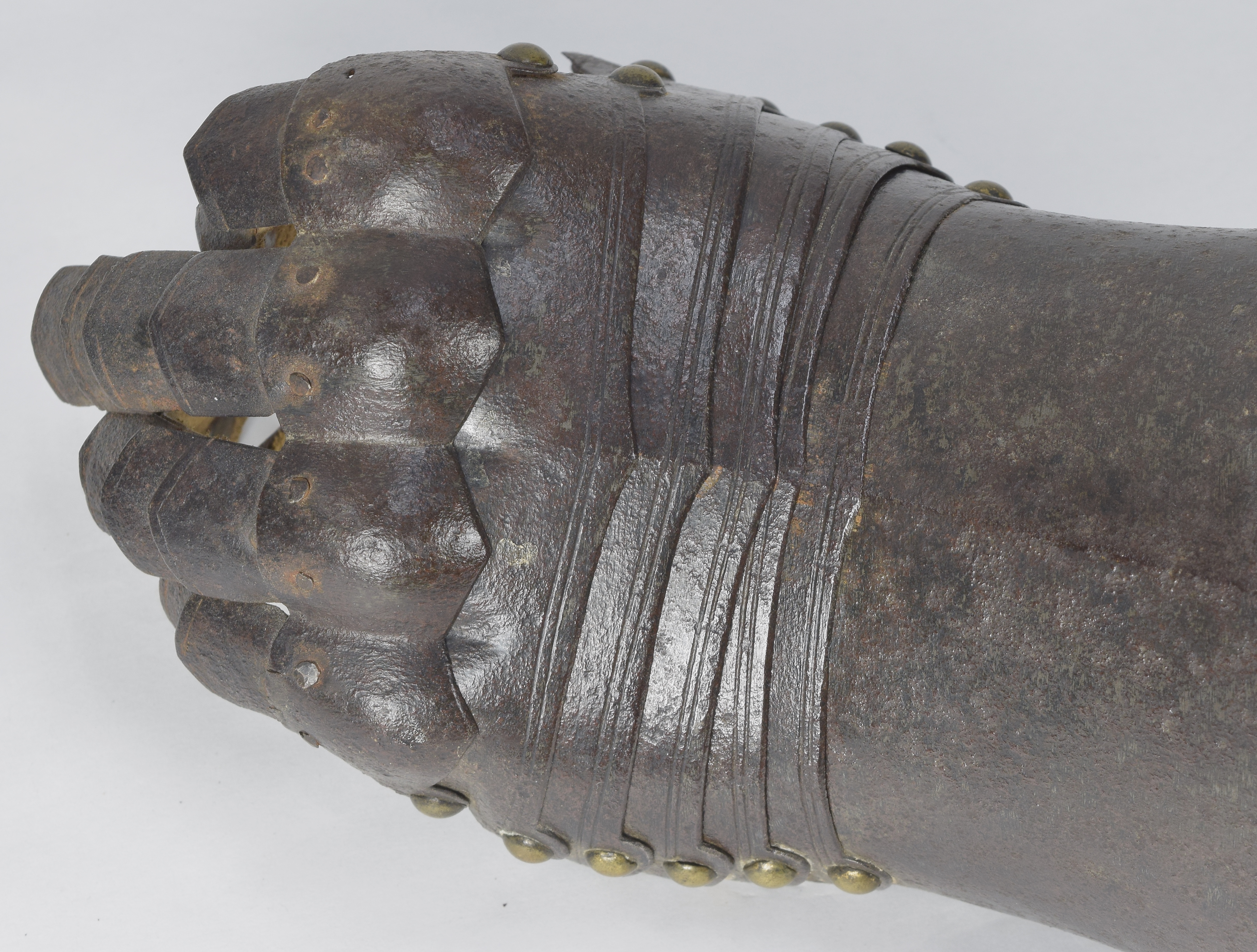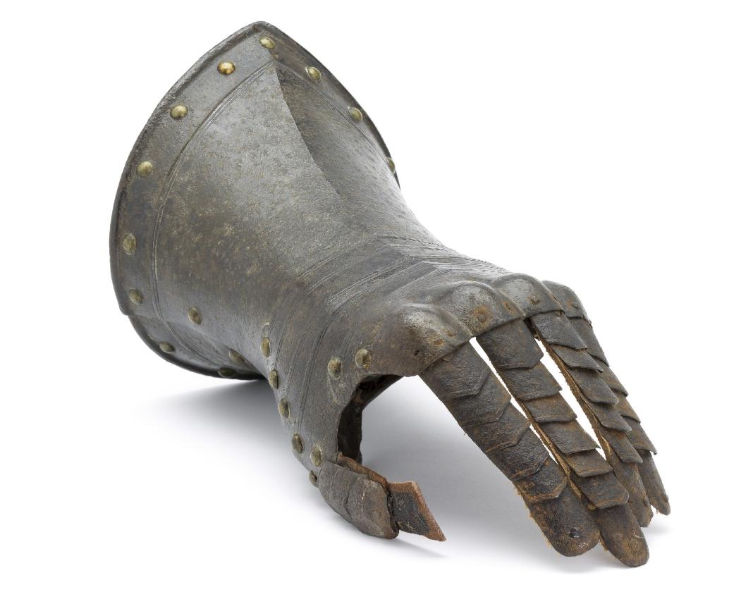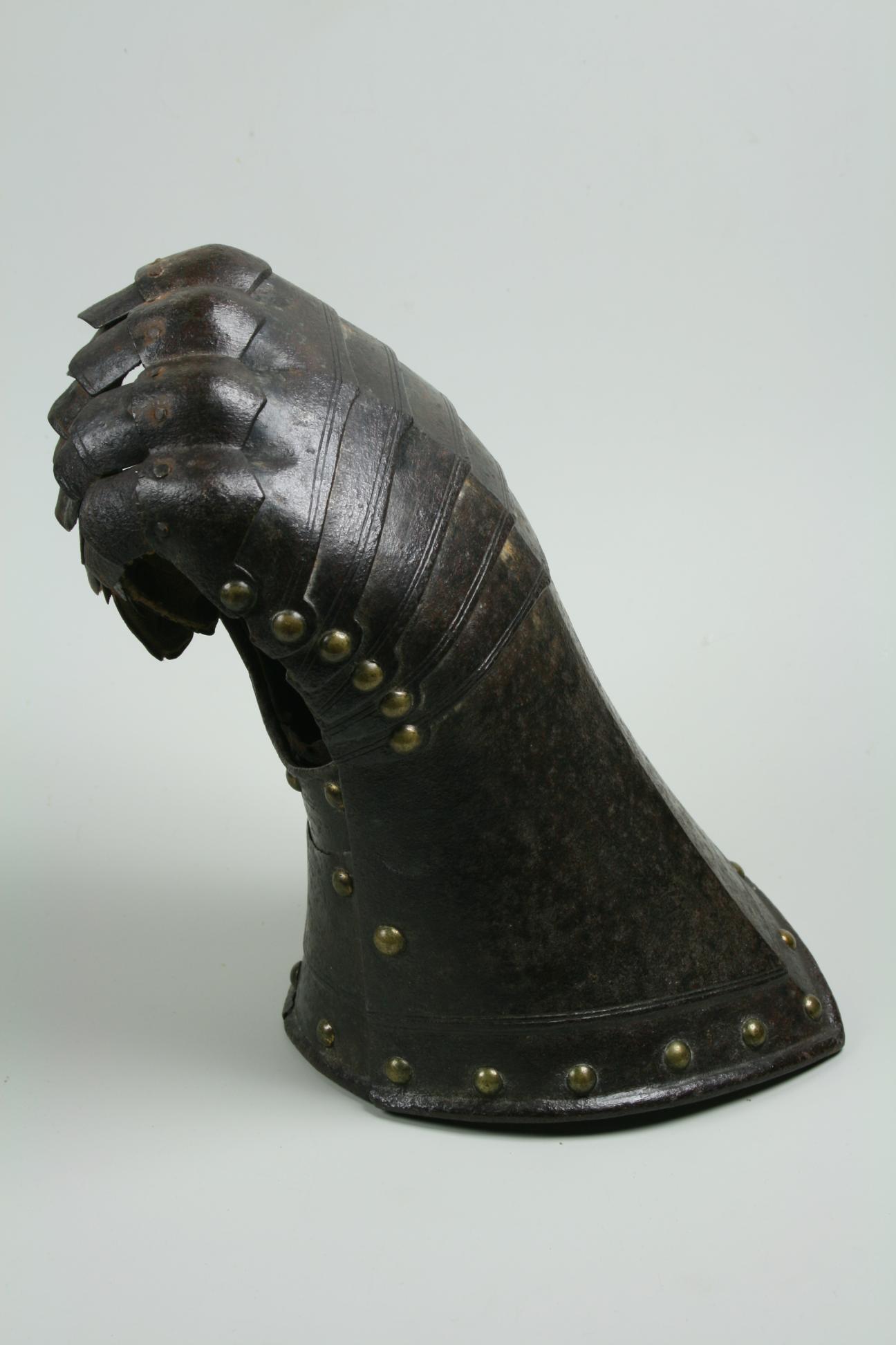 English, Almost certainly Greenwich. Cuff of flared form with a small point at the center and with a central crease. The cuff is formed of a large, shaped outer plate and a small inner plate. The inner plate is fitted with a wrist plate that extends over the base of the thumb. The end of the cuff borndered by a plain inward roll, a recessed border and two parallel engraved lines. The forward edge of the inner thumb plate with a plain inward turn and a pair of engraved lines. The back of the hand and base of the thumb covered by five metecarpal plates and a plate shaped over the knuckles. The fingers and thumb covered by pointed scales with a longer scale covering the finger tip. The edges of all of large plates bordered by pairs of engraved lines. The finger plates bordered by single engraved lines. Lining and articulation rivets capped with brass. Remains of lining leathers at the outer edge of the cuff, along the edge of the wrist/thumb plate and under the articulation rivets opposite the thumb. The back of the hand is elegantly shaped. The points at the center of the metacarpal plates and the centers of the knuckles identify this as a 17th century piece. The central crease in the cuff and metacarpal plates is curved to allow it to follow the center of the natural bend of the hand away from the thumb. The two close up images of the back of the hand show the plates (almost) fully collapsed and fully extended.