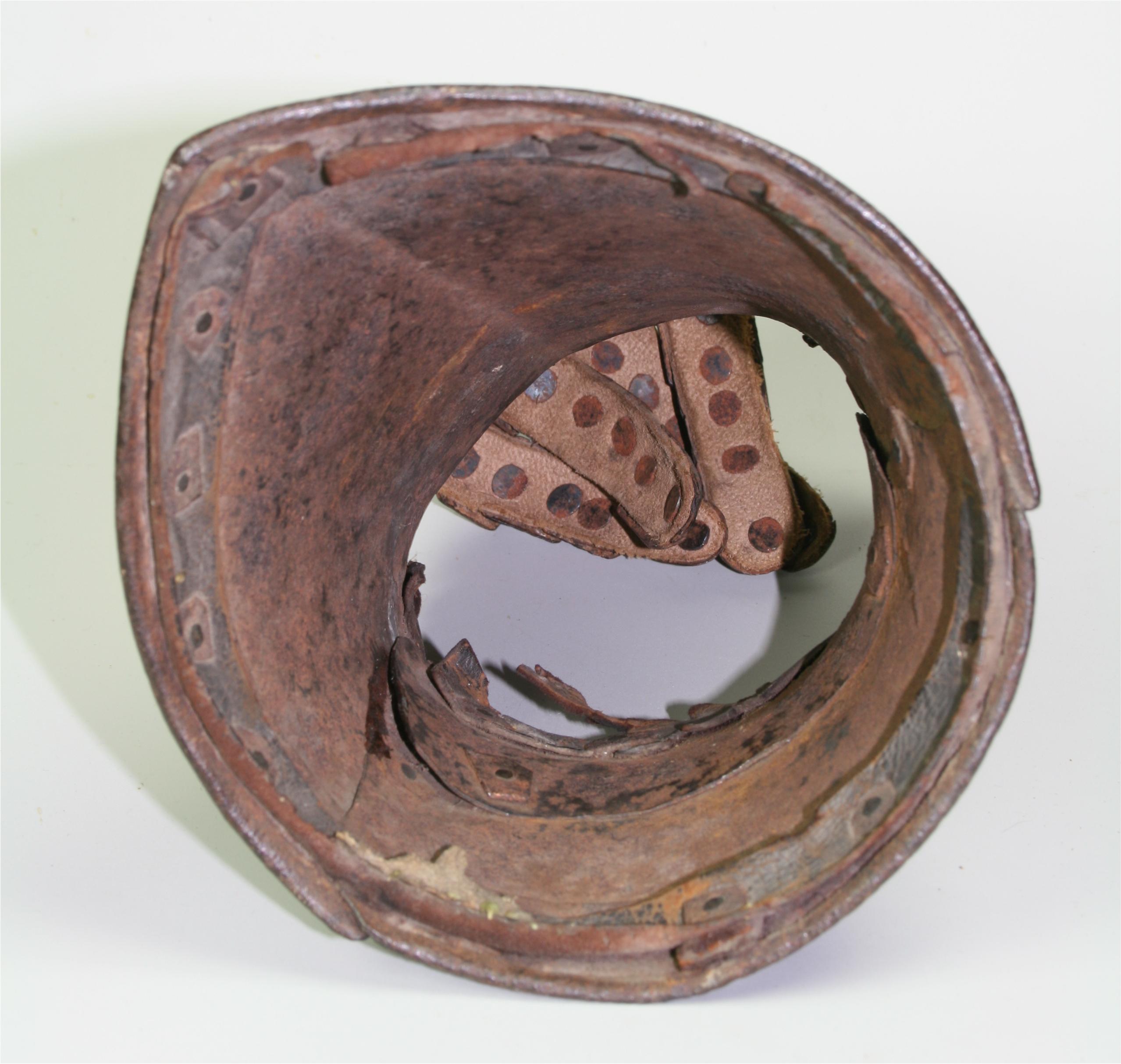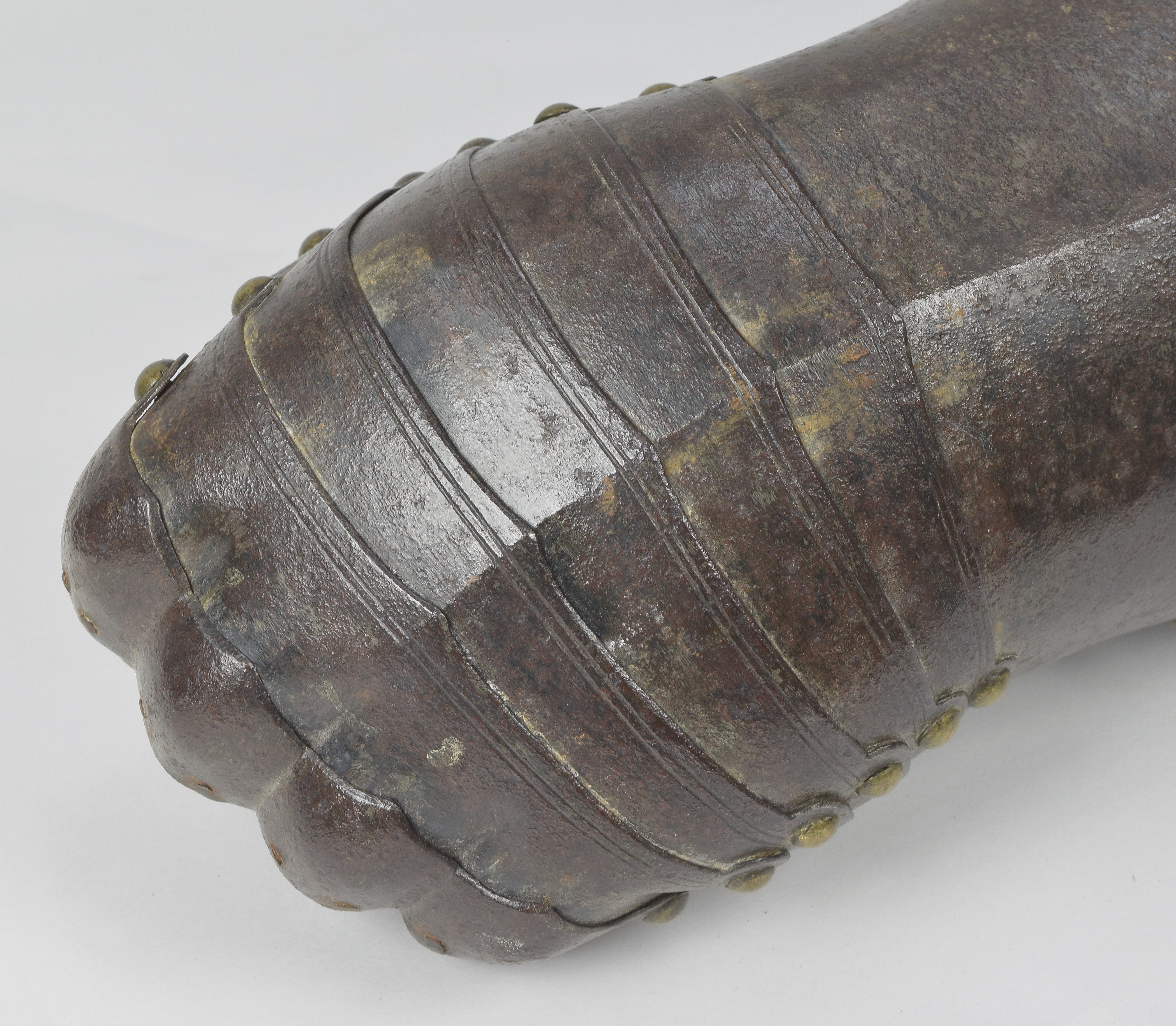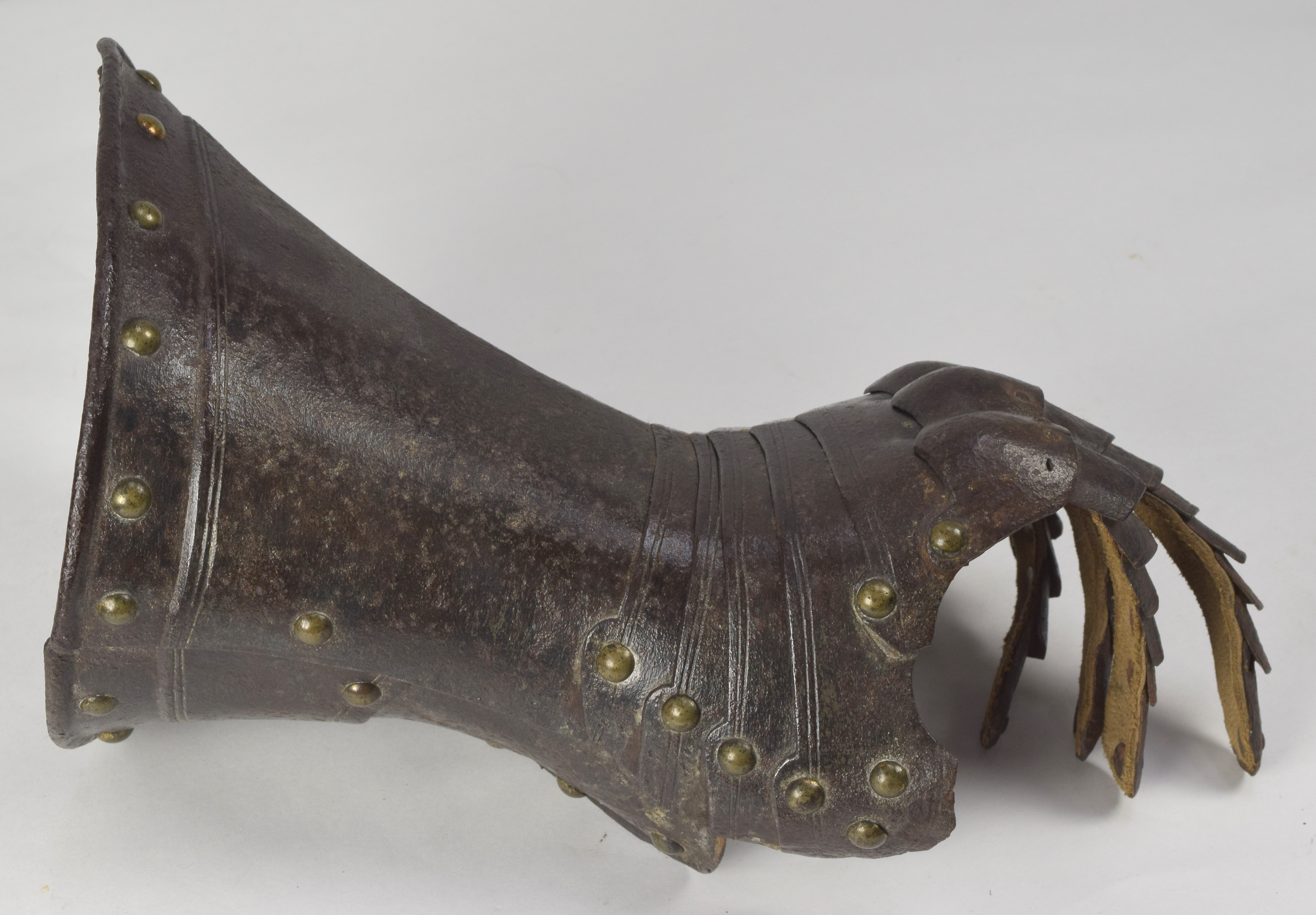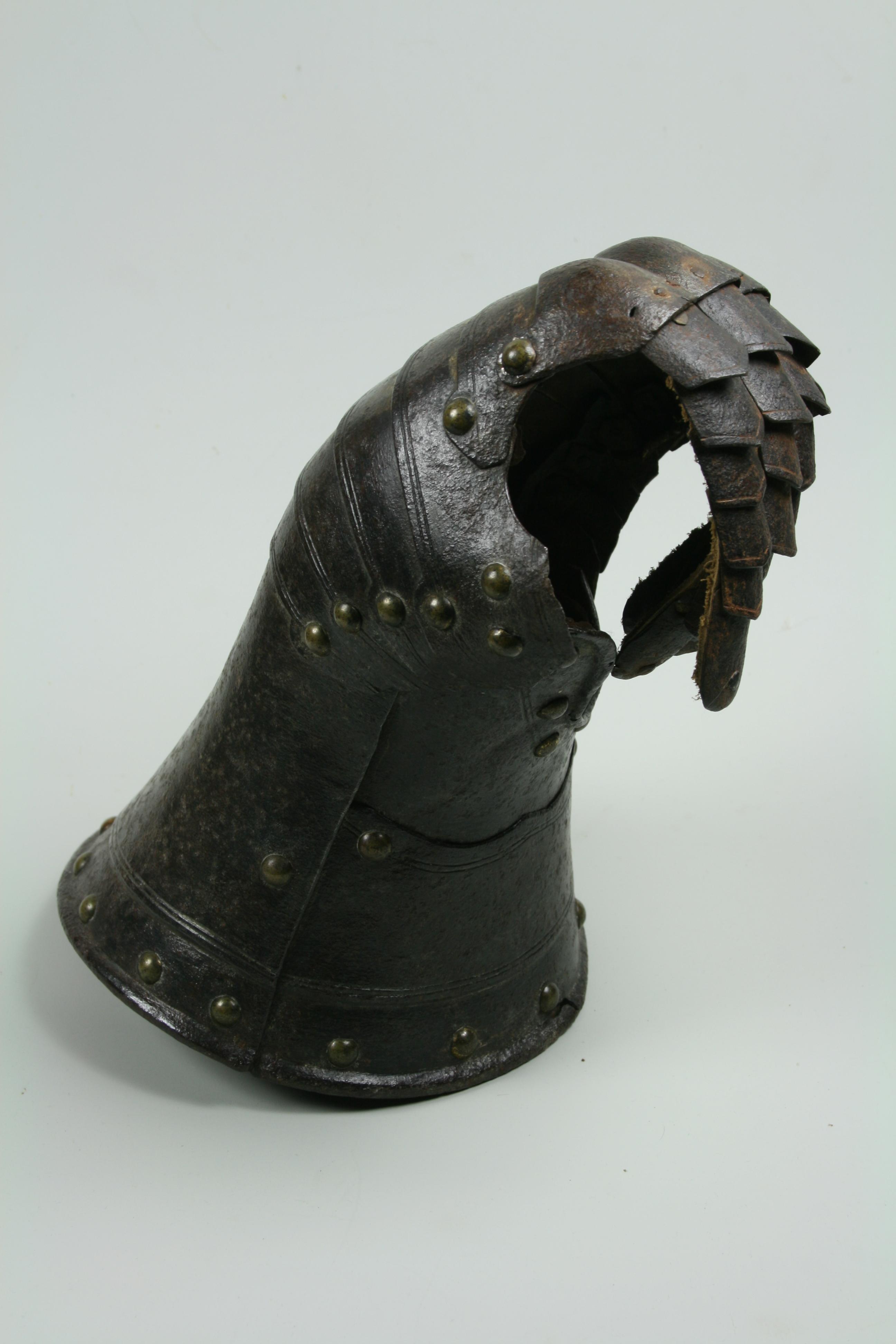 English, Almost certainly Greenwich. Cuff of flared form with a small point at the center and with a central crease. The cuff is formed of a large, shaped outer plate and a small inner plate. The inner plate is fitted with a wrist plate that extends over the base of the thumb. The end of the cuff borndered by a plain inward roll, a recessed border and two parallel engraved lines. The forward edge of the inner thumb plate with a plain inward turn and a pair of engraved lines. The back of the hand and base of the thumb covered by five metecarpal plates and a plate shaped over the knuckles. The fingers and thumb covered by pointed scales with a longer scale covering the finger tip. The edges of all of large plates bordered by pairs of engraved lines. The finger plates bordered by single engraved lines. Lining and articulation rivets capped with brass. Remains of lining leathers at the outer edge of the cuff, along the edge of the wrist/thumb plate and under the articulation rivets opposite the thumb. The back of the hand is elegantly shaped. The points at the center of the metacarpal plates and the centers of the knuckles identify this as a 17th century piece. The central crease in the cuff and metacarpal plates is curved to allow it to follow the center of the natural bend of the hand away from the thumb. The two close up images of the back of the hand show the plates (almost) fully collapsed and fully extended.