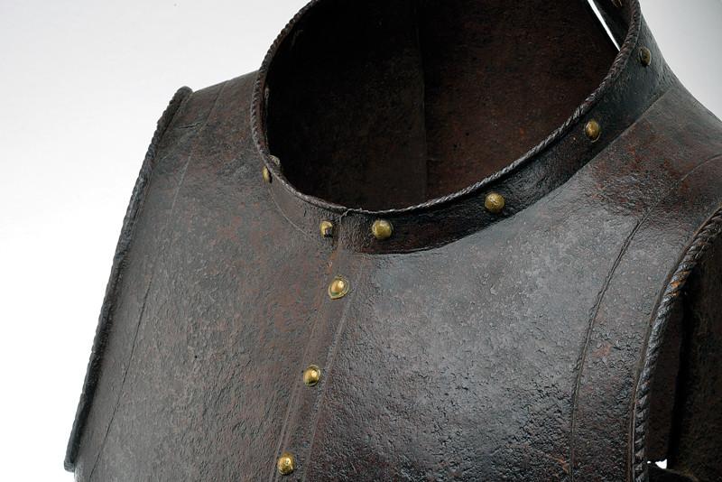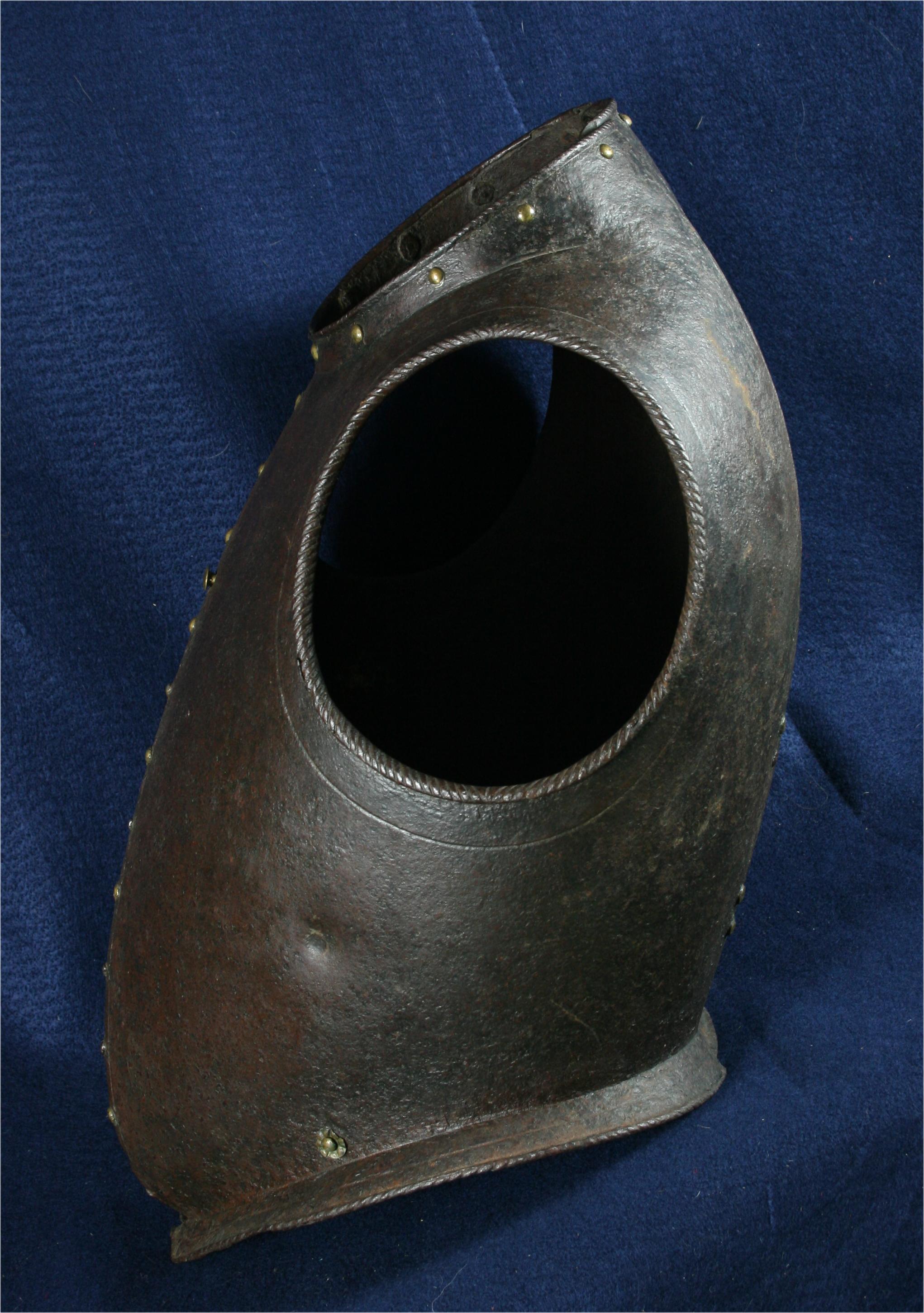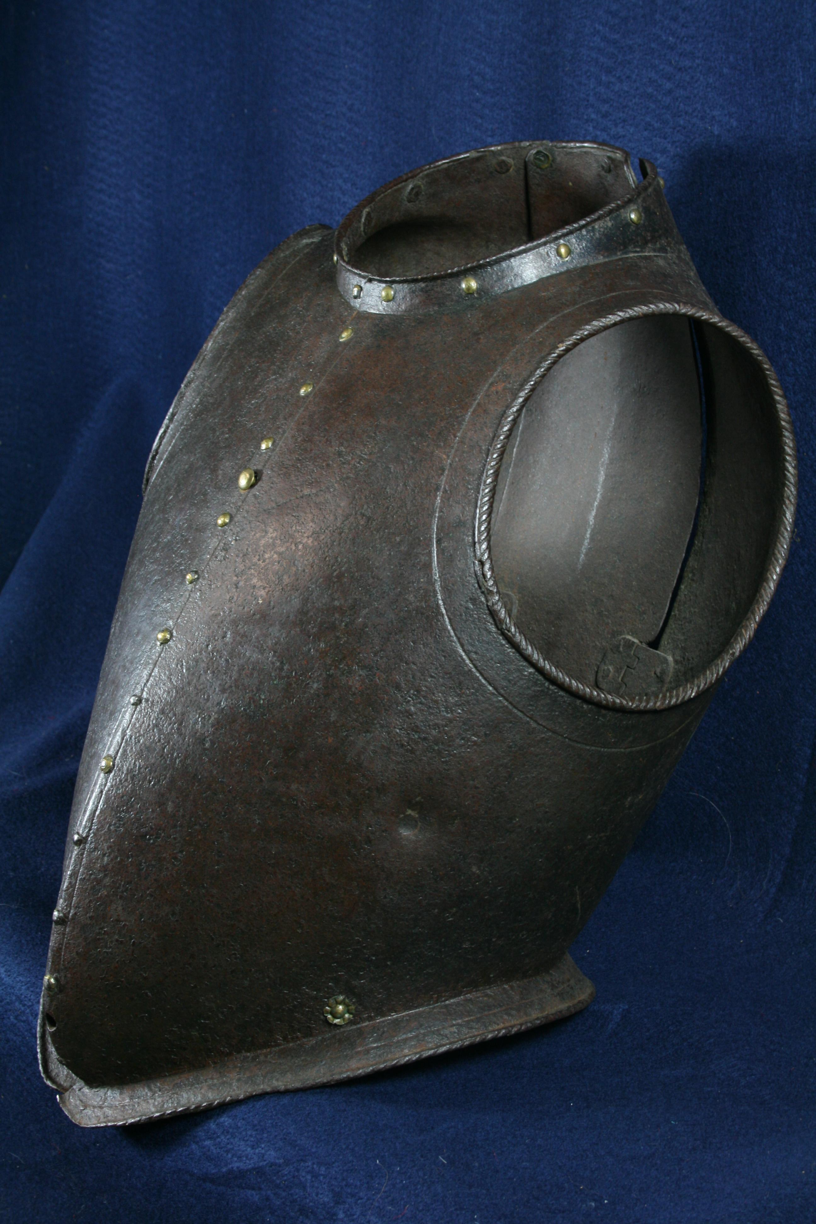 Italian. Full peasscod shape mimicing the doublet of the time. Formed in three pieces, one narrow one down the center of the back and two sides which join at the center of the front. The sections are secured by a pair of interior inset hinges in the lower portion of the back. Arm holes with outward turned roped rolls bordered by an engraved line. Neck and waist edges with inward turned finely roped rolls and bordered by single incised lines. The front is decorated with a series of false buttons formed of iron rivets with brass caps, a few of which have lost their caps. The cuirass is secured closed by means of two threaded studs on the interior plate that engage holes on the outer plate. Currently one of these holes is filled with a modern brass bolt. The top edge is formed into a low straight collar, the bottom edge is flared out below the waist. Shot proof thickness with what appears to be a proof mark on the left side. A nice example of a rare type of body armour. Several defenses of this type (etched) survive in the Wallace collection. There are a few plain ones in the Graz arsenal. These are normally thought of as light civilian armours or decorative, but there are several like this one that are definitely designed for protection against weapons used in warfare.