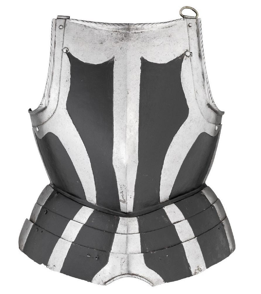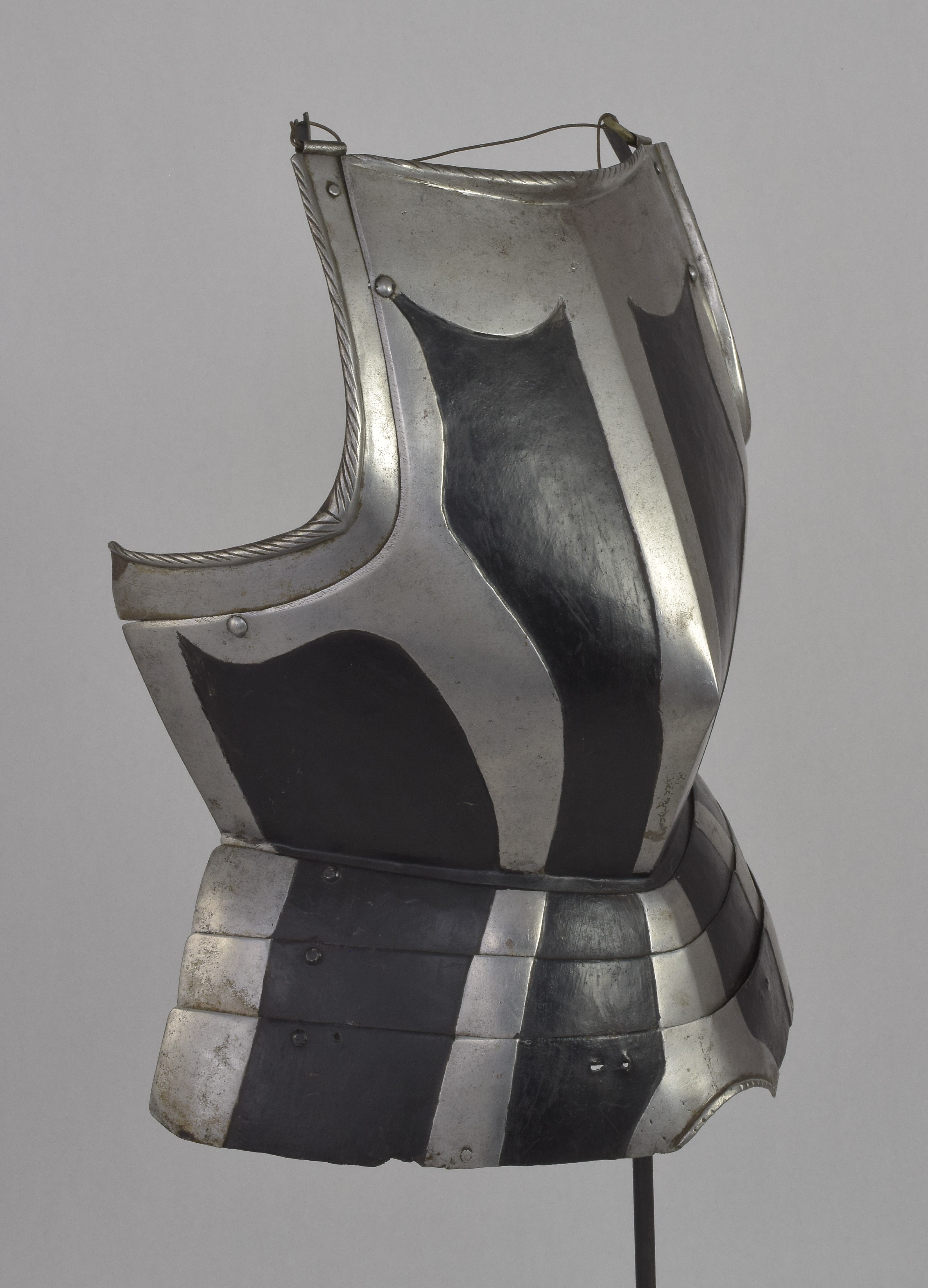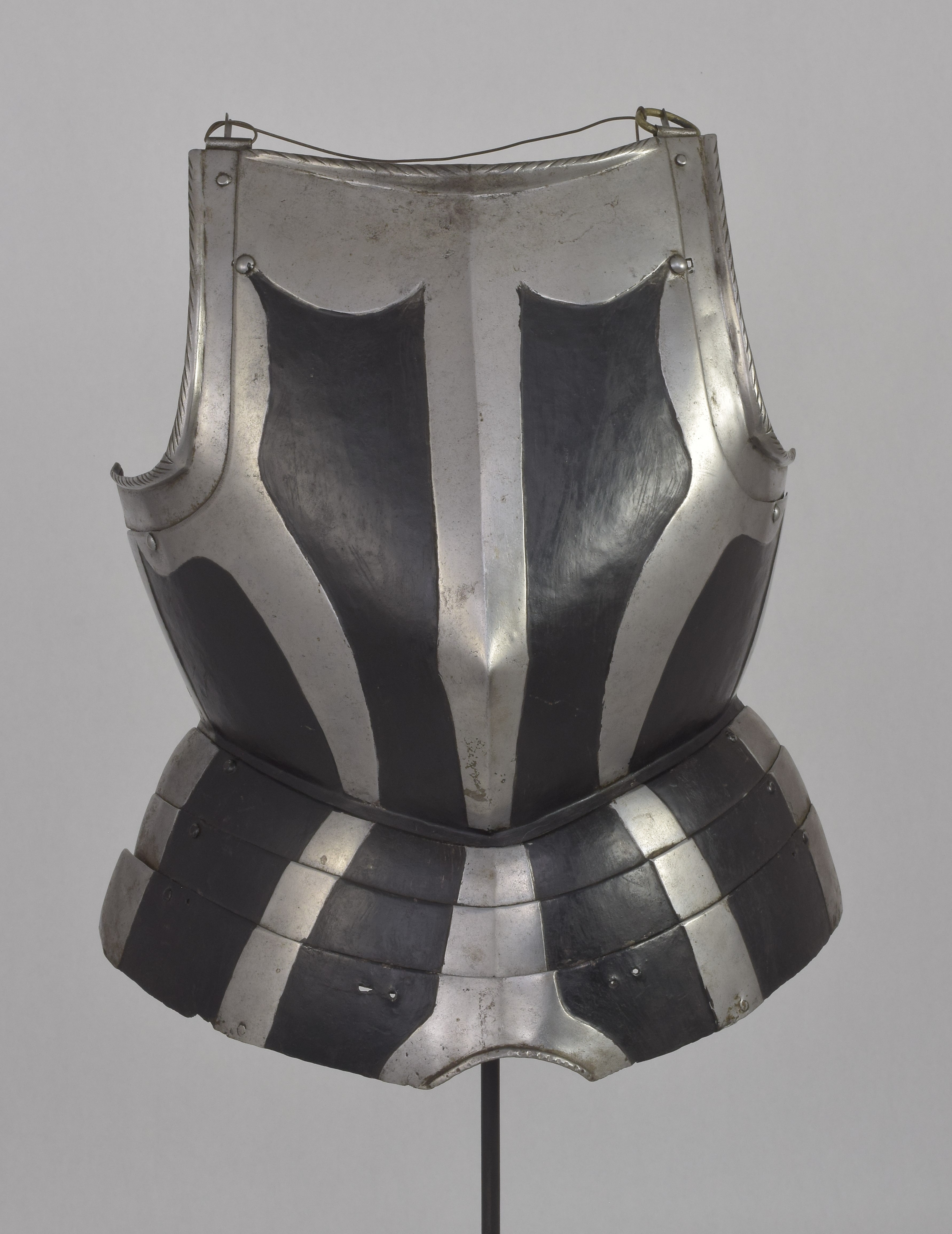 German. Black and white with rough from the hammer surface with raised polished bands. The neck with a tapered inward turned roped roll. The arms fitted with gussets with inward turned tapered rolls. Retains fauld of 3 plates. Reblackened with paint to simulate the original appearance. Polished bands at the center, middle of each side and sides of the breastplate which continue on the fauld. The bands on the breastplate are very roughly formed on the outside, tooling appearing to be made by very small, narrow pien. The bands in the fauld more cleanly made, likely because raising bands on the thinner material is easier. small patch in the flare for the fauld. Retains rivets for leathers in the fauld. These are located int the raised bands in the middle of each side of the fauld. Area in the upper half of the inside of the breastplate cleaned.