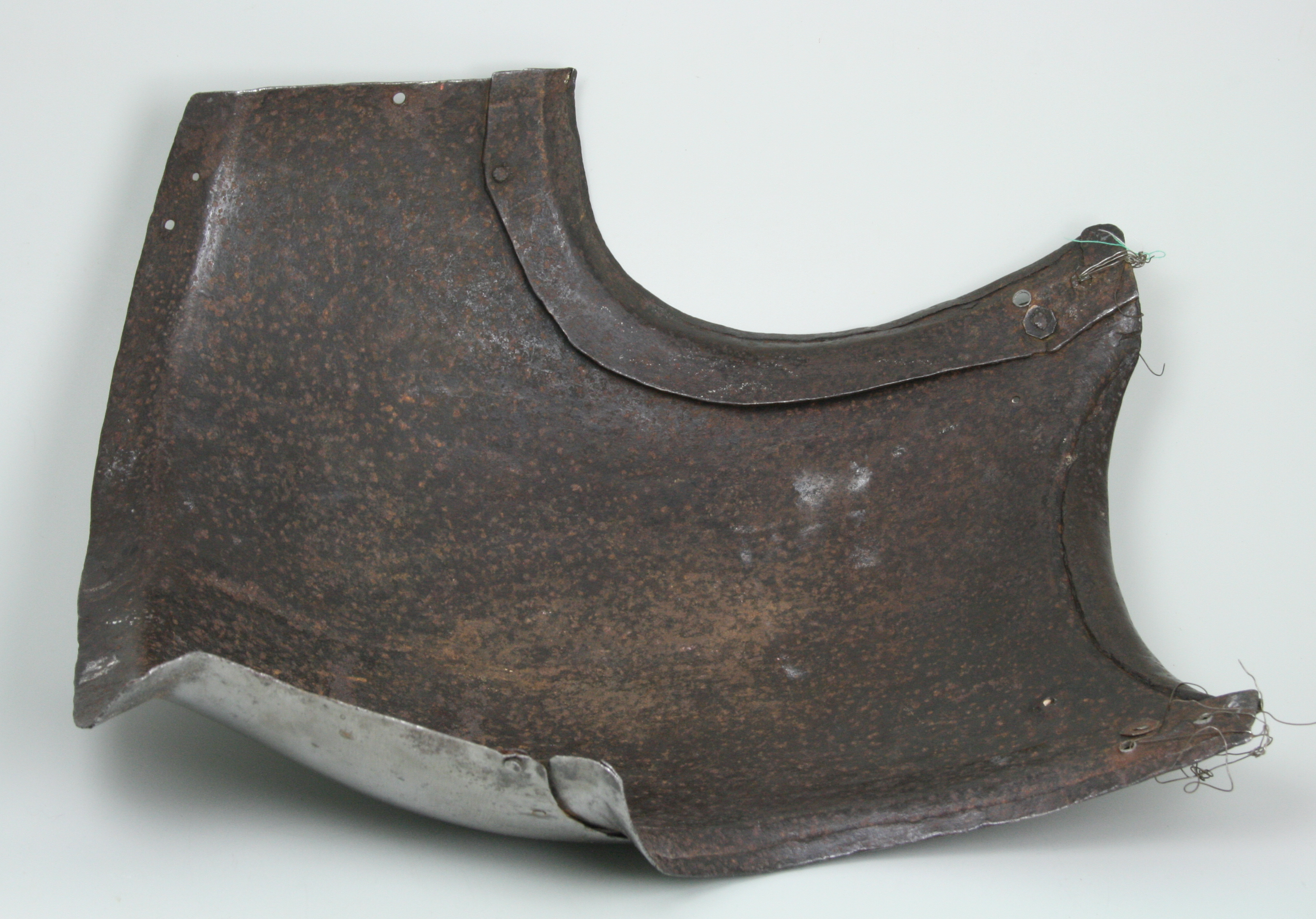 Globose form with a shallow central crease. Neck with angular inward turned roll. Arms with simple flared and inward-turned gussets. This style of simplified gusset appears on very late 15th and early 16th c. munition pieces. Waist flared to carry the fauld. Very early transition form between late 15th to early 16th c. forms and the more rounded form typical of the Maximilian style. Upper turn and gussets similar to item number A-216. Earlier form illustrated by item number A-66, item number A-321 and item number A-239. Slightly later forms illustrated by item number A-225 and item number A-216. A likely slightly earlier breastplate that shares the form of the upper roll and gusset flares can be found in the KHM (item number A 2154) attributed to Innsbruck (?) and dated to c. 1500.