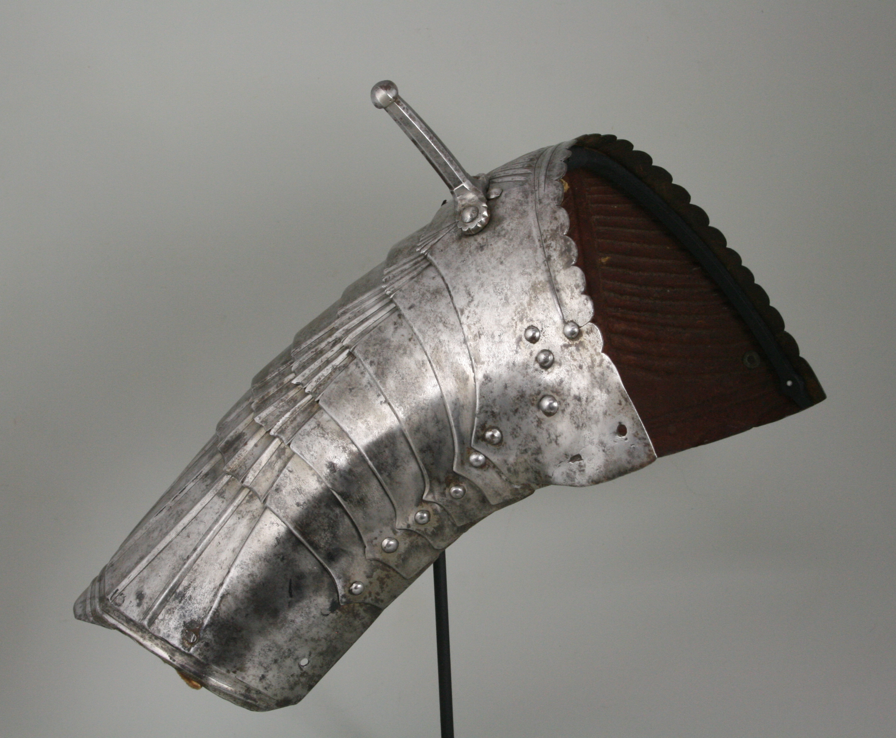 For the right shoulder. Fluted at the center of the arm and heavily fluted in the back of the main plate. Flutes asymmetric with engraved lines on both sides accenting the form of the flute. Upper edge of the main plate filed to rounded tabs. The rear edge of the main plate with bent down cusps. Center of the main plate with a sculpted peg to secure the lance when held over the shoulder. Originally part of a Stech armour of very high quality. A pair of pauldrons of similar form are illustrated on plate 73 of Katalog Der Leibrustkammer I teil. They are dated 1497. That pair are somewhat more plain. There are several other pairs of Stech pauldrons in the KHM. The most plain is on S VII - Stechzeug made in Innsbruck and dated 1483/4. Other similar pauldrons include WA 24 and S XVI. This one is purportedy from the collection at Schloss Grafenegg. The plates have a very nice form, overall tapering to the arm and flaring out in the front where it would overlap the breastplate and aggressively curved in the back where it would fit over the shoulder blades. Top plate or plates missing. The cusped border would not be on a terminal plate, the top plate should have a roll.