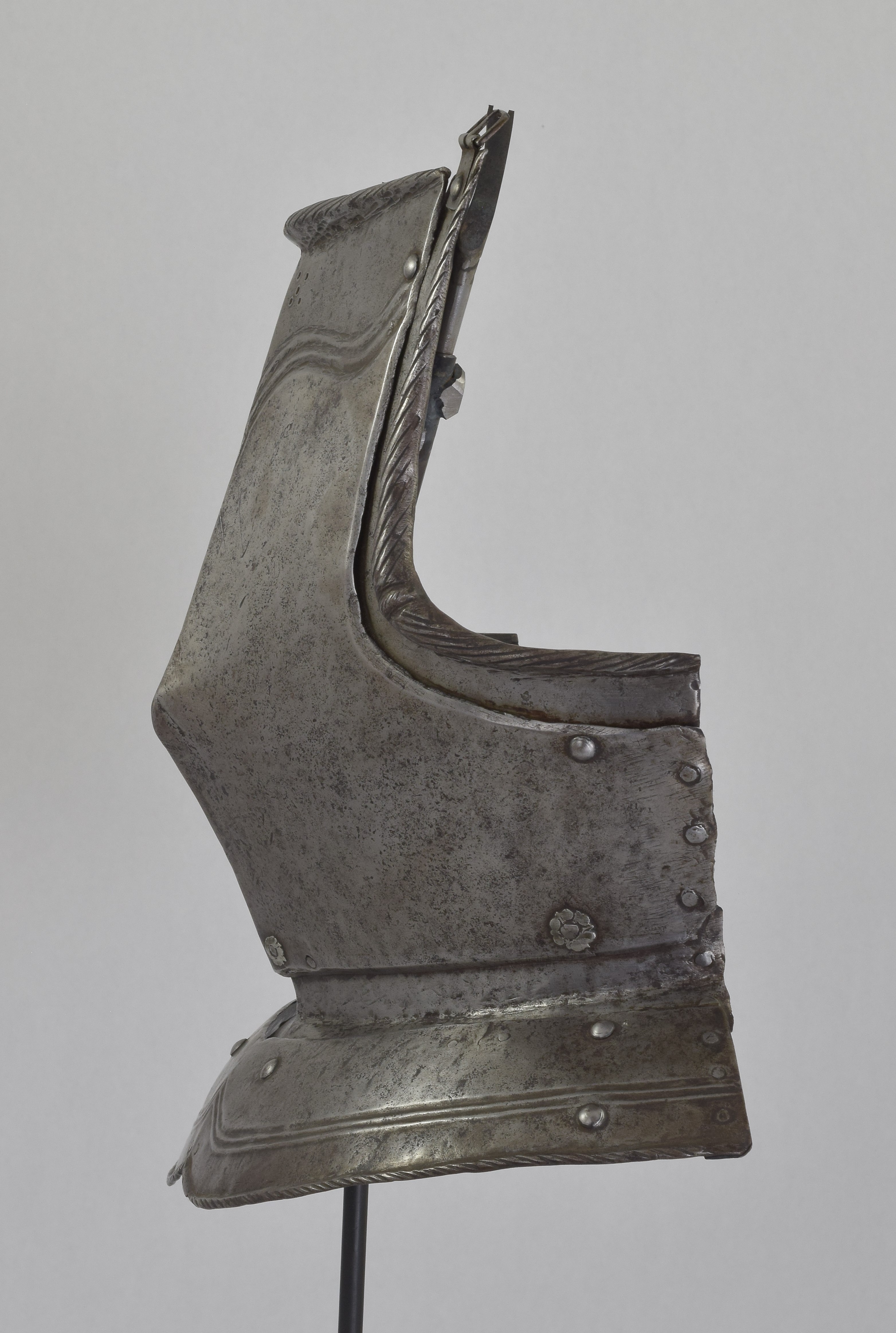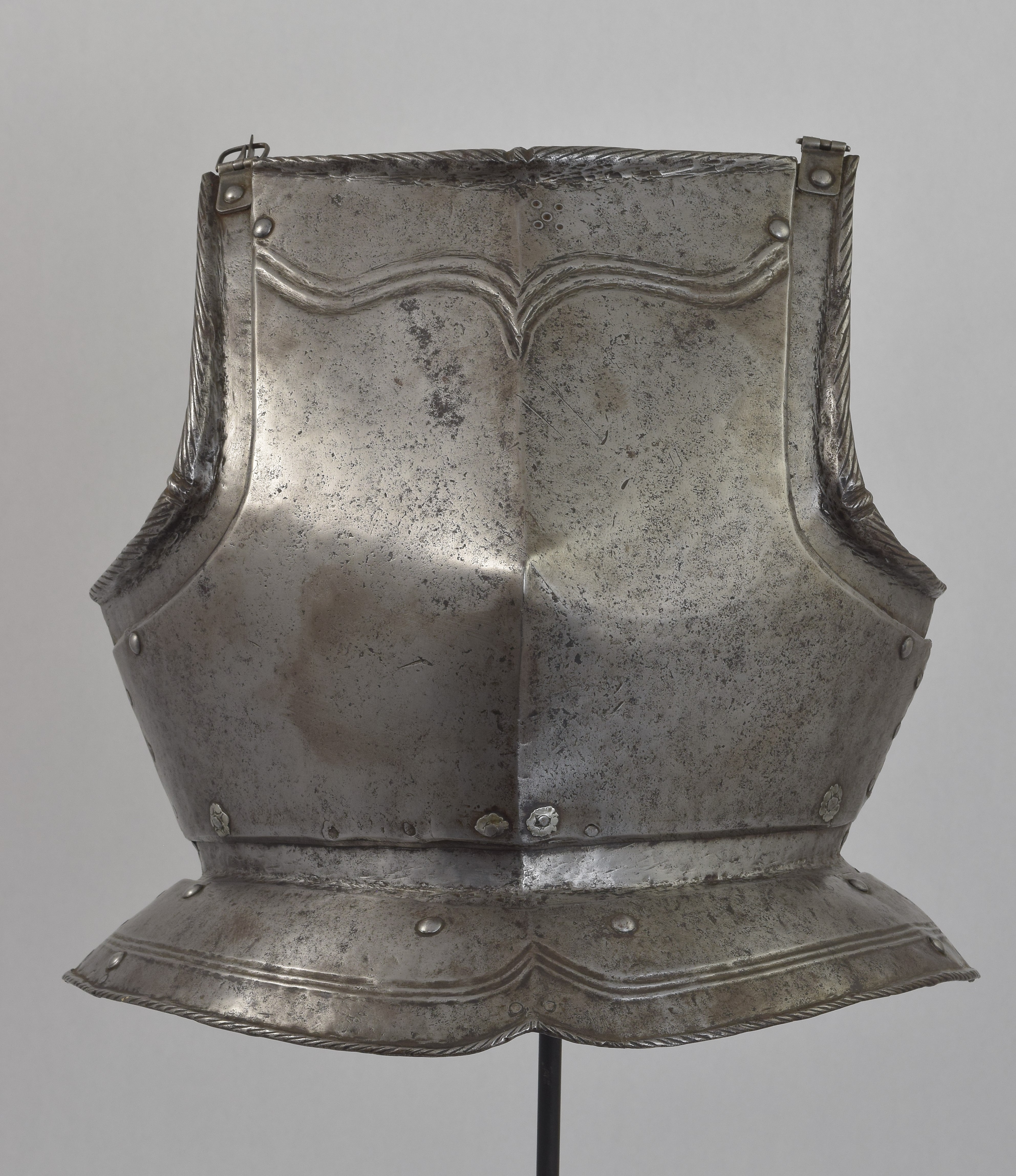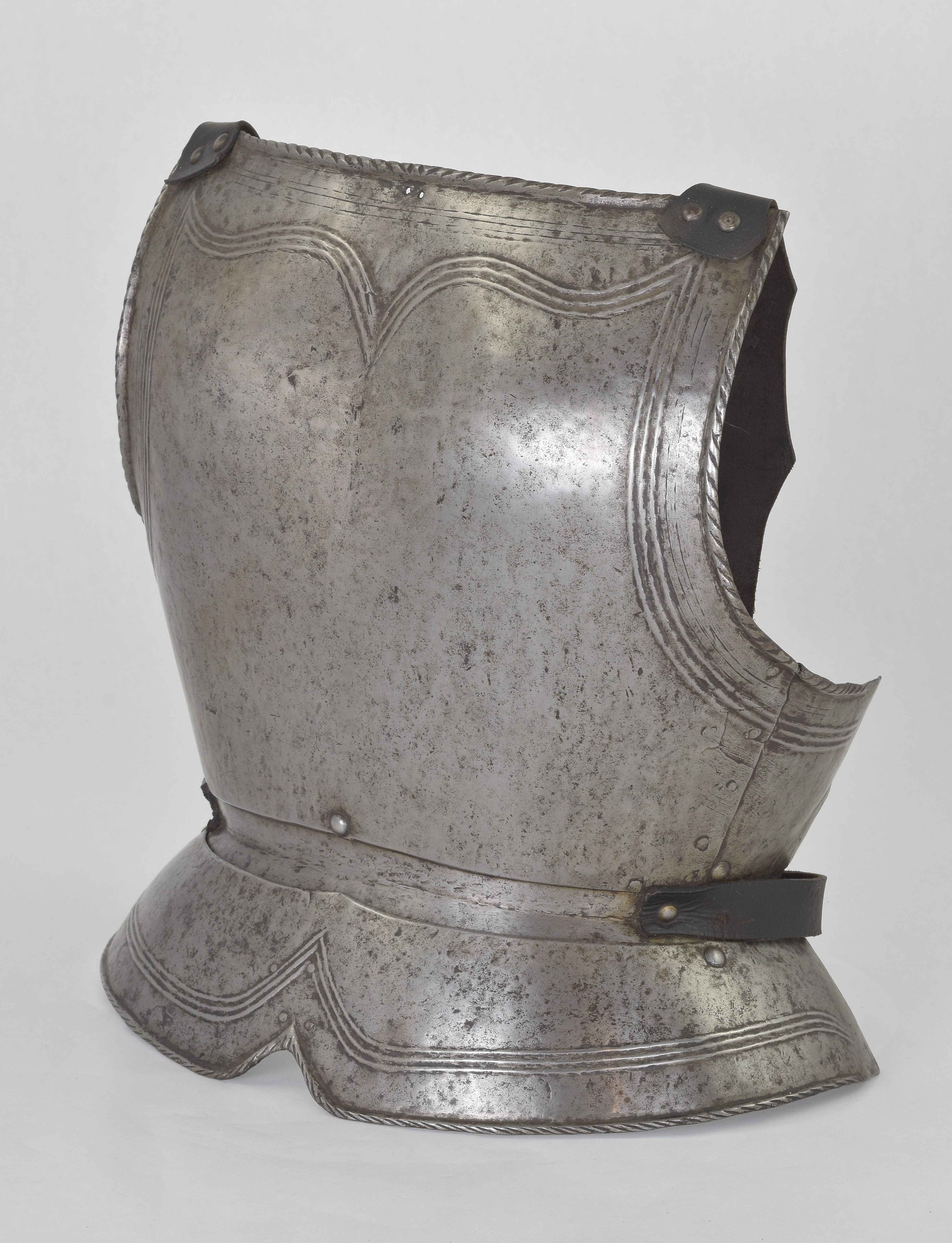 breast-plate with medial ridge drawn-out to a central point and with a separate waist lame forming a flange at the base, the upper edge prominently turned and roped above an inverted double ogee-shaped border, movable armhole gussets with edges roped en suite, single riveted skirt and back-plate with two small side plates, waist lame and culet all en suite with the breast-plate. Almost certainly from the same series and well matched in style. Both the breast and back of relatively heavy construction for munition pieces. The back may be from a somewhat shorter cuirass. The rolls on the breastplate and gussets are nicely tapered and elegantly roped. Roping changes direction at the center where the center is accented with a central bump with roping. Bottom of the fauld and culet lames with inward turned roped rolls. Ends of the rolls on the backplate under the arms and on the culet terminate allowing for easy overlap under the breastplate. Originally rough from the hammer and blackened. Breast marked with 5 round punch marks near the neck and 4 chisel marks on the inside of the neck roll. Lightly cleaned. Most rivets replaced. Some do appear to be original. There are four rivets that secure the breast to the waist lame which have remnants of pewter rosette washers, patches and some laminations secured with original rivets. Re-leathered. Buckles replaced. There are some internal patches. Two apparently modern patches in the fauld lame. Two in the backplate appear to be working life. One at one end of the culet is modern. There are some marks near the center of the breastplate that resemble those left by arrows impacting armour.