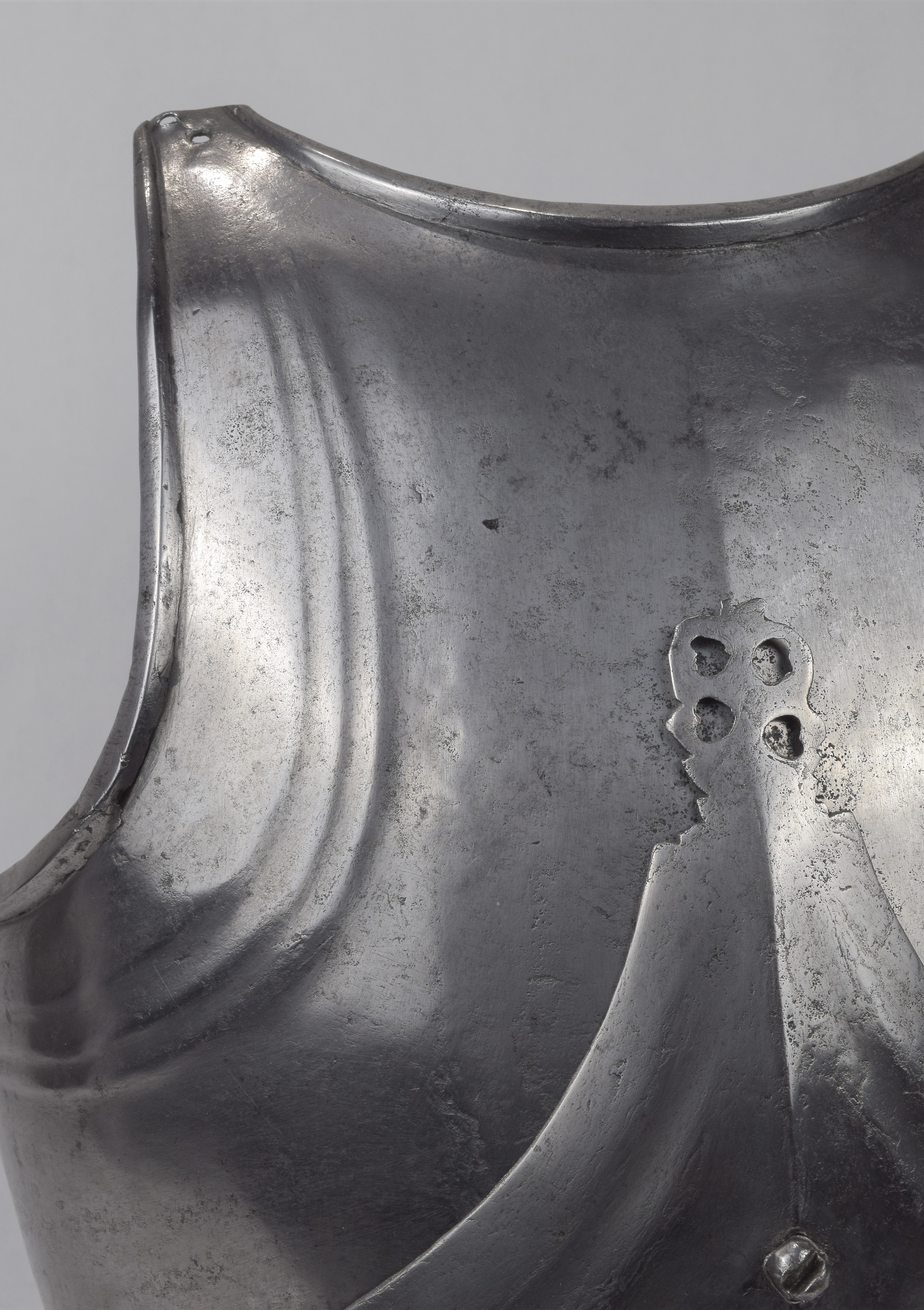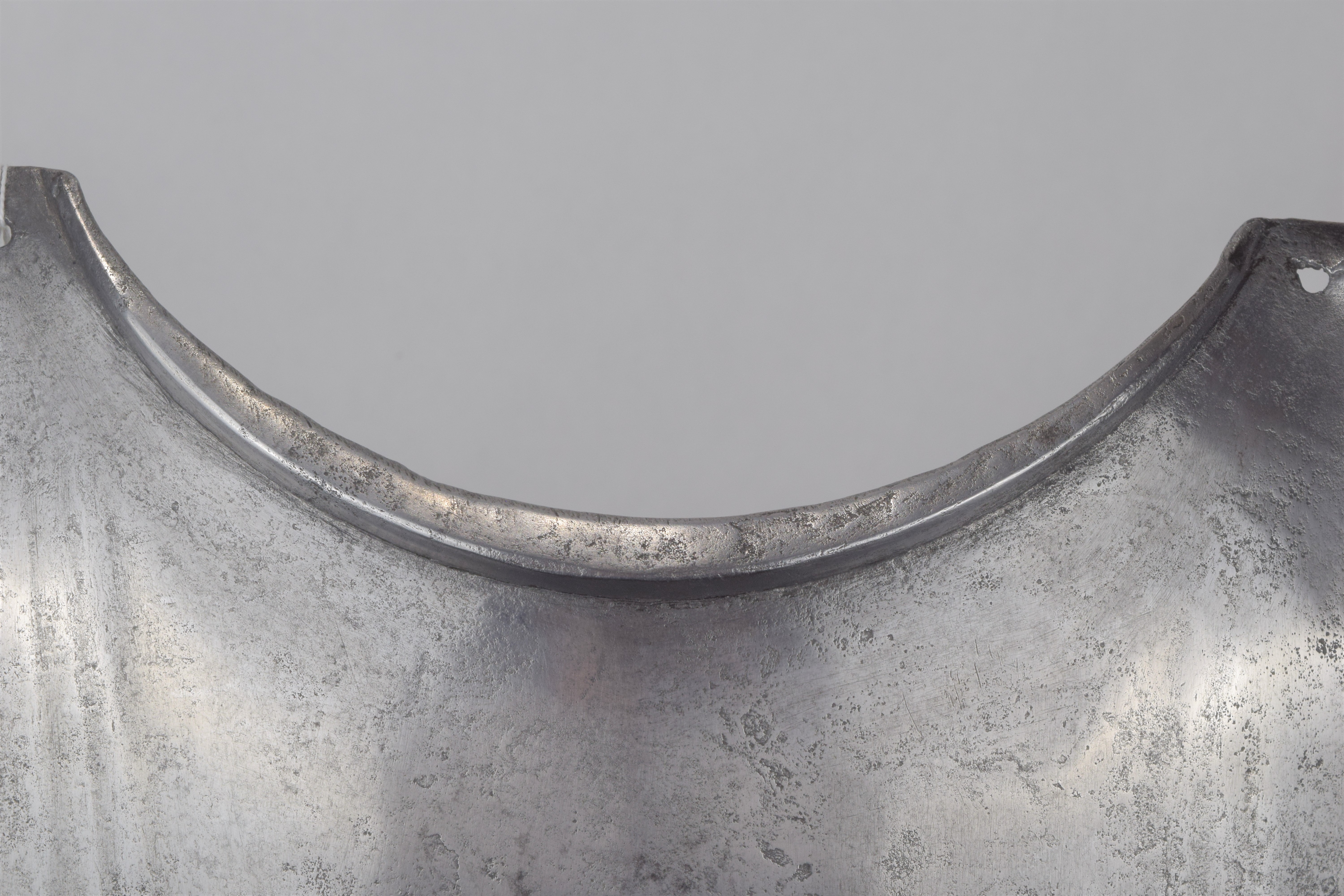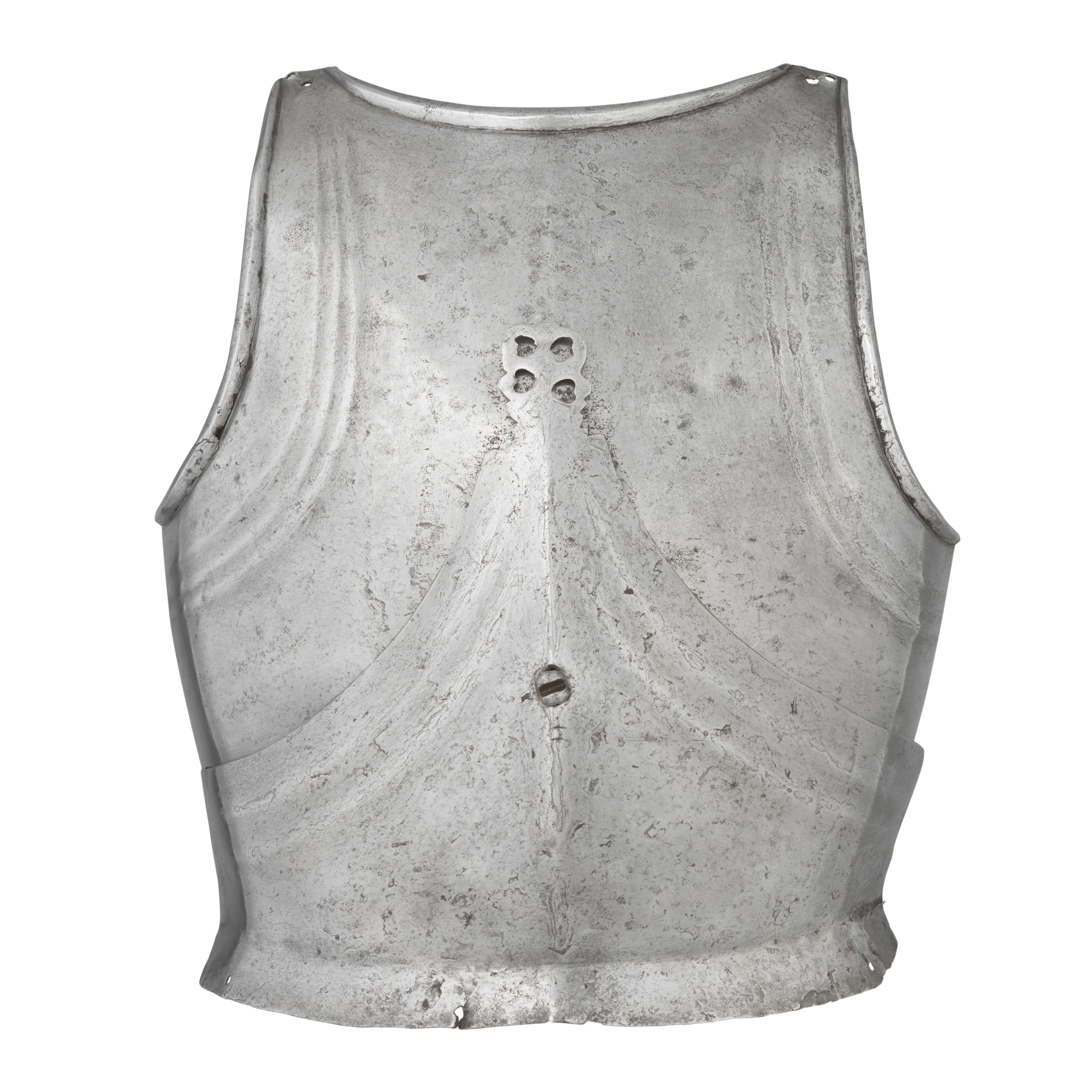 Composed. Formed of two pieces joined by a bolt. The main plate with a low medial ridge, plain angular, outward turned rolls at the neck and arm holes. The roll at the neck forming a vertical front edge then rounded over the top. The roll tapers nicely at the ends. The arm rolls of similar, but not as nicely executed form. The arm holes each with three one sided step flutes parallel to the rolls. Plackart rising to a central squared off point pierced with four hearts, the center with a vertical keel. The upper edges of the plackart with two parallel flutes. The outer of these is a step, the next seems symmetric. Bottom edge of the plackart flared to carry a fauld. The parts have been together for all of its modern history, but they are associated. The plackart and upper are secured to each other by a central bolt which threads directly into one of 4 holes pierced in the upper. The bolt is likely from the same period and the threads fit the threads in the upper. The top hole is cleanly cut, the bottom three are significantly mushroomed inward around the edges. As currently displayed, it sits a little tall, and the waist line will appear to be straighter than it would have been originally. Plates show signs of delamination and wear through cleaning. There are two small dents in the upper breast. These look like they may have been caused by impact from a square pointed weapon.