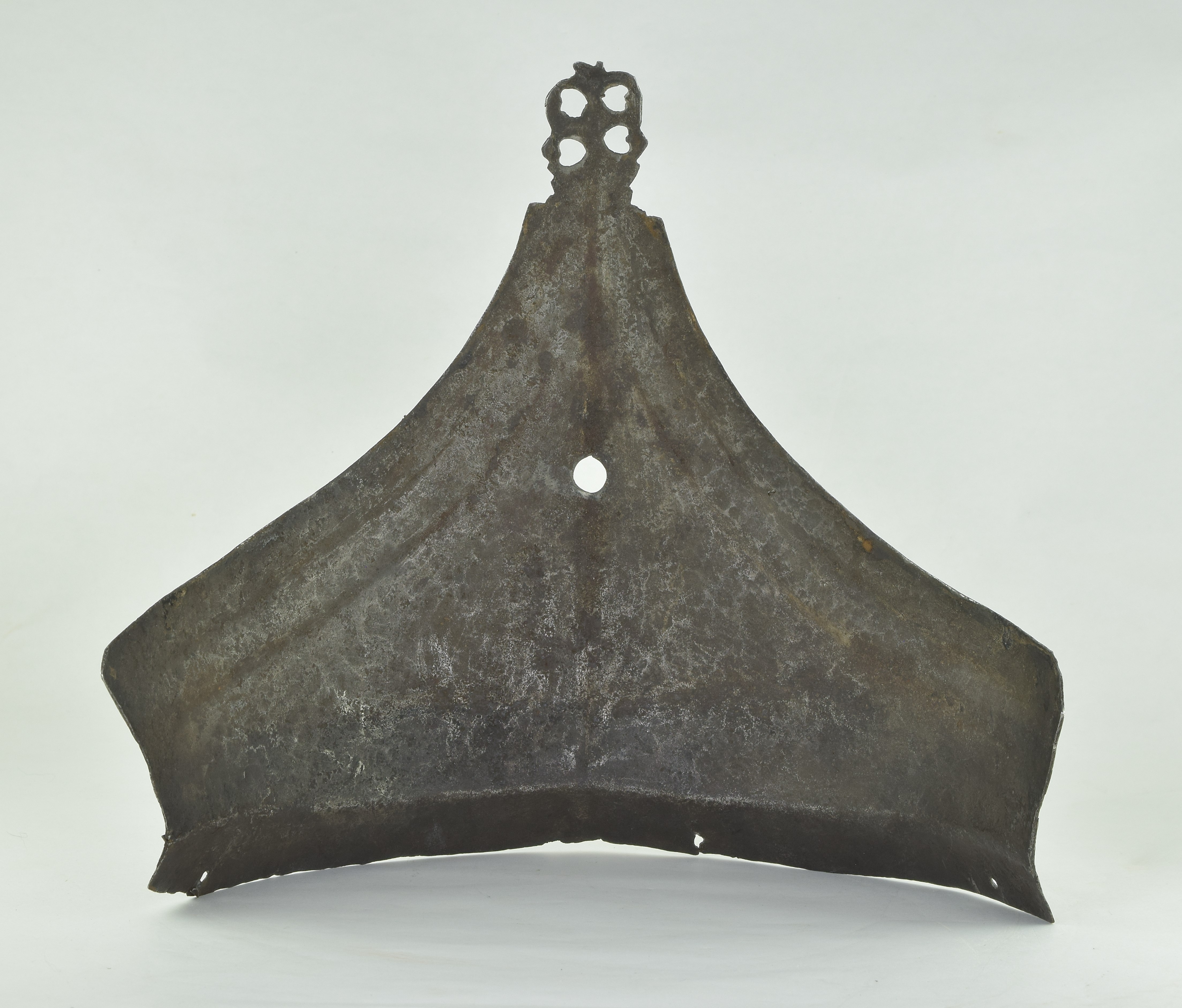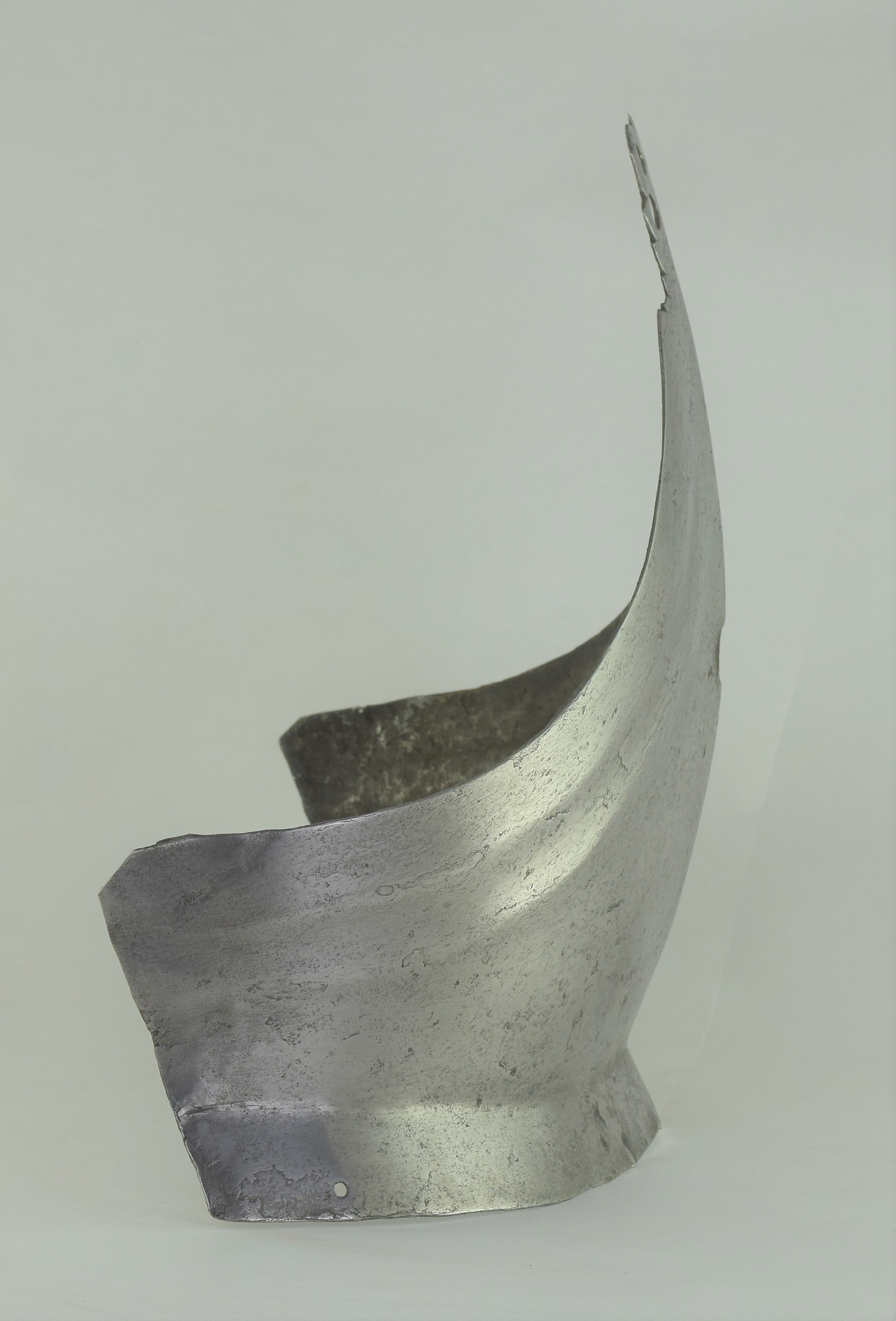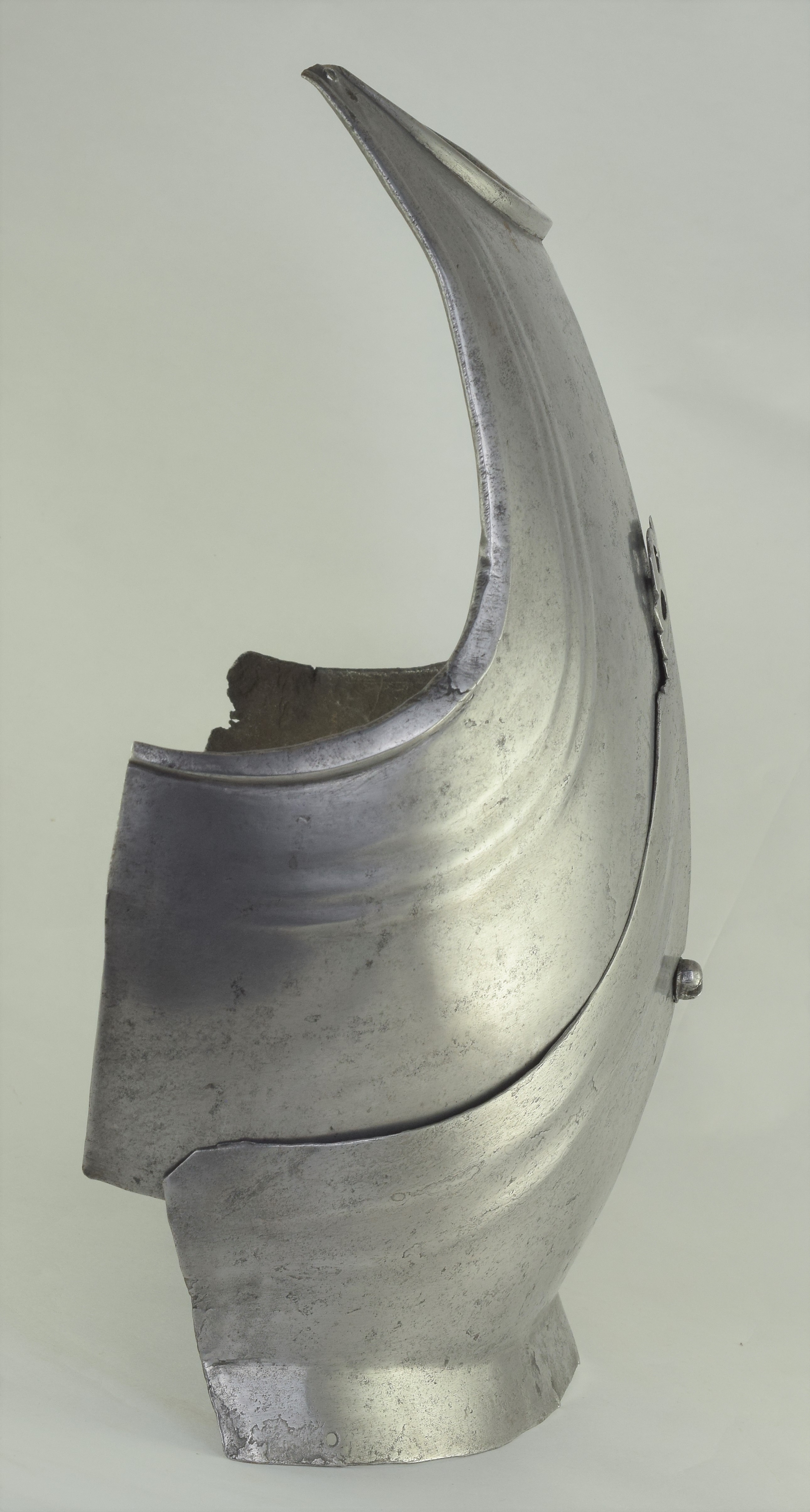 Composed. Formed of two pieces joined by a bolt. The main plate with a low medial ridge, plain angular, outward turned rolls at the neck and arm holes. The roll at the neck forming a vertical front edge then rounded over the top. The roll tapers nicely at the ends. The arm rolls of similar, but not as nicely executed form. The arm holes each with three one sided step flutes parallel to the rolls. Plackart rising to a central squared off point pierced with four hearts, the center with a vertical keel. The upper edges of the plackart with two parallel flutes. The outer of these is a step, the next seems symmetric. Bottom edge of the plackart flared to carry a fauld. The parts have been together for all of its modern history, but they are associated. The plackart and upper are secured to each other by a central bolt which threads directly into one of 4 holes pierced in the upper. The bolt is likely from the same period and the threads fit the threads in the upper. The top hole is cleanly cut, the bottom three are significantly mushroomed inward around the edges. As currently displayed, it sits a little tall, and the waist line will appear to be straighter than it would have been originally. Plates show signs of delamination and wear through cleaning. There are two small dents in the upper breast. These look like they may have been caused by impact from a square pointed weapon.