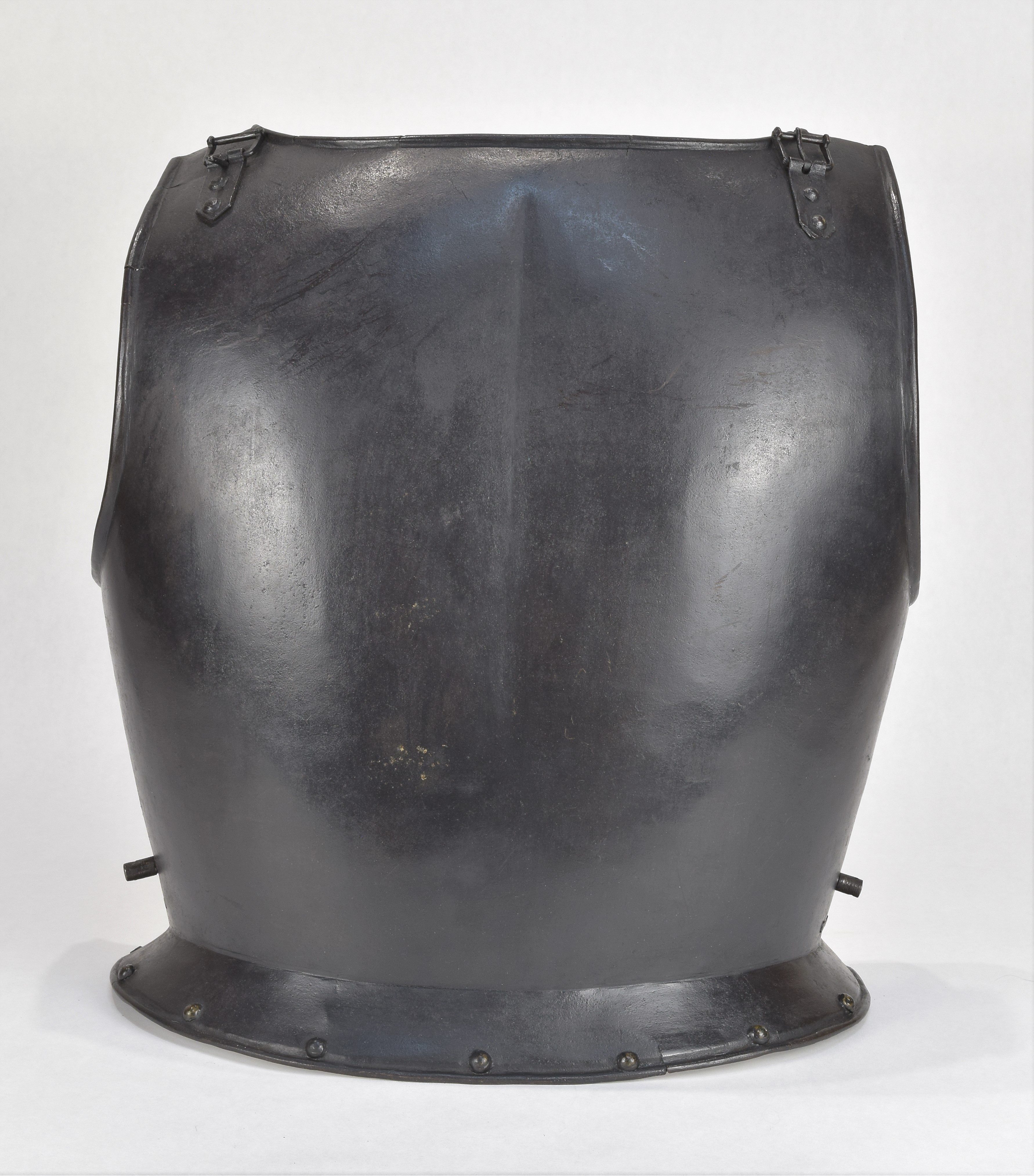 Well matched breast and back. Breast with with a central crease extending to a simple, narrow peascod at the waist. The bottom of the breast flared to carry the tassets. Neck and arm holes with simple inward turned rolls. Right side of the breast with a small proof mark. Breast of heavier, shot proof weight. Well matched backplate formed to the shoulder blades and with simple inward turns at the neck and arms, and narrow flare at the waist bordered by a narrow inward turned roll with a narrow recess. Recess bordered by a row of rivets to secure a lining strip. Breast with replaced leather straps at the shoulders. Back with matching rectangular buckles mounted with pointed metal mounting plates at each shoulder. Breast and back secured at the sides by a peg in the backplate and hinged mounts in the breastplate. These are an older replacement for the original waist belt that would have been secured to the backplate at each side at the (now filled) holes.