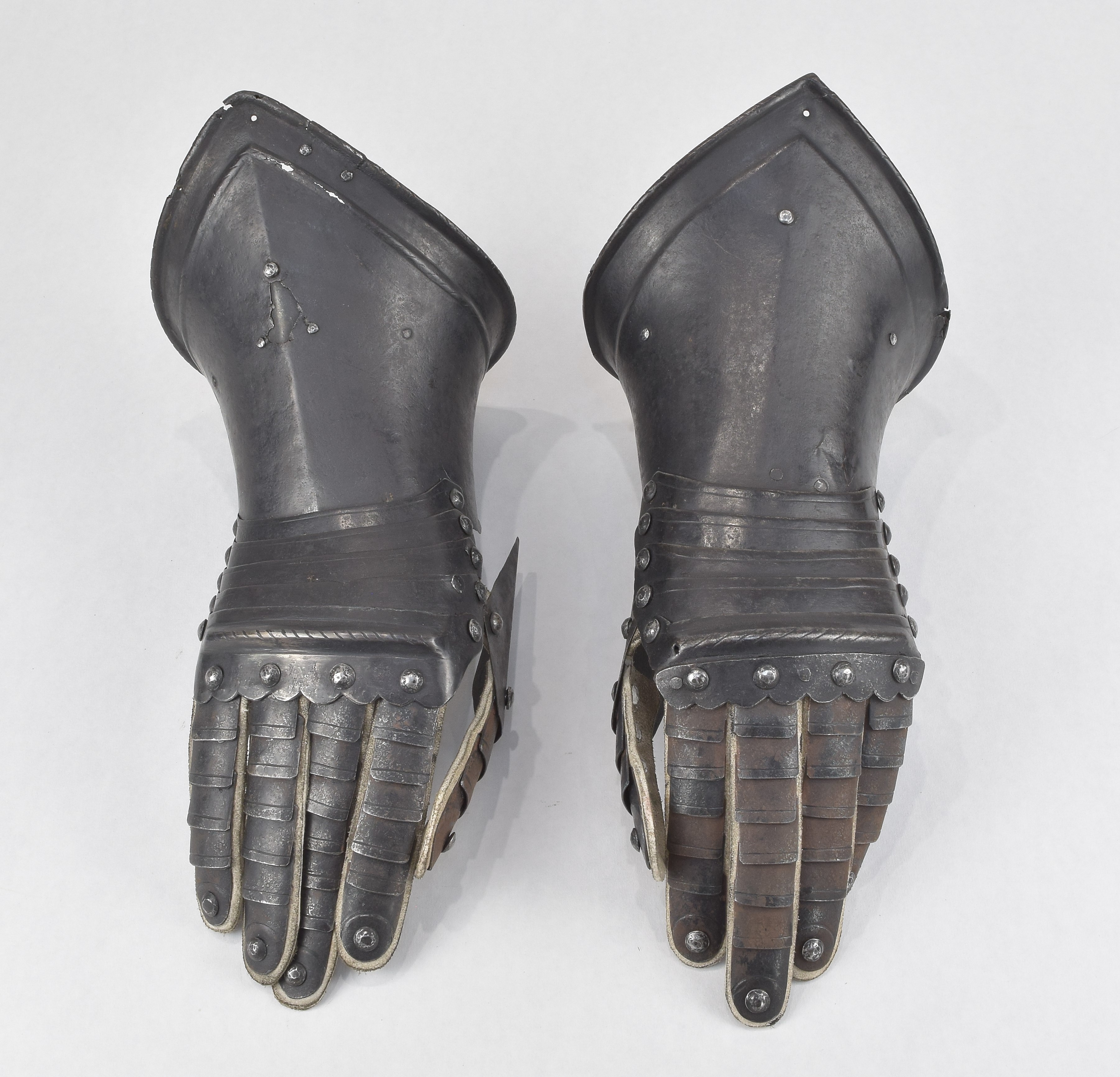One piece bell cuffs with 4 plate back of hand and a knuckle plate with a raised roped ridge. Hand plates with a single engraved line parallel to the edge. Cuffs with lightly roped inward turned rolls with parallel recessed border at the edge. Main thumb plate secured to the metacarpal by a leather strip. Scaled fingers and thump plates secured to leather. Restorations to the cuffs, fingers and thumbs by David Hewitt in 2021. Associated with the rest of the harness in 2021. Reasonably well matched, but liklely Italian and earlier.