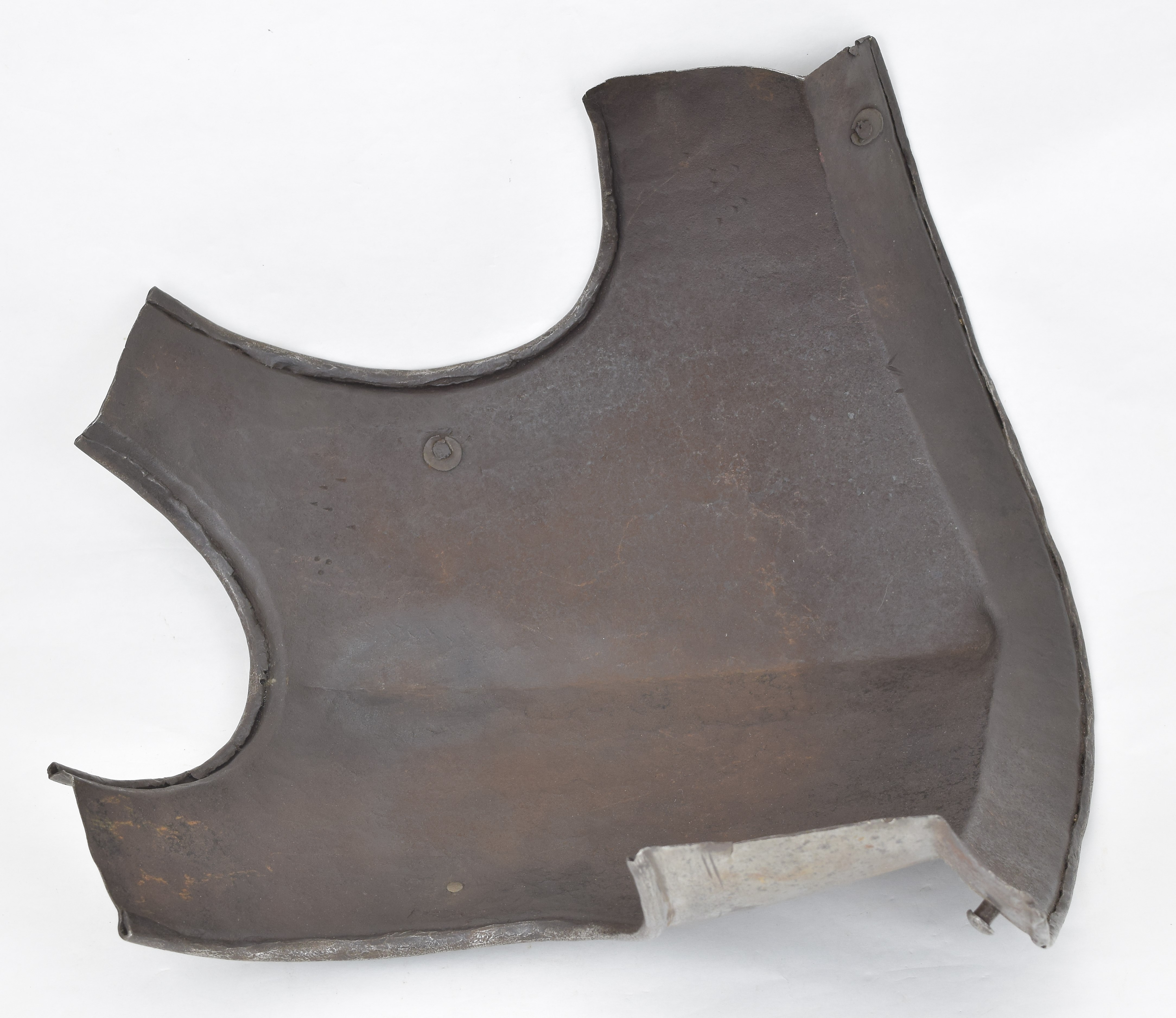 For use by a Harquebusier. Low medial ridge down out to a blunt point above a short flare. The lower edge, neck and arms with internally turned rolled edges. The rolls at the arms and base with parallel pairs of incised lines. The neck with a short, integral standing collar. Two studs for the straps that would secure backplate. Two studs on the flare. These may be later, or they would be used so secure tassets.