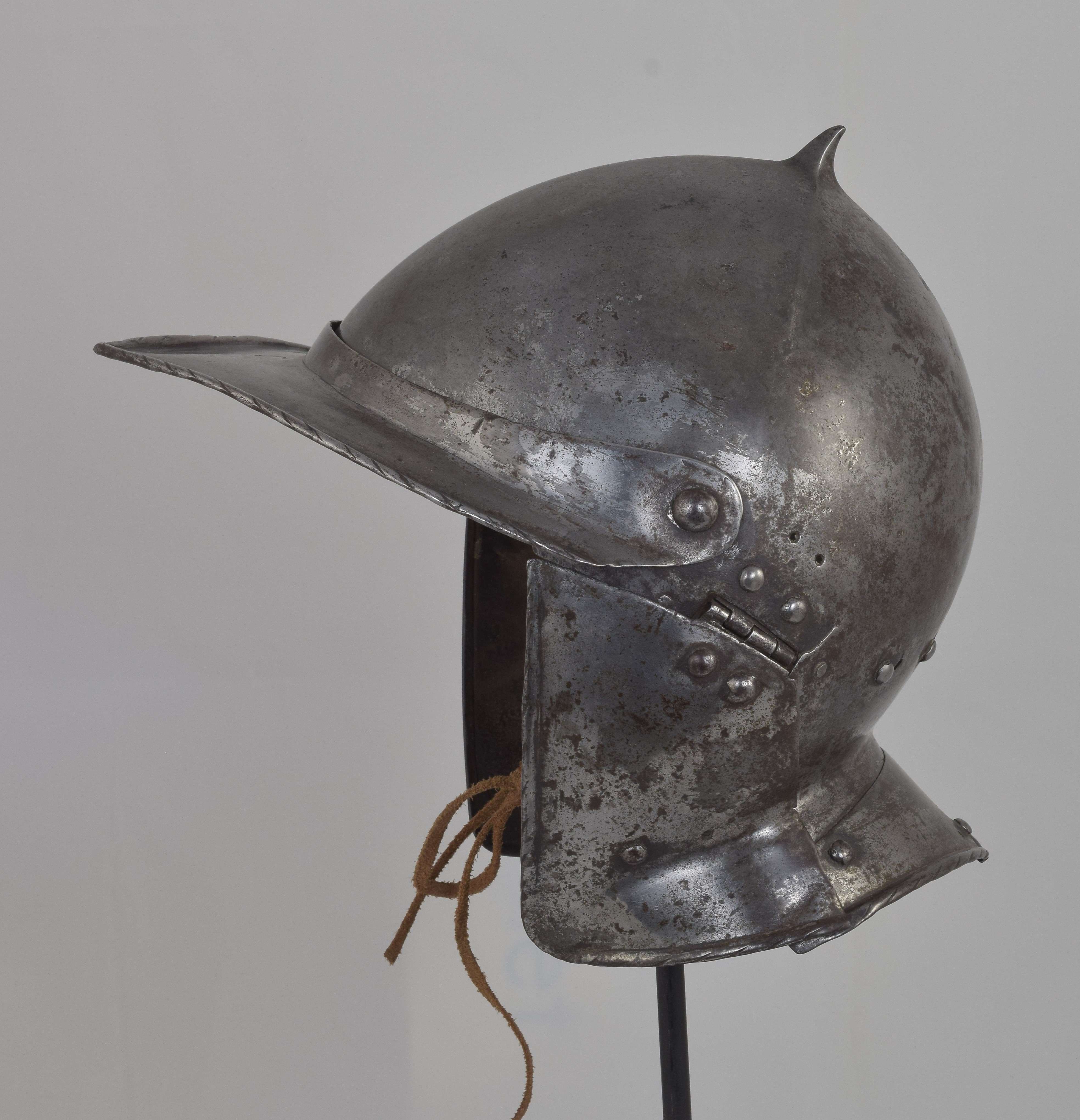 Atypical early form - the bowl of rounded form with four creases and coming to a small bent point at the top center. The bowl covering the top, front and back of the head and flared at the back for a single neck lame. Sides of the face covered by cheek plates (the right a good replacement) and the front with a pivoted fall which comes to a point at the center. Edges of the fall, cheek plates and tail lame with inward turned, roped borders. The similar helmets illustrated in volume II of the KHM catalogue date the pieces with similar skulls to 1535. This piece is very closely related in shape and quality of construction to parts that survive from a large number of half armours that were bought by Vienna from Nuremberg in the 1540's. Marked on the outside of the fall with a Nuremberg shield mark (partially stamped) and on the inside of the fall with what appears to be an N in a circle (again, partial).