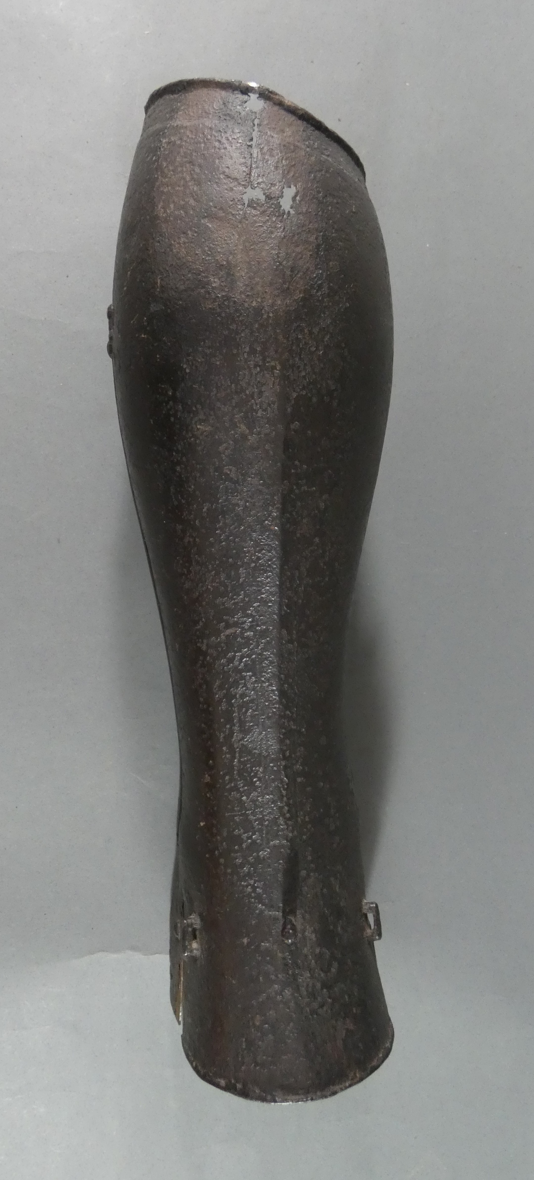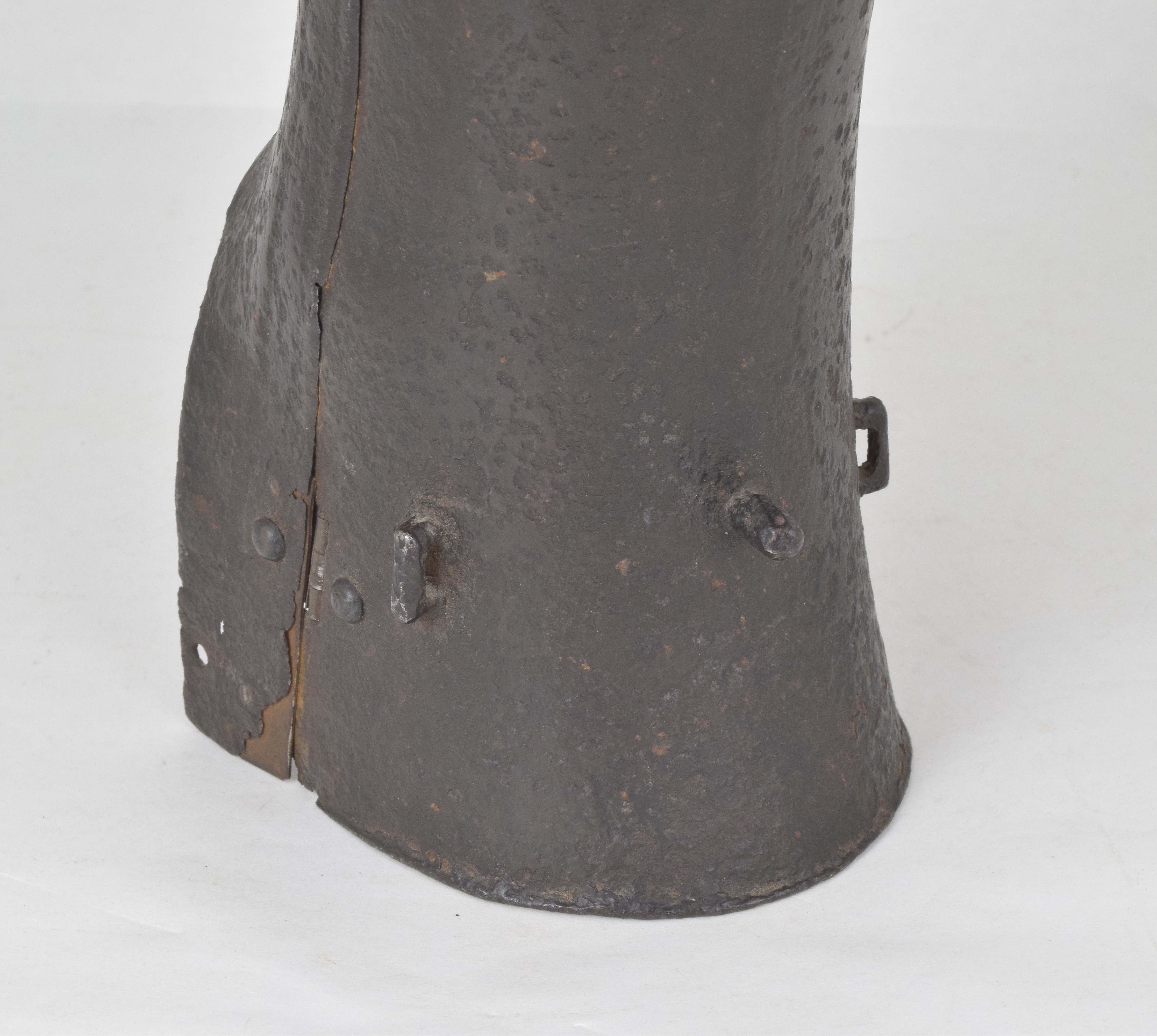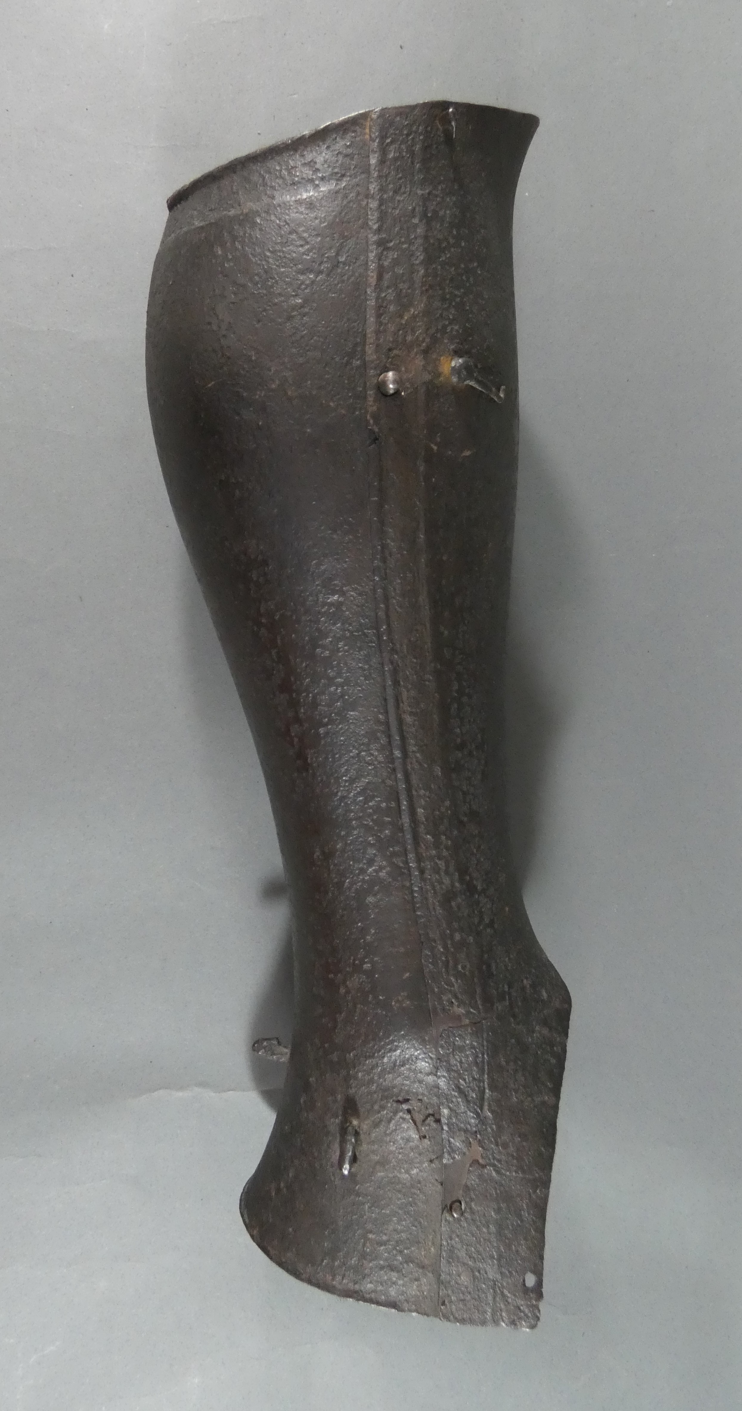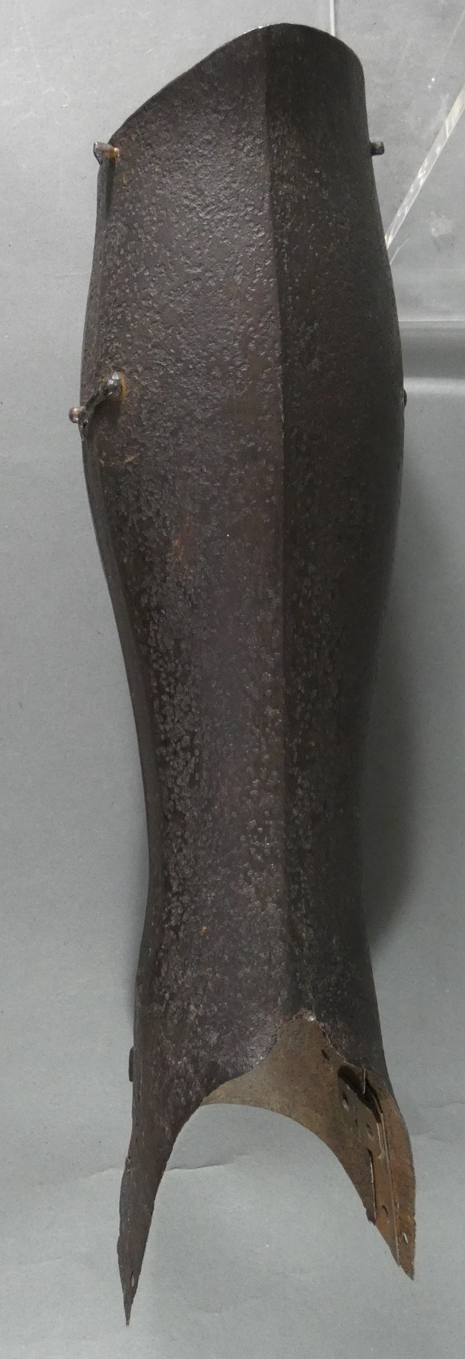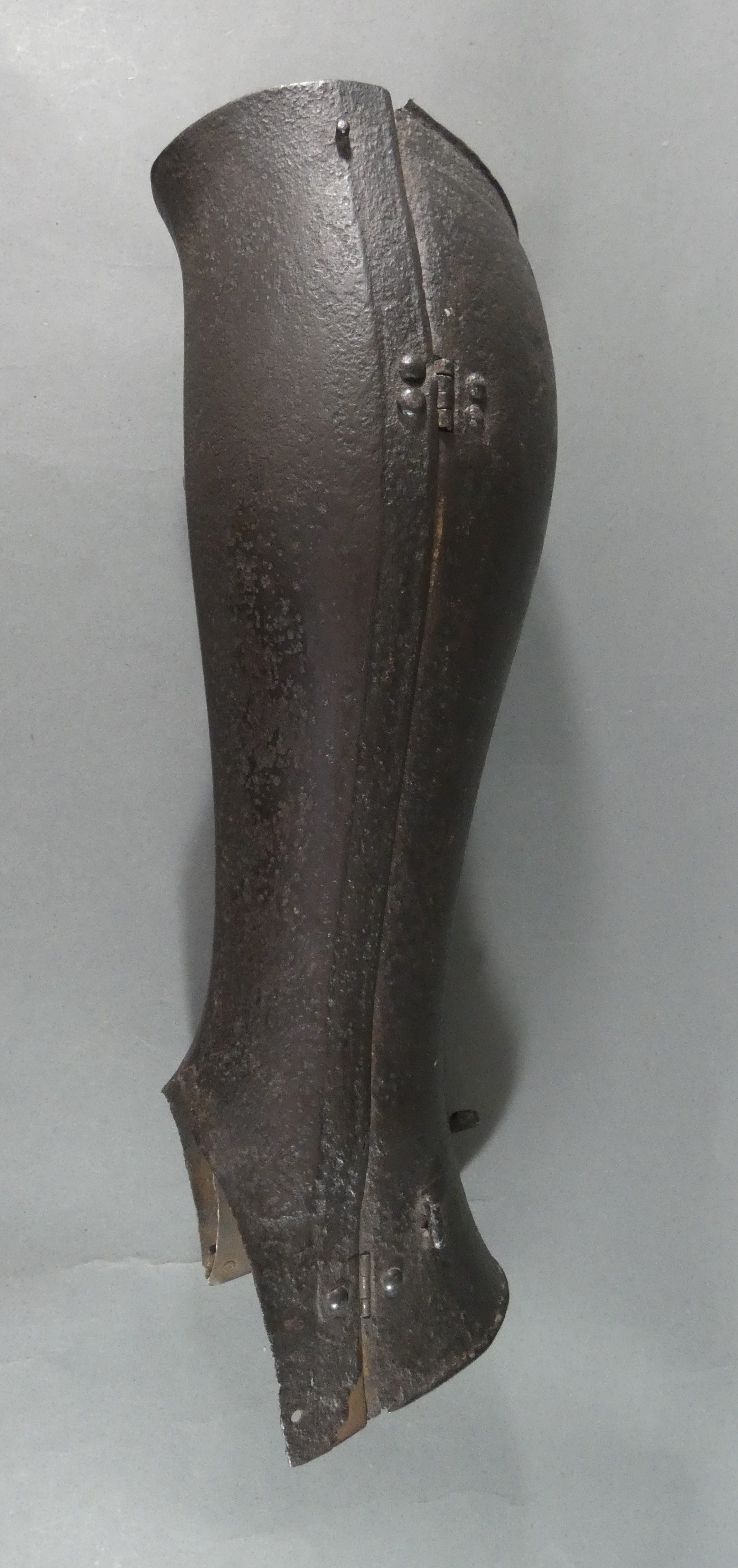 For the left leg. Consisting of two plates, front and back joined by two inset hinges on the outside and two pins on the inside. The top pin with a hook engaging a hole in the pin. Good full form rising high at the top and fully covering the heel. Fitted with pin and staples to secure the spur. Central creases in the front and back. Recessed border at the back of the knee and at the sides of the front plate. Narrow inward turned roped border at the back of the knee and a very fine outward turned roll at the bottom edge of the rear plate. Heavily oxidized with some holing. Modern patches at ankle. Pins and lower hinge replaced.