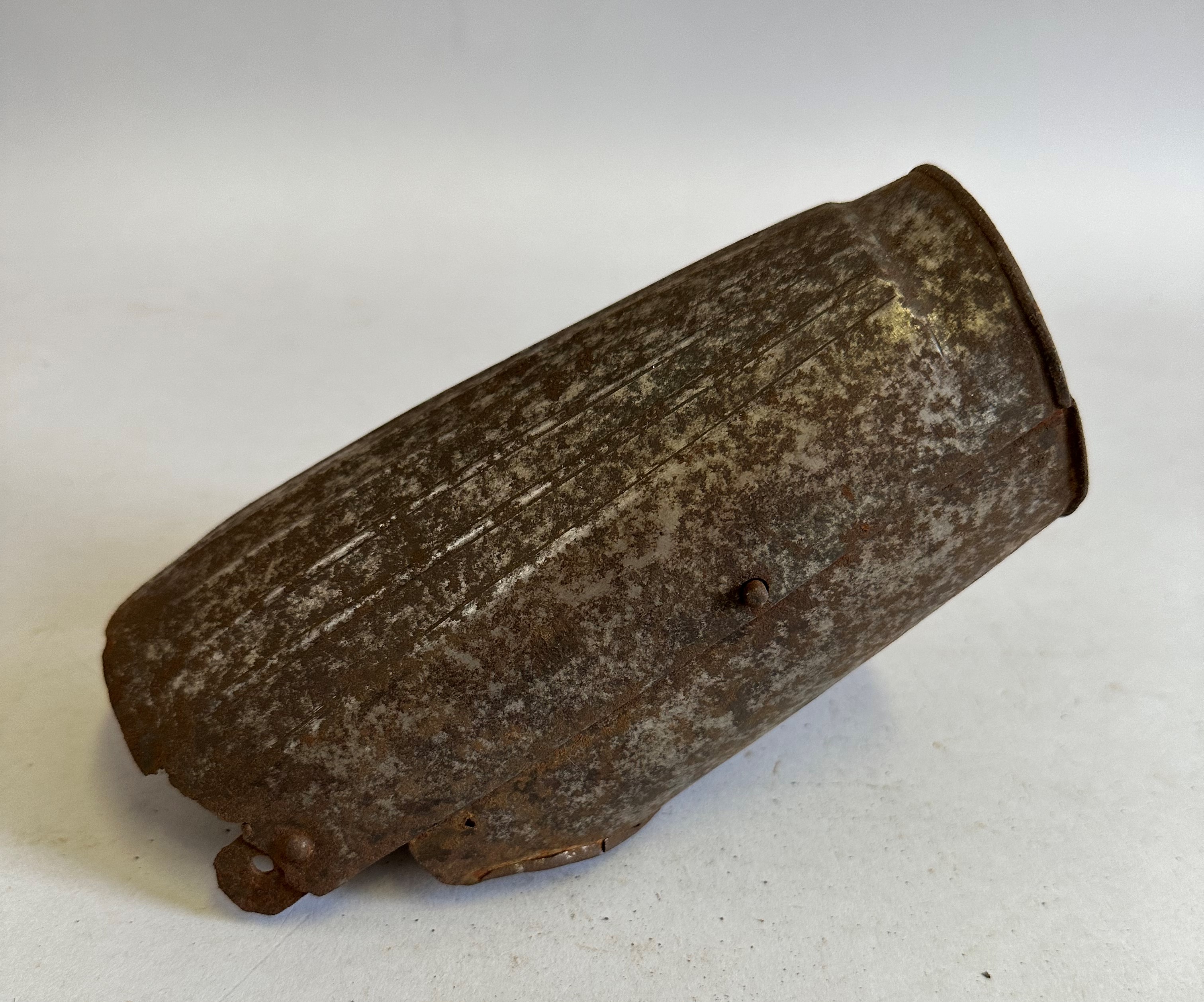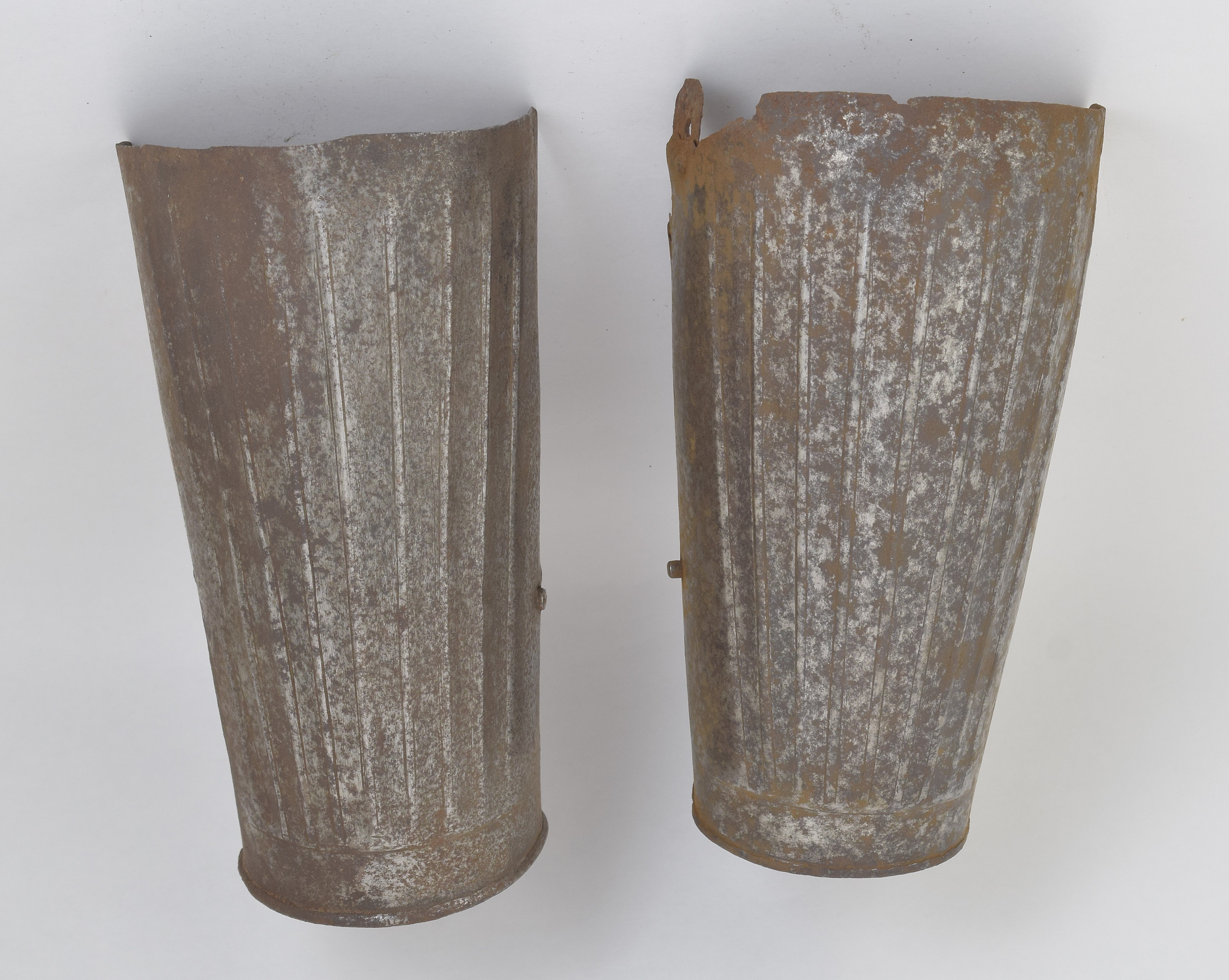 Formed of two plates. The outer vertically fluted with a recessed border parallel to the inward turned roll at the wrist. Plates secured by a hinge on one side and a pin on the innter plate engaging a hole in the outer plate. Pierced for rivets to secure lames for the (lost) elbow cop. One vambrace is of the period, the other appears to be a pretty good 19th/20th c. copy made to match.