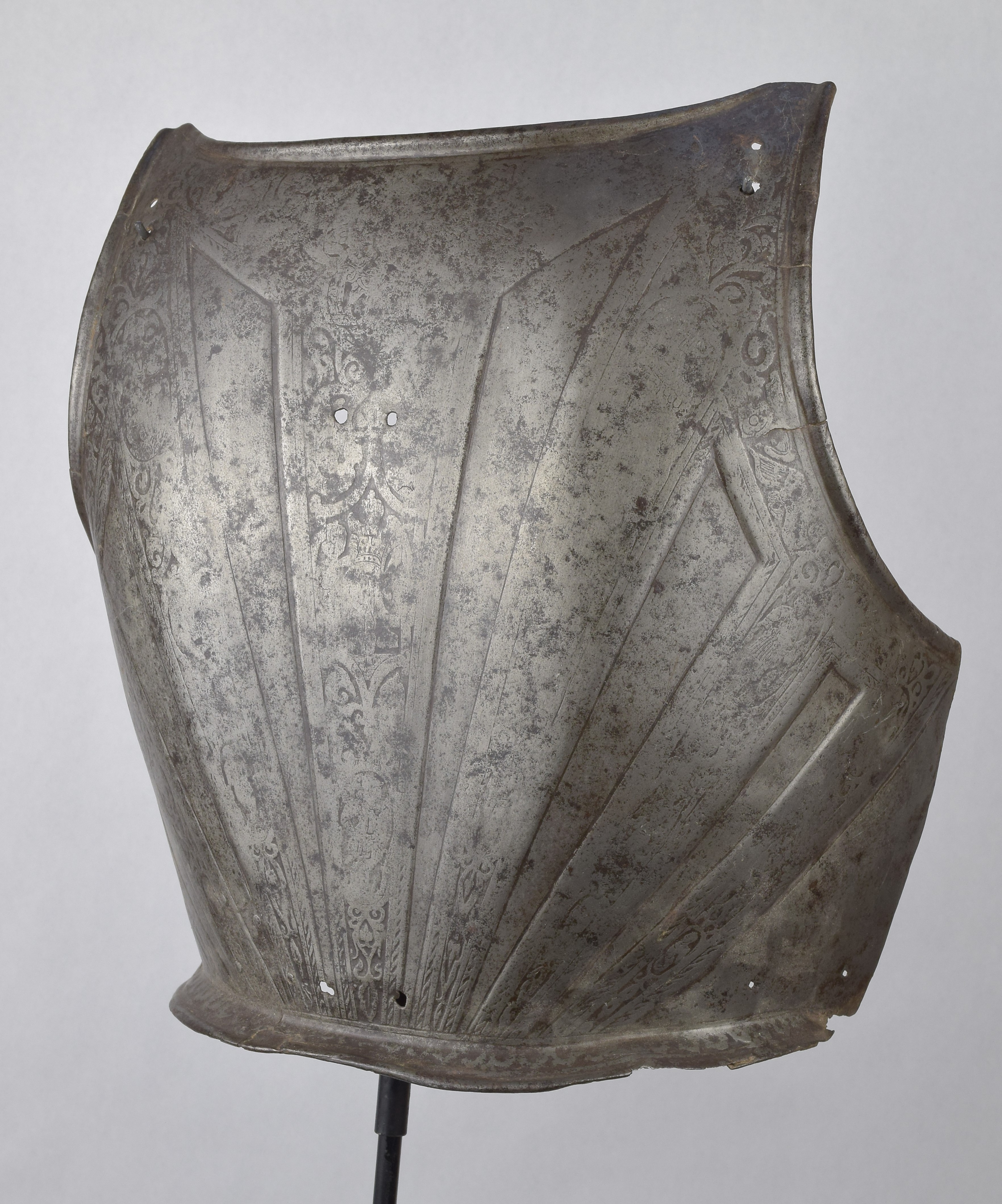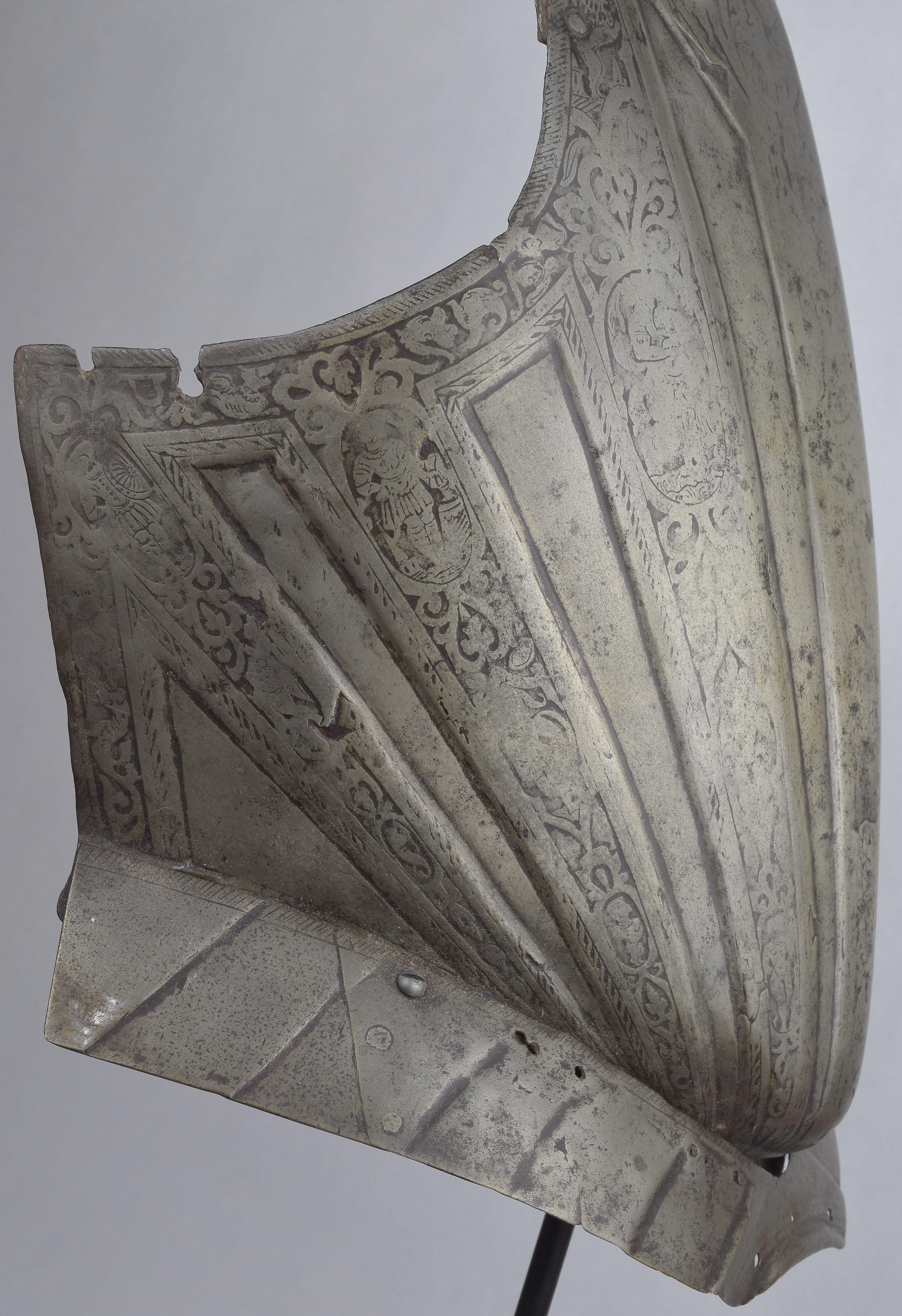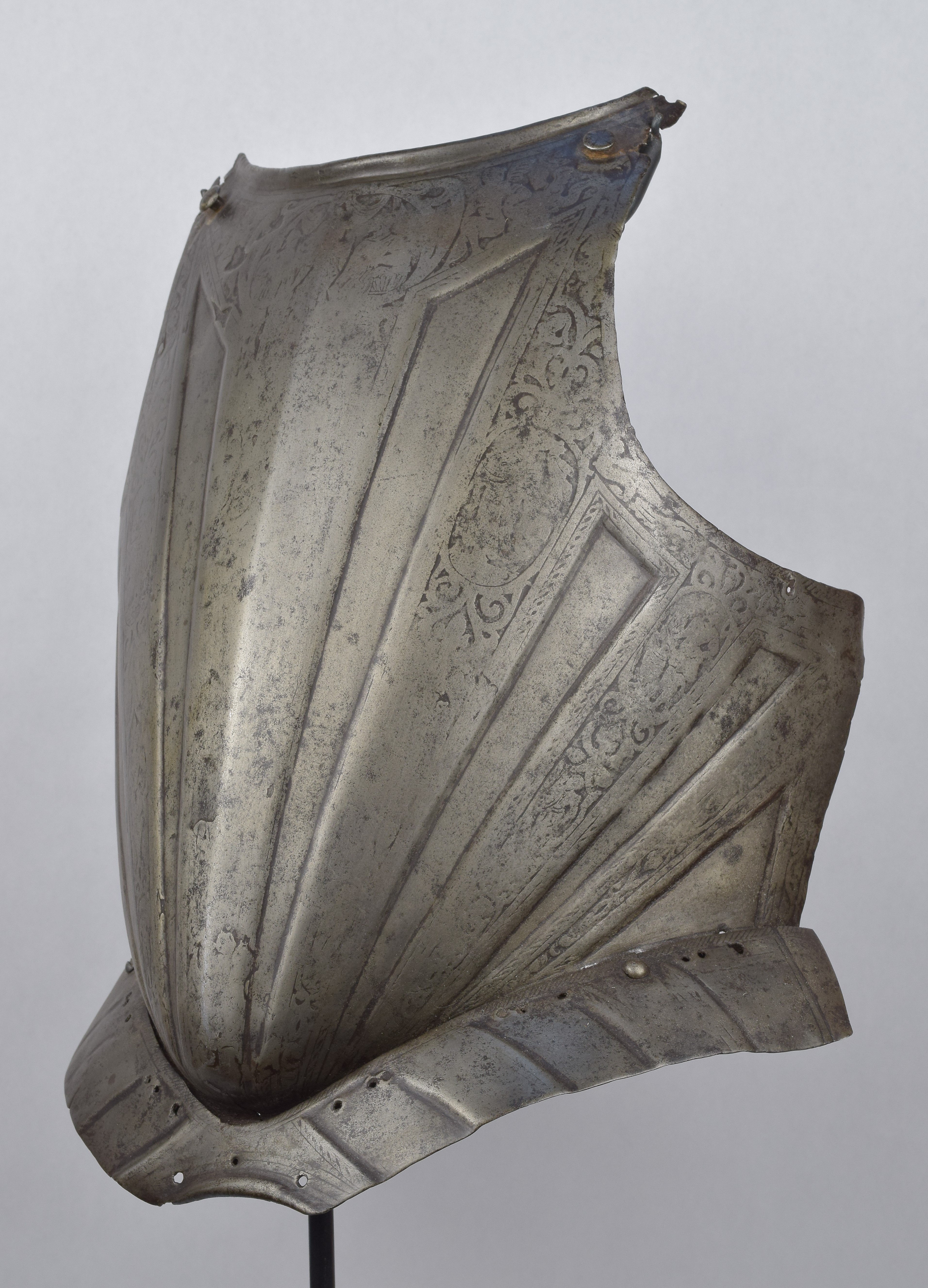 This style of raised and recessed bands with etching seems to be relatively rare. A similar breastplate is preserved in the Fitzwilliam Museum in Cambridge (HEN.M.7A-1933) described as North Italian c. 1580.