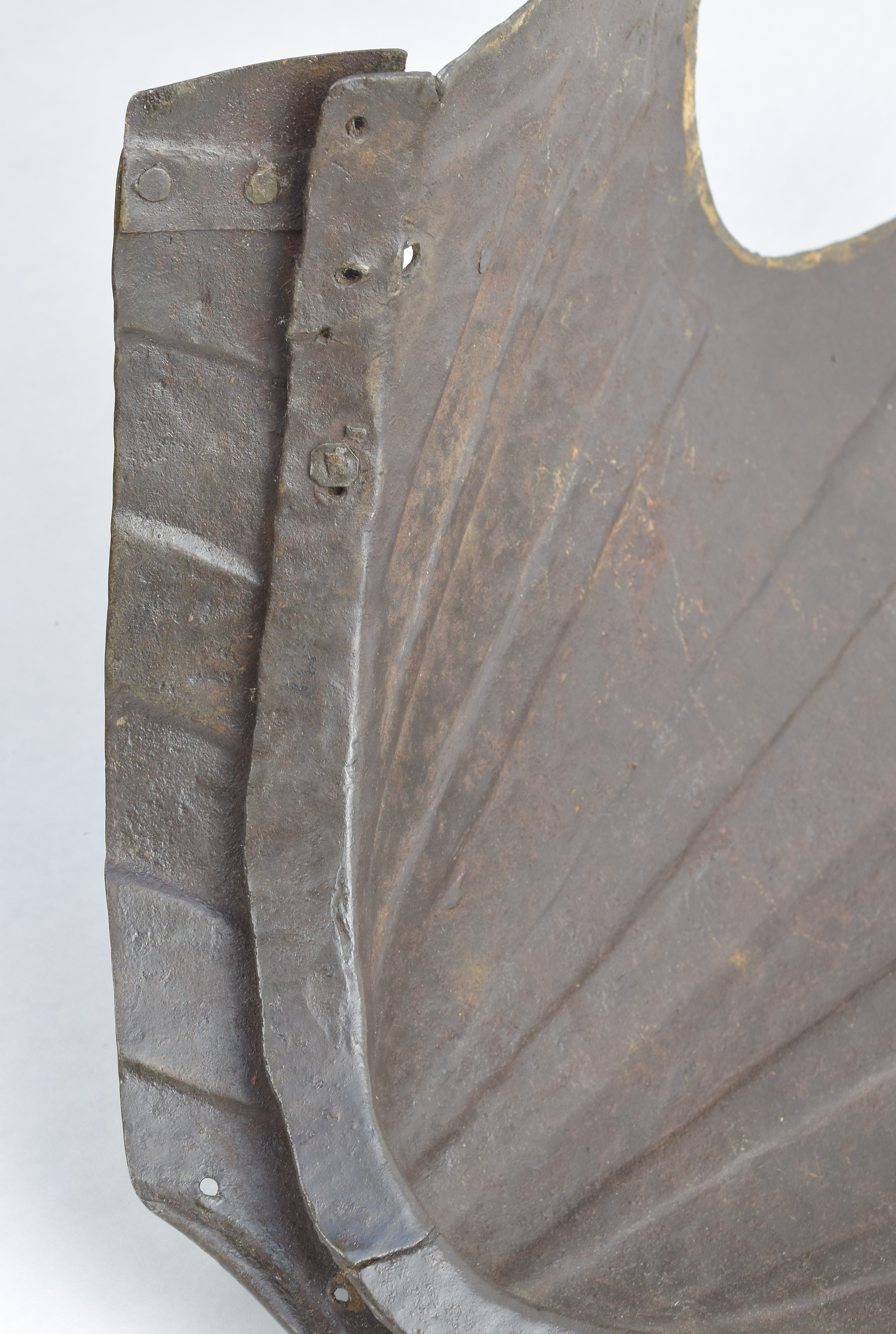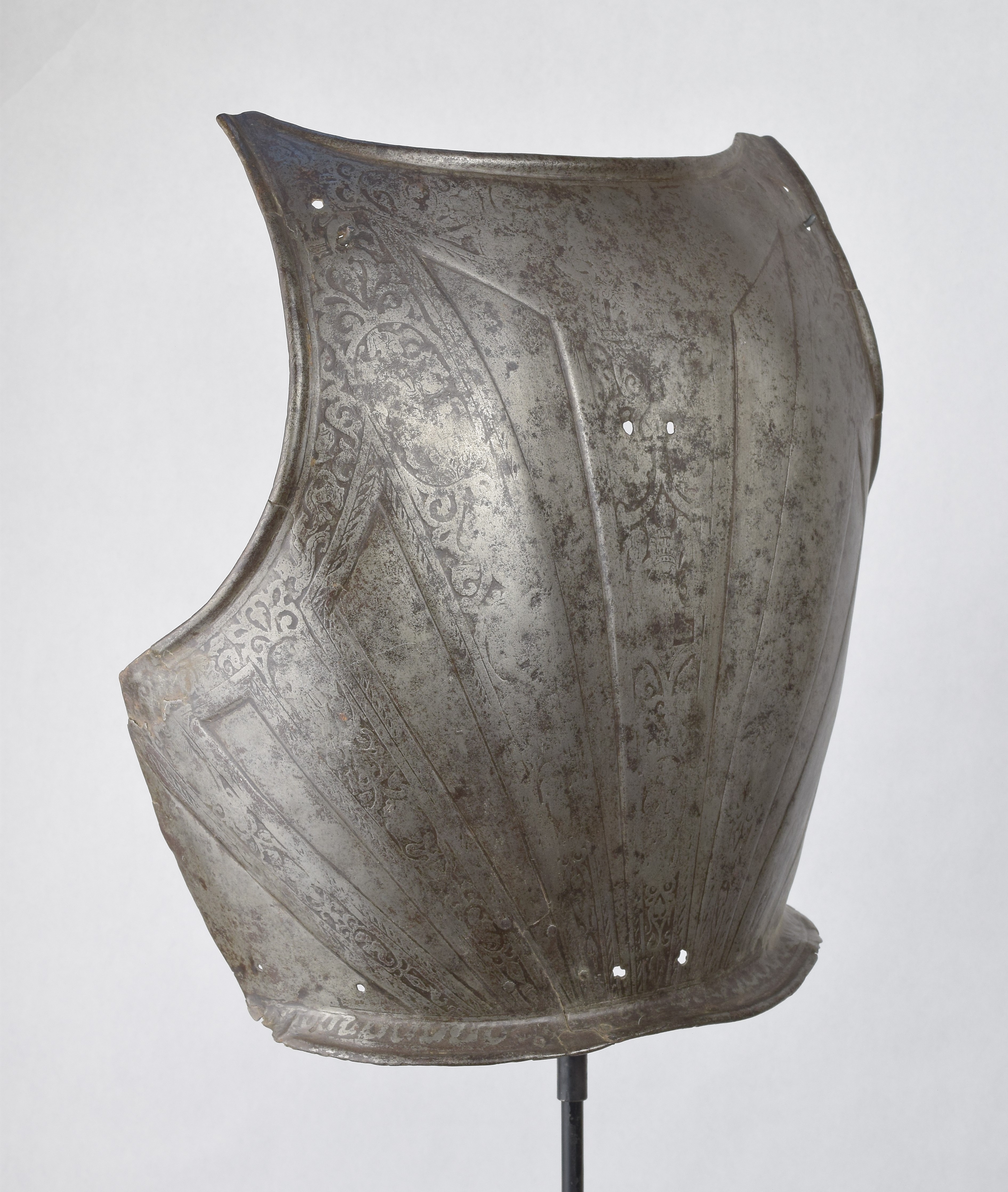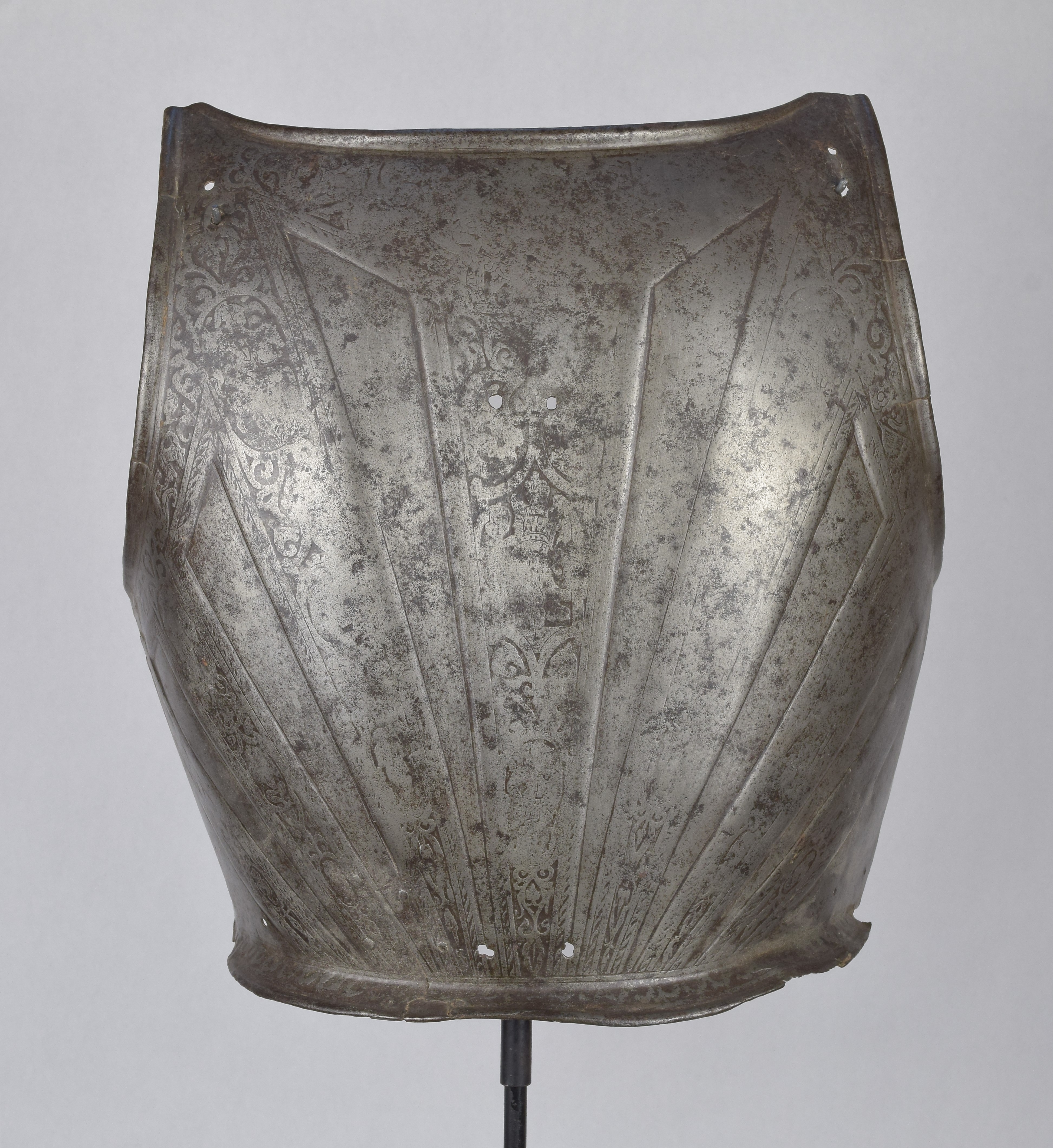This style of raised and recessed bands with etching seems to be relatively rare. A similar breastplate is preserved in the Fitzwilliam Museum in Cambridge (HEN.M.7A-1933) described as North Italian c. 1580.