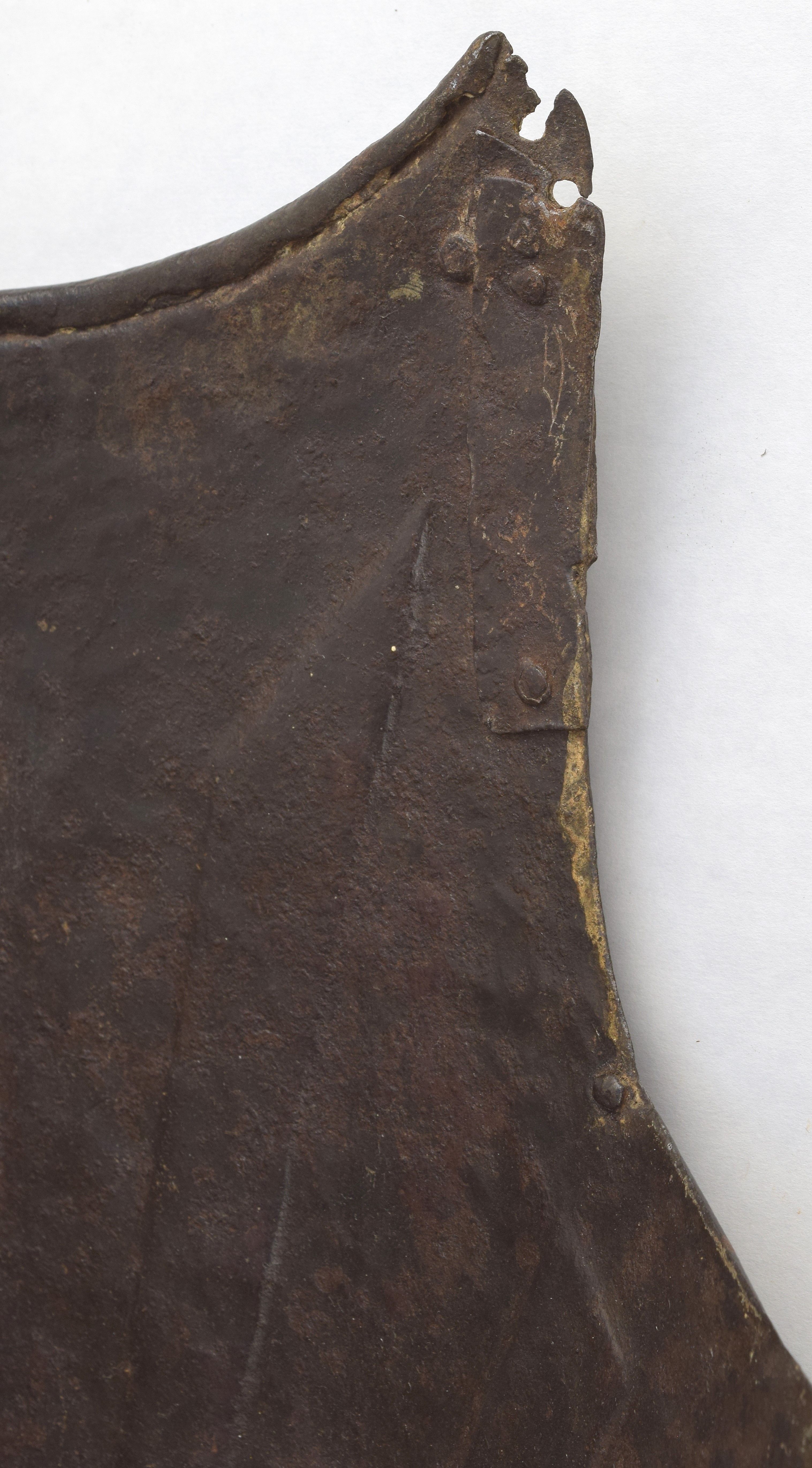 It appears that the breast has been adapted for later use. The original holes for the gussets and straps at the shoulders have been augmented by a pair of radially decorated studs. These would have been used to secure steel covered shoulder straps that were used in the 17th c. I expect that the gussets were removed at the same time. It appears that many later 16th c. breastplates re-used in the 17th c. had their gussets removed. In addition there is an internally riveted strip at the right shoulder. This seems to be older than the patches in the fauld lame. There is no corresponding crack or hole in the breastplate. It appears that this is part of an originally larger plate. There is an additional rivet lower and the outer edge of the plate extends past the main edge of the breastplate and it seems that it was flared out in front. This may have been one of the odd extensions added to breastplates in the 17th c. that are described as being used to support the stock of longarms. A breastplate which retains one of these plates was found at the Jordan's Journey site associated with Jamestown VA.