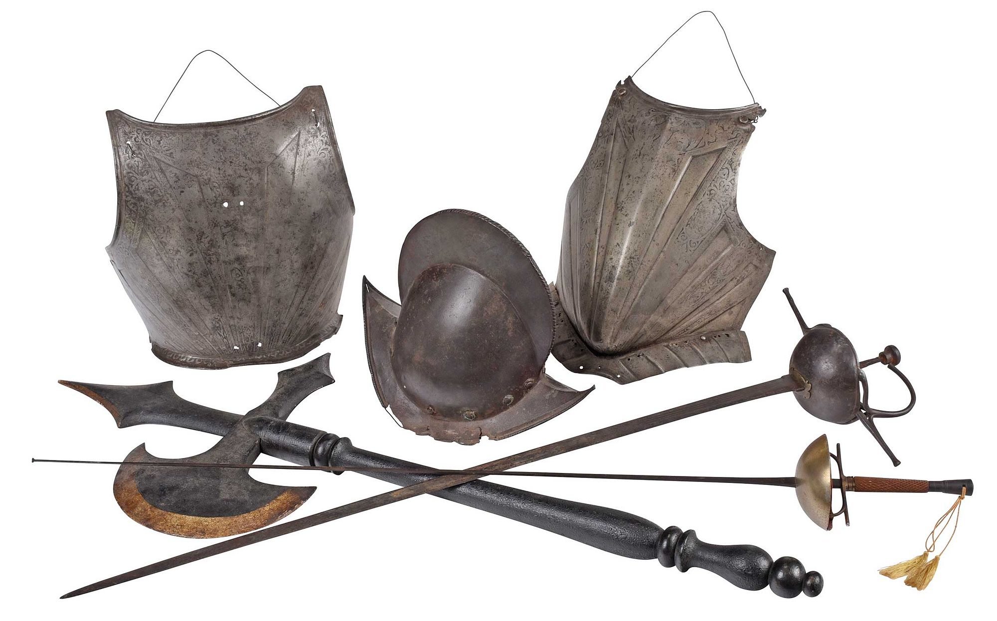 Well matched. Probably originally a cuirass. Breast with blunt peascod form at the waist. Inward turned roped roll at the neck. Single fauld lame (small patch on one end, larger patch on the other). Arm gussets lost. Some losses at the upper corners. Each end of the fauld lame with a modern patch, one forming a small end extension, the other much larger. Surface with recessed and raised areas. The raised areas mimic a typical "Pisan" pattern of bands of etching. The raised areas forming a border at the neck, along the arm holes and down the sides of the breastplate and at the neck and armholes of the back. There is no need for a border on the sides of the backplate, these are overlapped by the breast in use. Both breast and back have a central raised band with three three additional bands on each side radiating from the bottom. Raised areas extensively etched (and heavily worn). Matching back plate with matching decoration in similar condition. Neck, arm holes and waist flare with inward turned roped rolls. Etching also heavily worn and with later pair of holes at the center back. One internal riveted patch at the waist. Both breast and back show minor and larger signs of delamination.