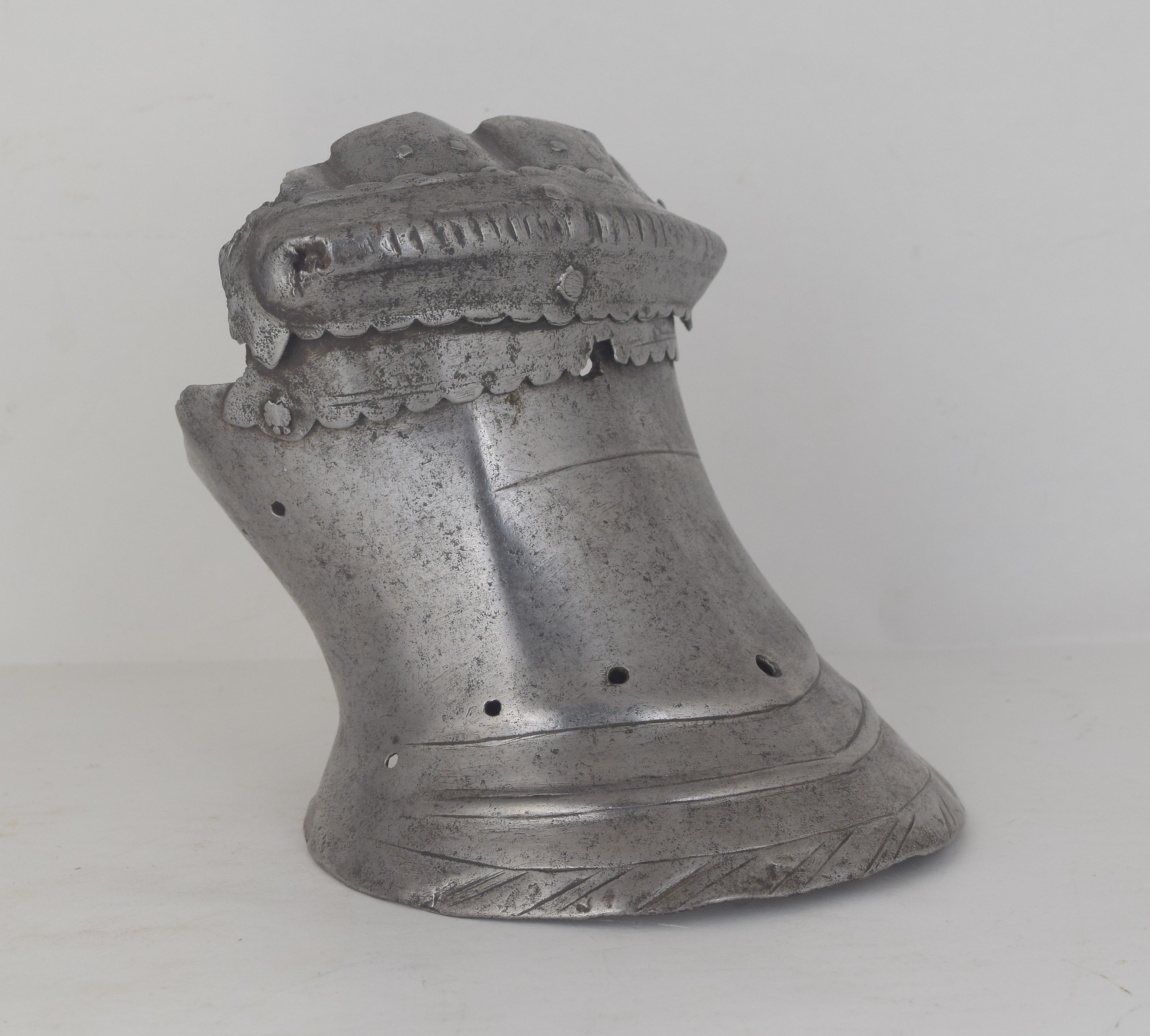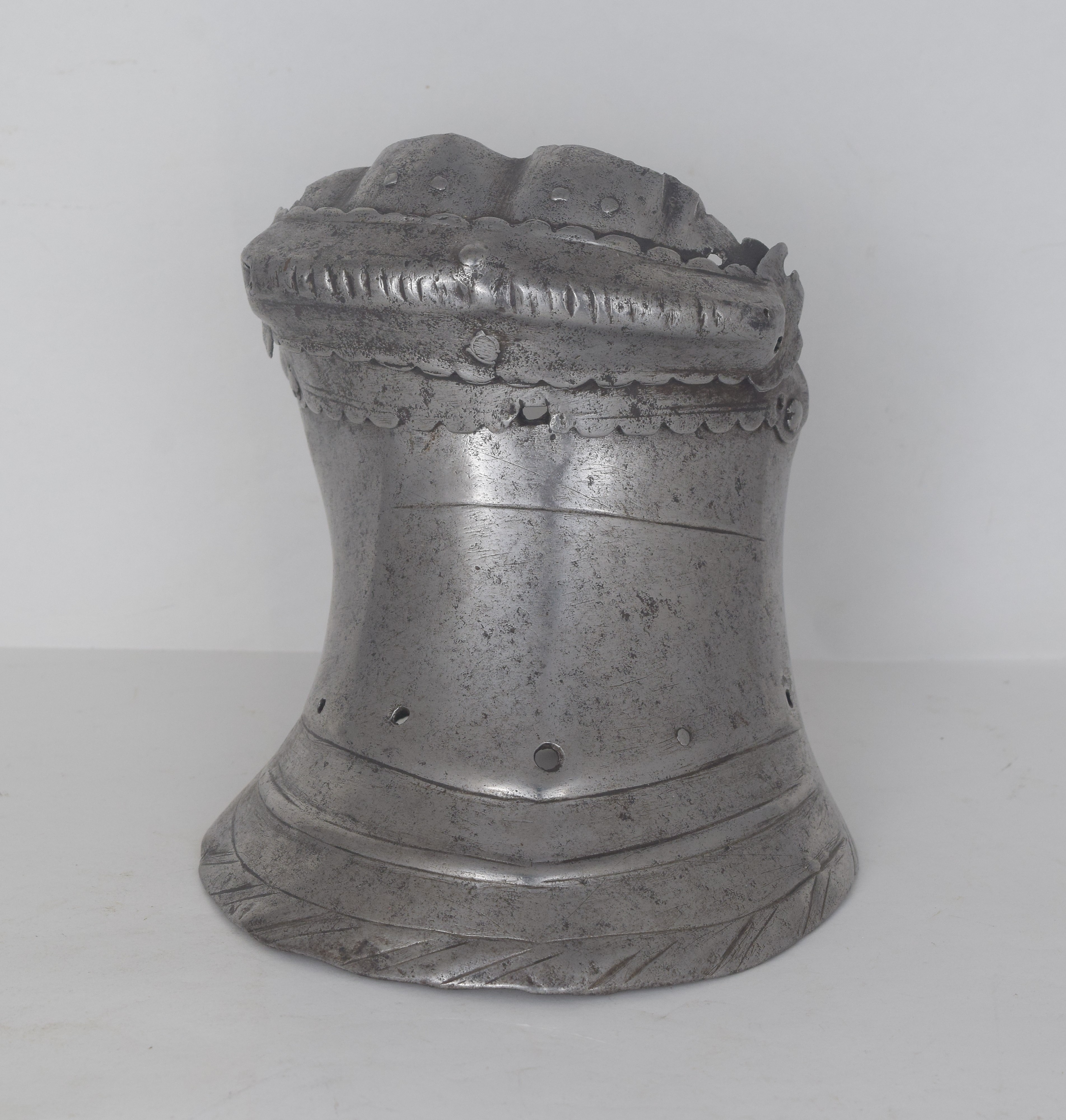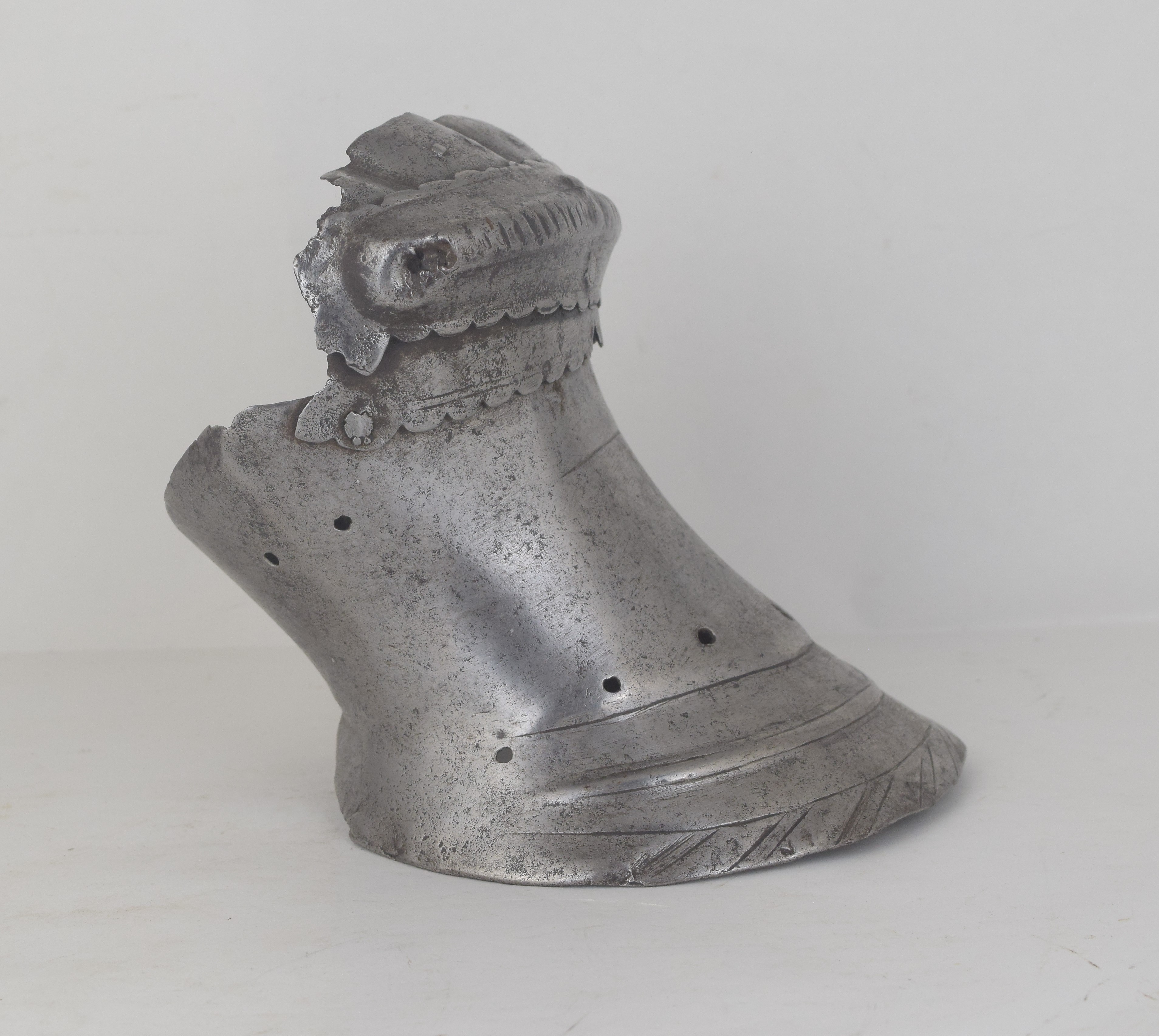 Western European, possibly Flemish. One piece slightly flared cuff extending over the base of the hand. Single metacarpal plate. Roped knuckle plate and a single finger plate. The finger plate retains pairs of rivets in each finger, indicating that it was originally equiped with scaled finger plates for the individual fingers. The cuff with a crease aligned with the center of the back of the hand and two additional creases at the sides forming a "boxed" shape. There ia a single horizontal engraved line at the outside of the wrist which extends between the boxed creases. The border of the cuff formed with a file roped inward turn and a doubly recessed border. The border is interesting - the inward turn is narrow but the "roped" area is much wider. The exposed interior shows that the "roping" is actually partially embossed. Edges of the metacarpal and knuckle plate with scalloped edges. The overall form of the cuff and back of hand is similar to item number A-207. This one appears to be somewhat earlier. The ends of the knuckle plate are lost, so the original pivots have been replaced with rivets that stabilize the plates into position. A very similar pair of gauntlets are displayed with the "Pembroke" armor in the Royal Armouries (II.164), where the description indicates that they are "associated" with the armor.