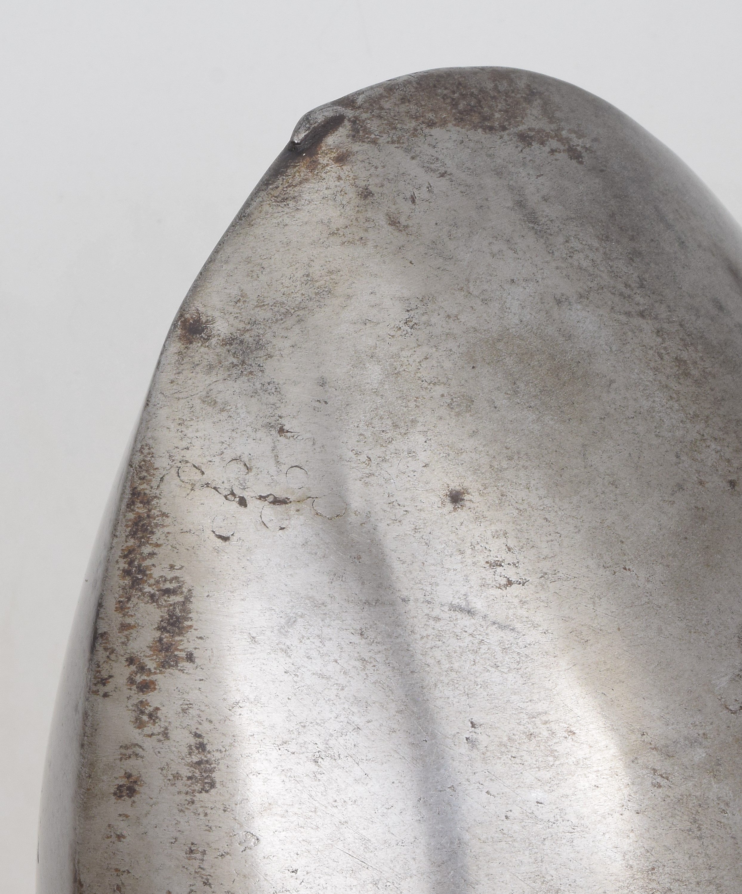Tall one piece bowl with very small stalk at the point, central crease and narrow slightly downturned brim. Brim with plain inward turned roll at the edge with a narrow recessed groove at the inner side of the roll. At least a portion of the roll is turned over wire - part of which is exposed. Line of holes at the base of the skull for (lost) lining rivets. Small patches of oxidation - most of the discoloration was due to old varnish which has since been cleaned. There is a small old (probably working life) internal rivited patch in the upper rear right portion of the bowl near the crease securing what looks like a small crack.