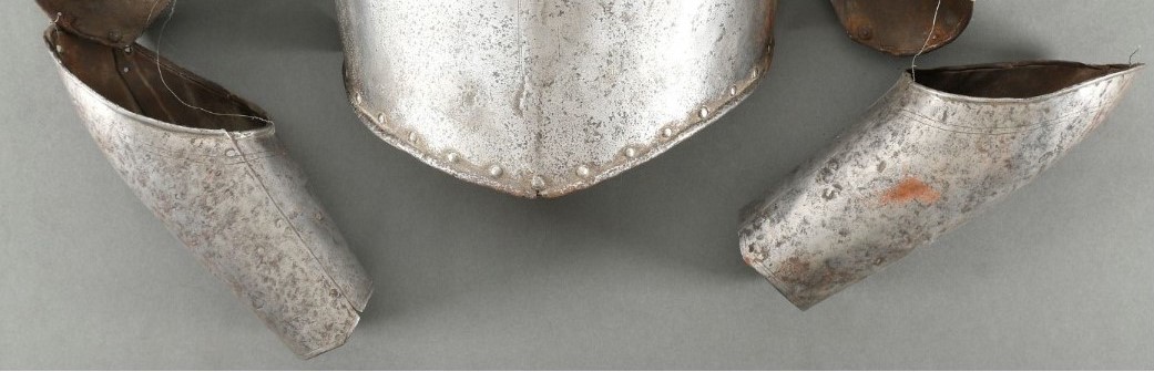 Formed of two plates. The outer shaped to the elbow. Inward turned rolls at the upper edge. Wrist decorated with single incised line. Hands missing. Inventory number "2000.6.51" in red paint on the inside of the left.
