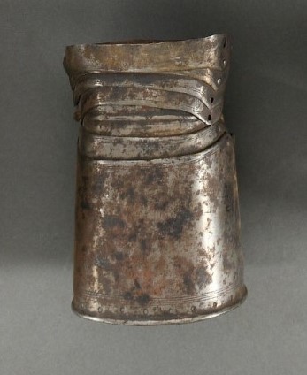 Cuff and 5 plates covering the wrist and metacarpal. Triple incised lines at the edges of the plates. Central plate underlapping both a small cuff plate and 4 metacarpal plates. Central plate with horizontal raised ridge. Atypically for this date, the rivets include slots on the interior plates allowing for sideways movement. Cuff of a single plate with a riveted overlapped seam at the inside of the wrist. Some rivets lost. The cuff is narrow and almost tubular. The edge of the cuff with a very narrow plain roll. There is a row of small, closely spaced holes inside the roll at the edge of the cuff. It would appear that these would have been used to stitch the glove or lining strip to the cuff in place of the more usual riveted leather band.
