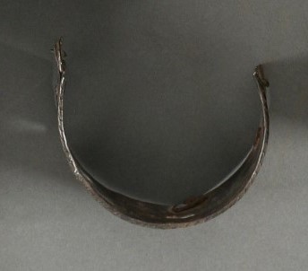 Lower lame of a pauldron. Bottom edge with an inward turned roped roll. Buckle on one end. Rectangular slot in the center to engage a turning pin in the armharness.