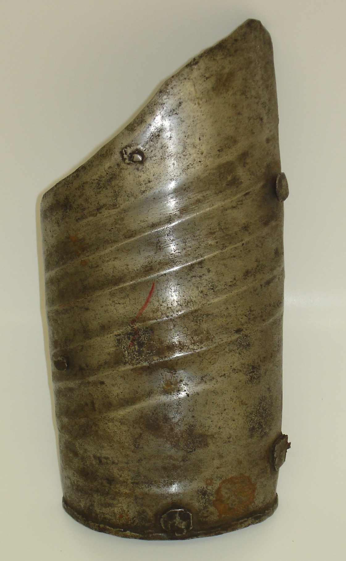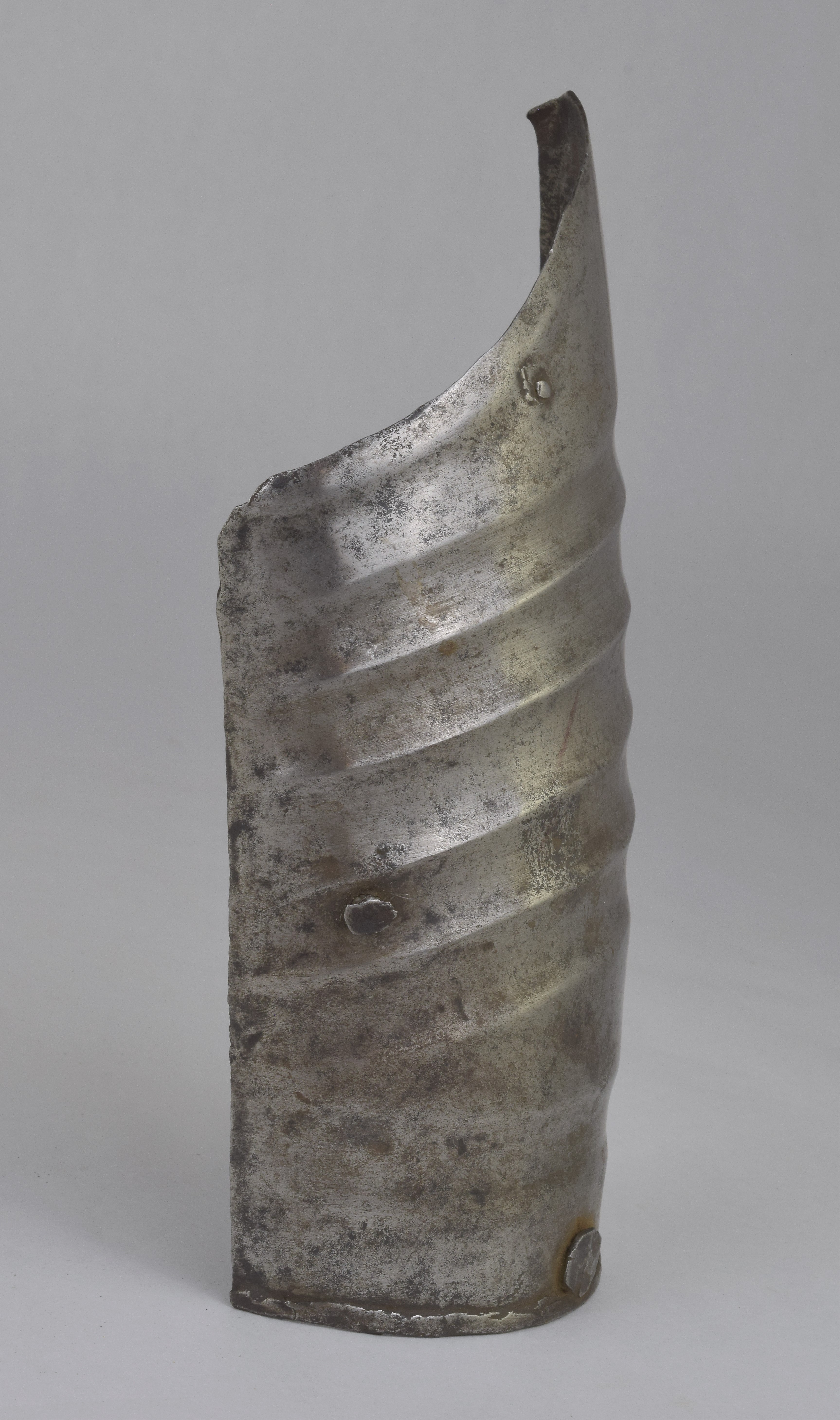 From a late 15th century German 'splint' vambrace. Surface covered with diagonal flutes. 2 horzontal flutes paralleling the wrist. Simple outward fold at the wrist. Inside includes a separate strip running vertically that forms a slot for the hand protection. This is very atypical - these were usually attached by placing a slot in the main plate. The vambrace covers the outer third of the arm.