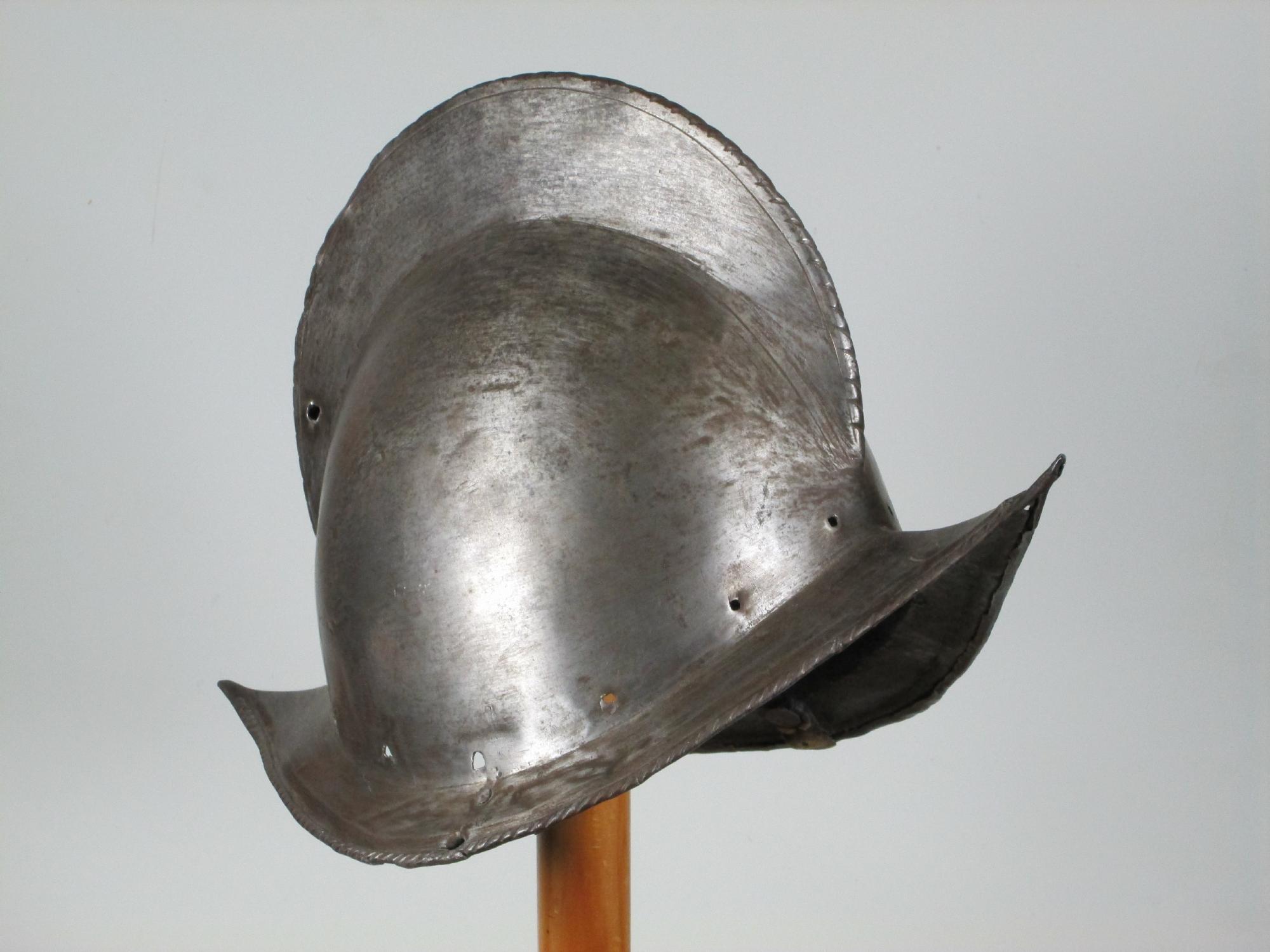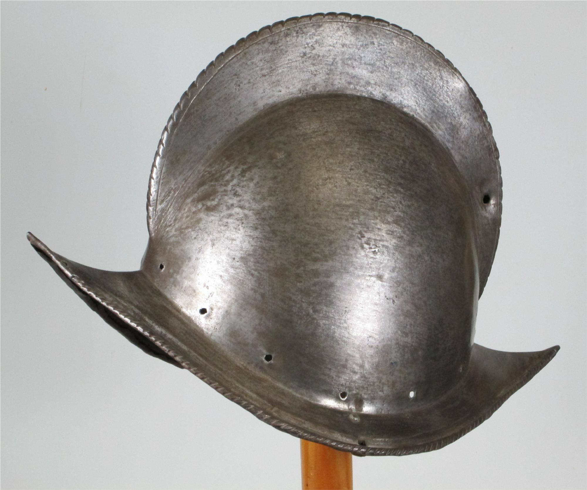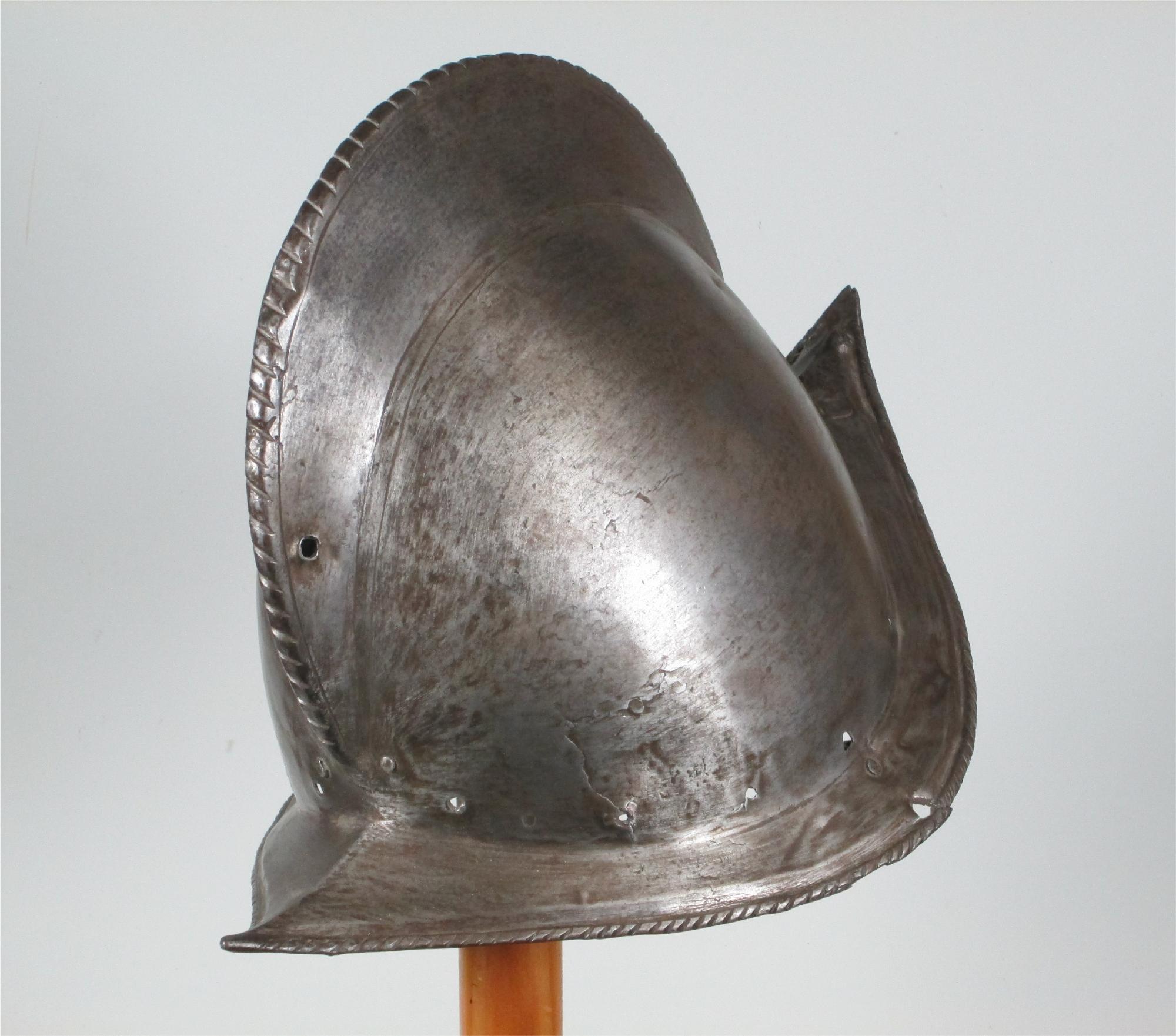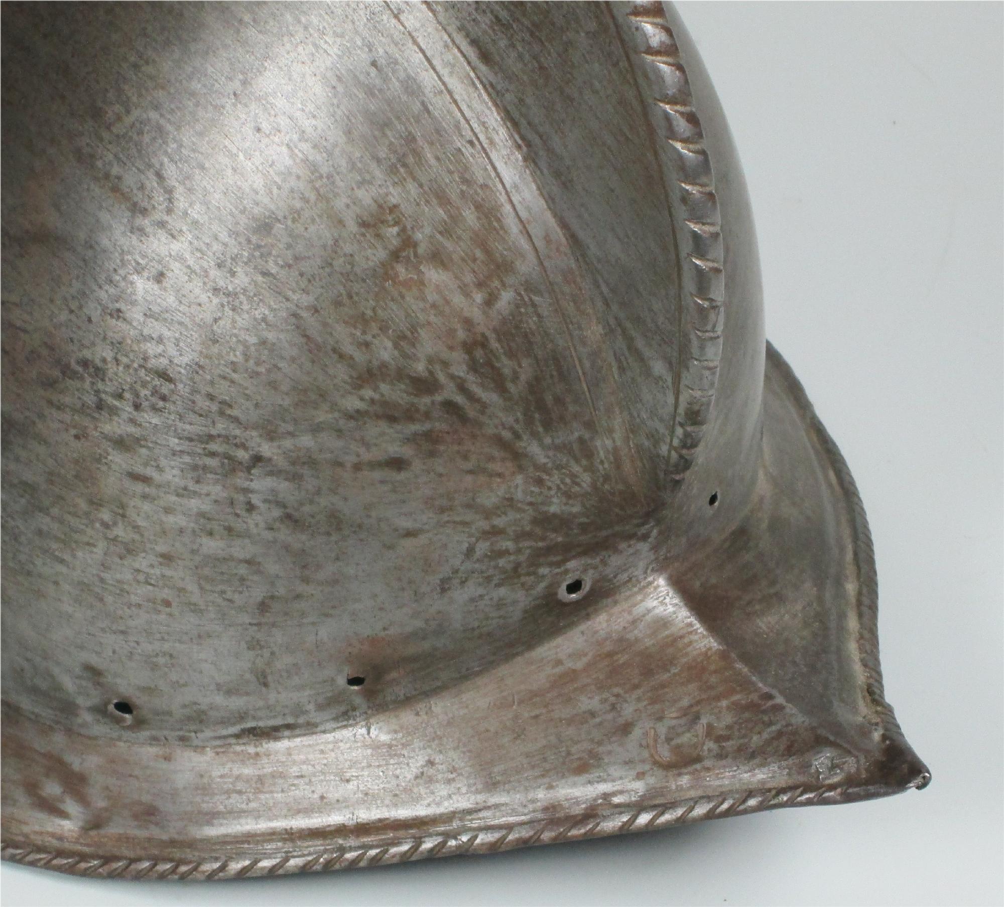 One piece morion. High crest. Typical brim rising to a point at the front and back. Edge of the brim rolled and roped. Top of the crest roped to match. Holes for lining and plume holder. There is a later hole in the crest and there are 2 patches - one small one in the crest and one larger one on the bottom of the bowl. Both are old and possibly working life patches. They are formed to the relevant portion of the helmet and have tapered edges to minimize catching. They are riveted to the bowl with a number of rivets which are filed flush on the outside, minimizing the look of the repair. Inspection of the surface shows that the surface appears to be nearly original, showing a typical set of rough grinding marks in the finish. This finish would have been polished, but not as well as the original finish on item number A-184. This is a nice example of a lower quality, but still polished finish. We also see two marks, one on each side of the forhead. One appears to be square, the other forming a small cross. These appear to be marks that would occur from square section weapon impacts.