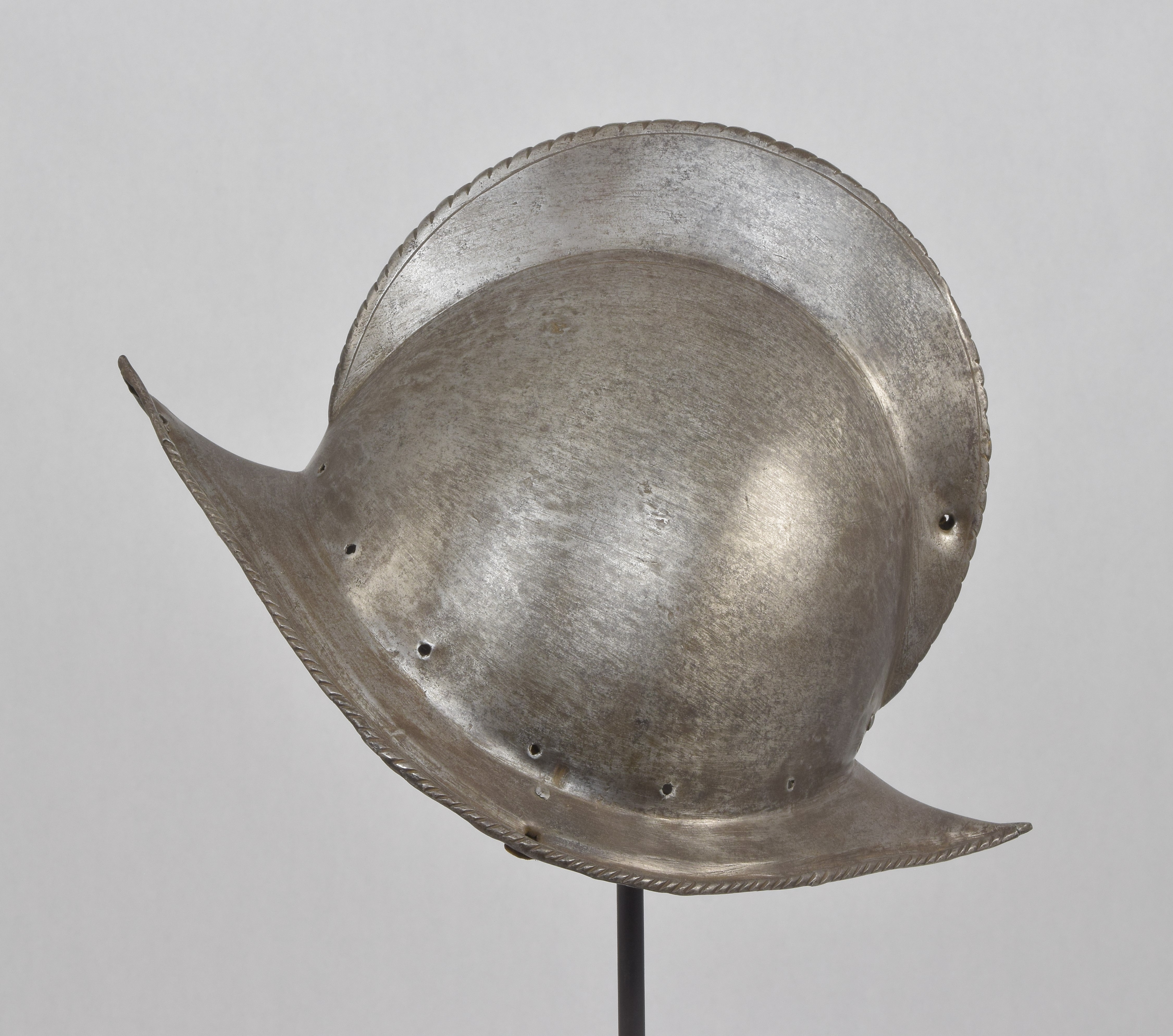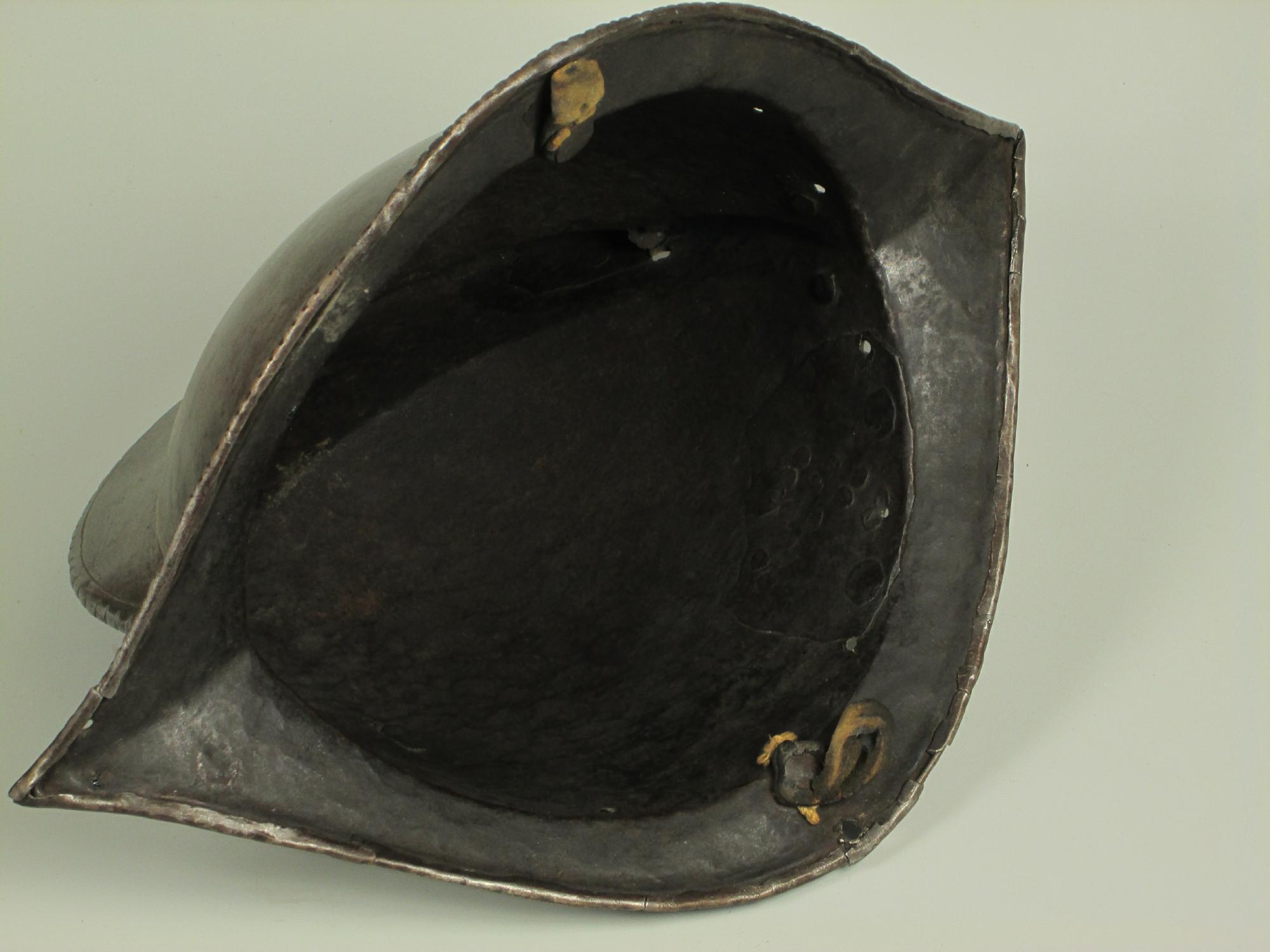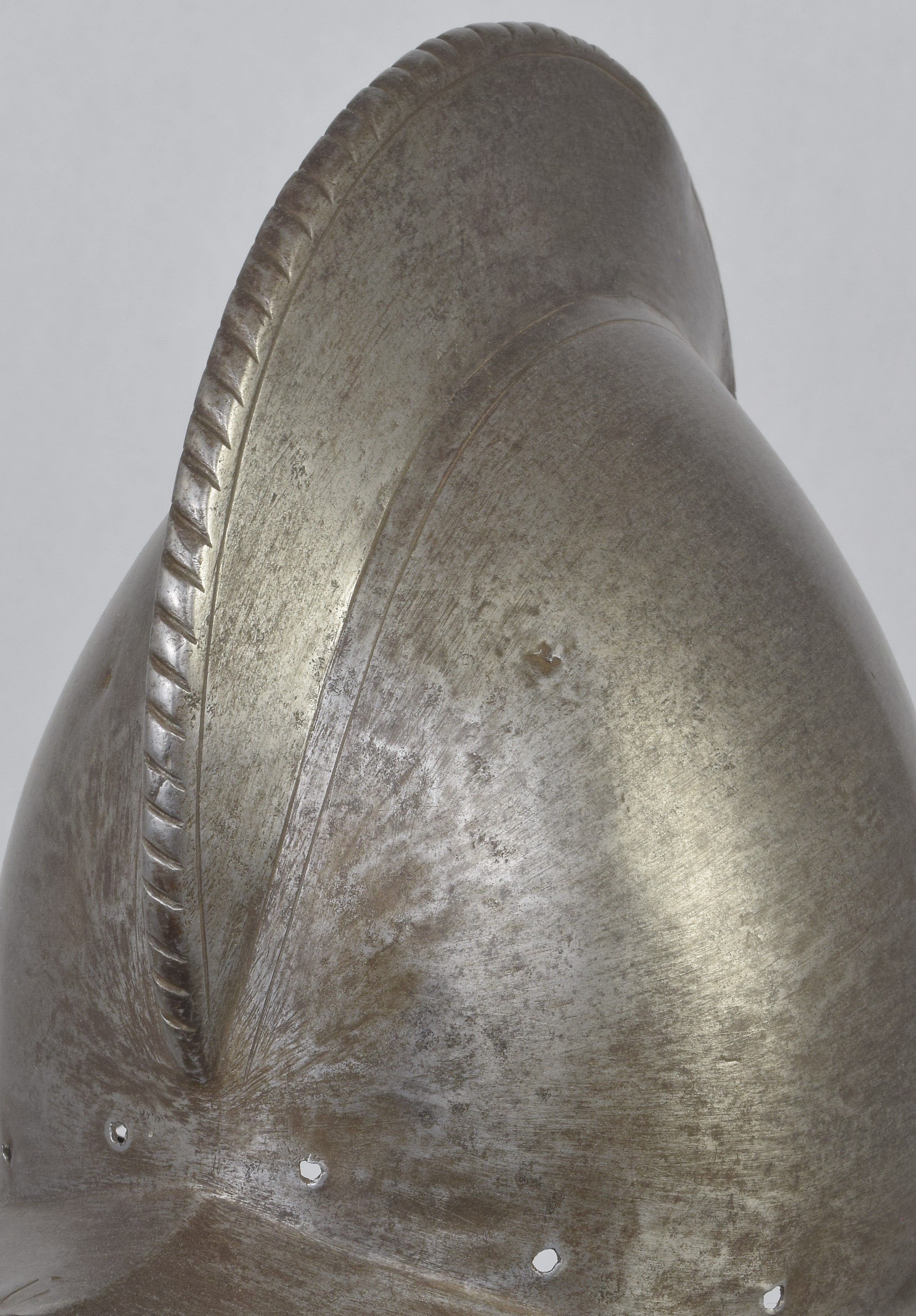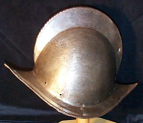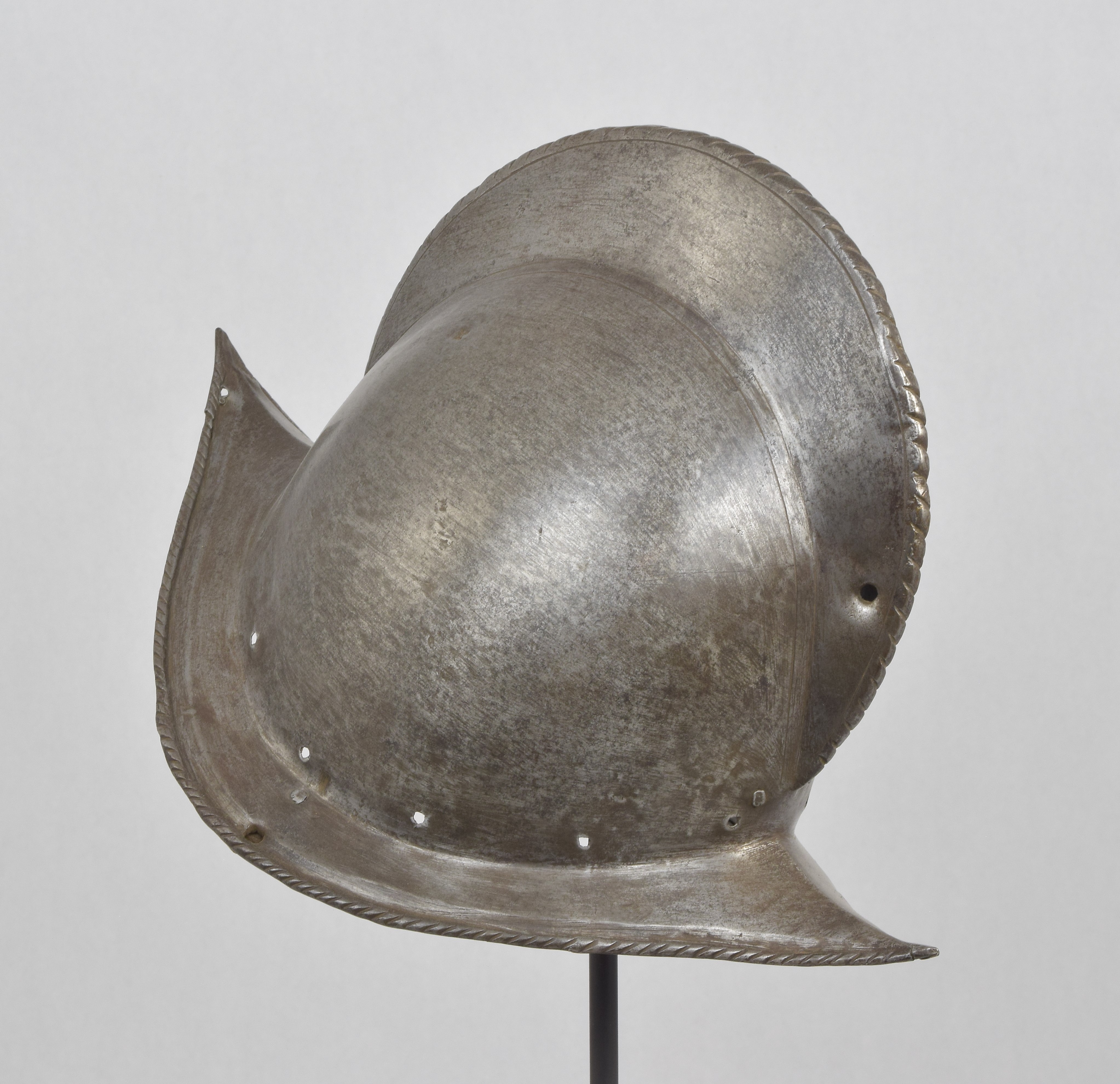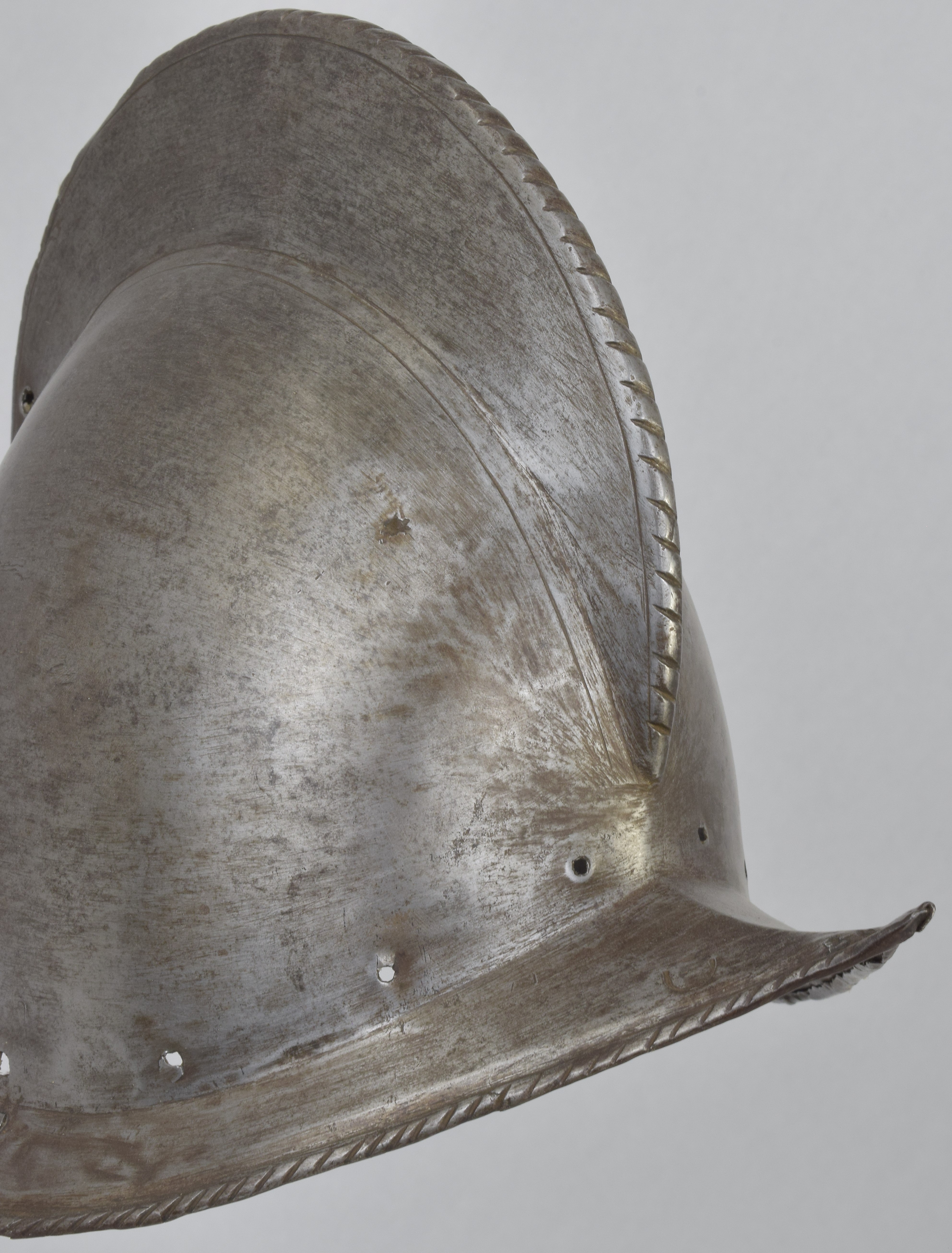One piece morion. High crest. Typical brim rising to a point at the front and back. Edge of the brim rolled and roped. Top of the crest roped to match. Holes for lining and plume holder. There is a later hole in the crest and there are 2 patches - one small one in the crest and one larger one on the bottom of the bowl. Both are old and possibly working life patches. They are formed to the relevant portion of the helmet and have tapered edges to minimize catching. They are riveted to the bowl with a number of rivets which are filed flush on the outside, minimizing the look of the repair. Inspection of the surface shows that the surface appears to be nearly original, showing a typical set of rough grinding marks in the finish. This finish would have been polished, but not as well as the original finish on item number A-184. This is a nice example of a lower quality, but still polished finish. We also see two marks, one on each side of the forhead. One appears to be square, the other forming a small cross. These appear to be marks that would occur from square section weapon impacts.