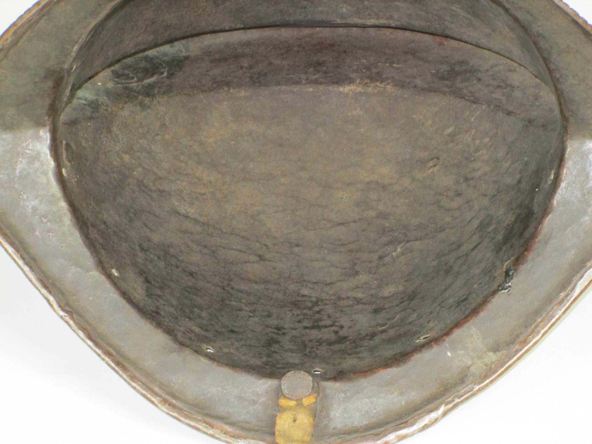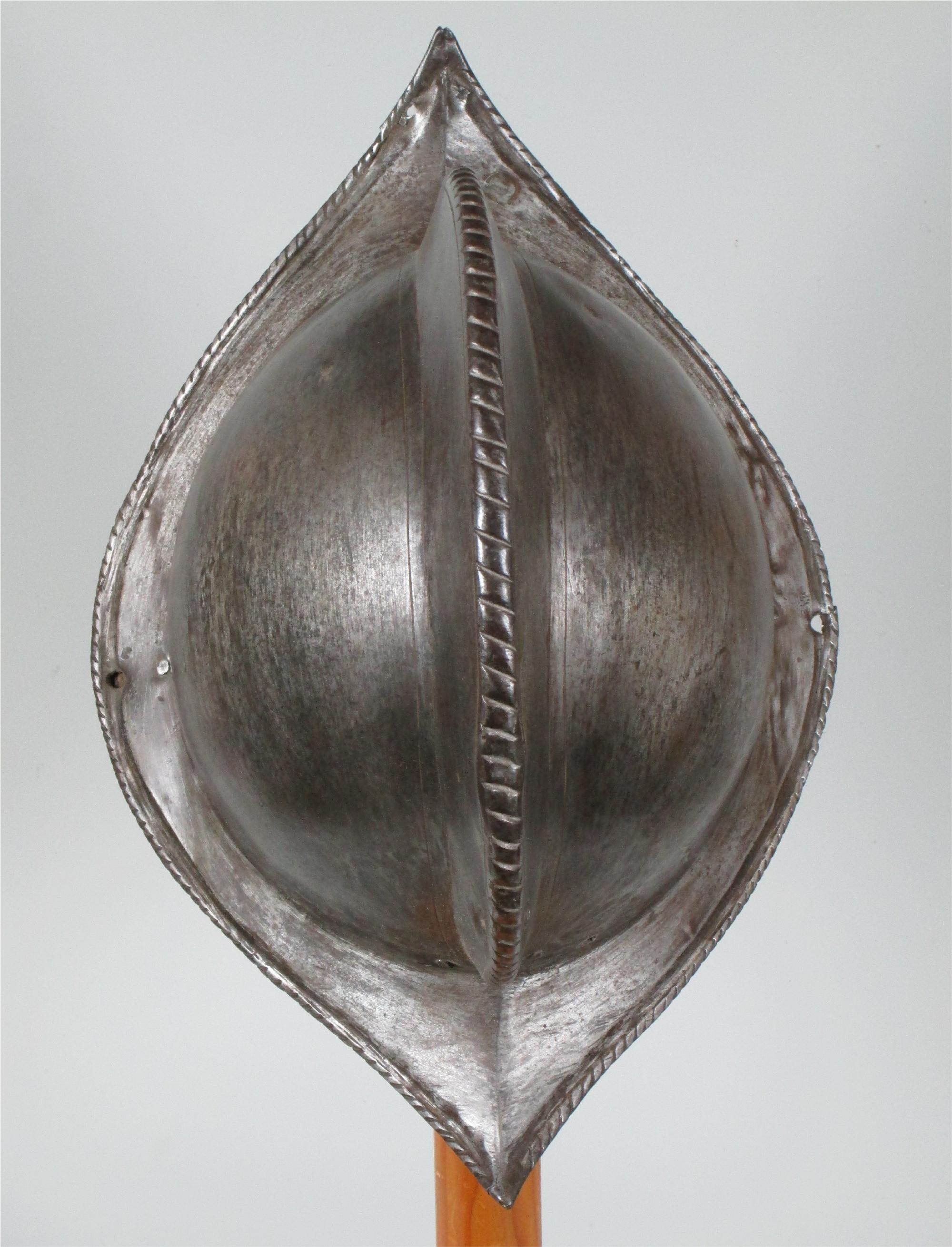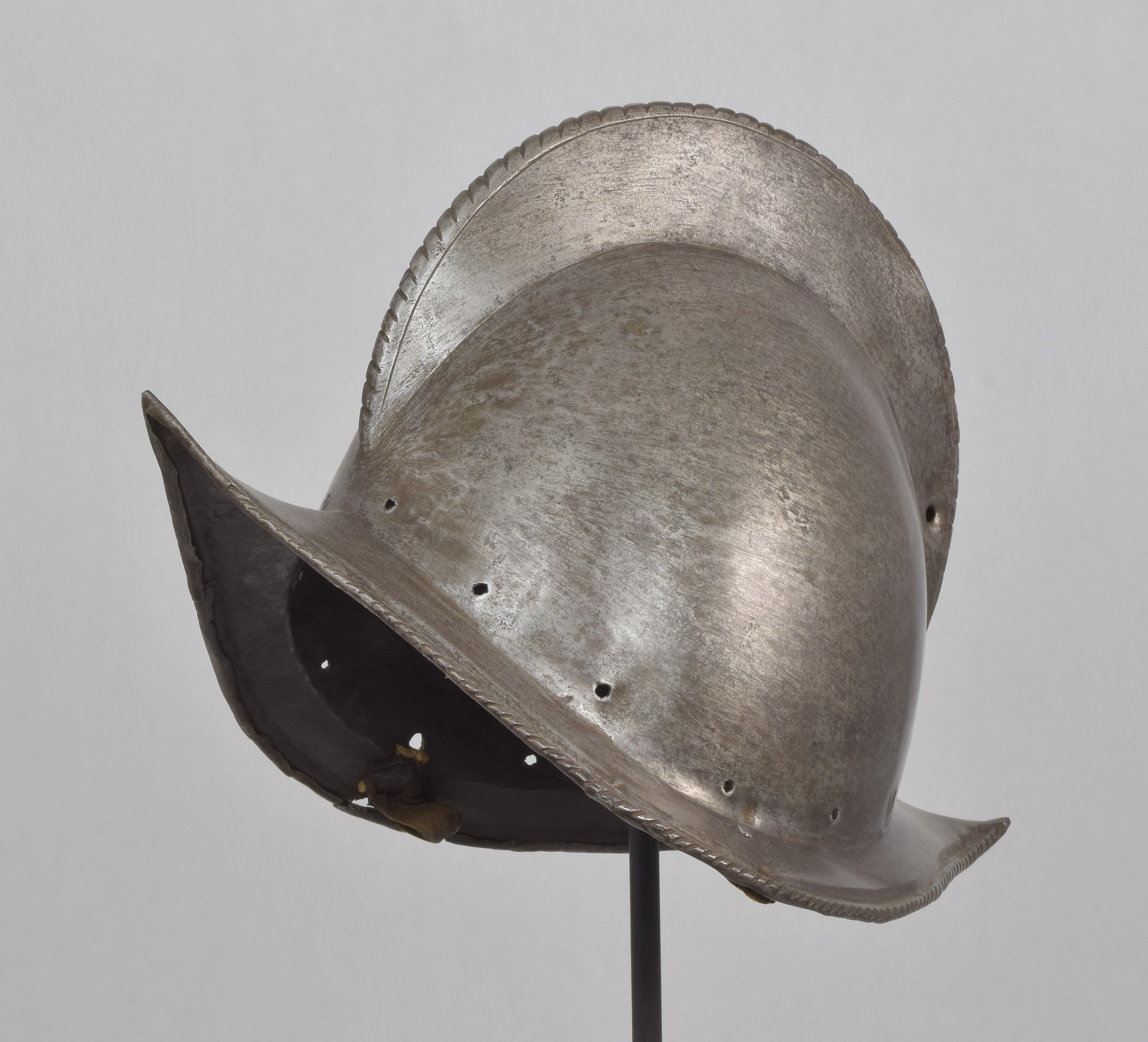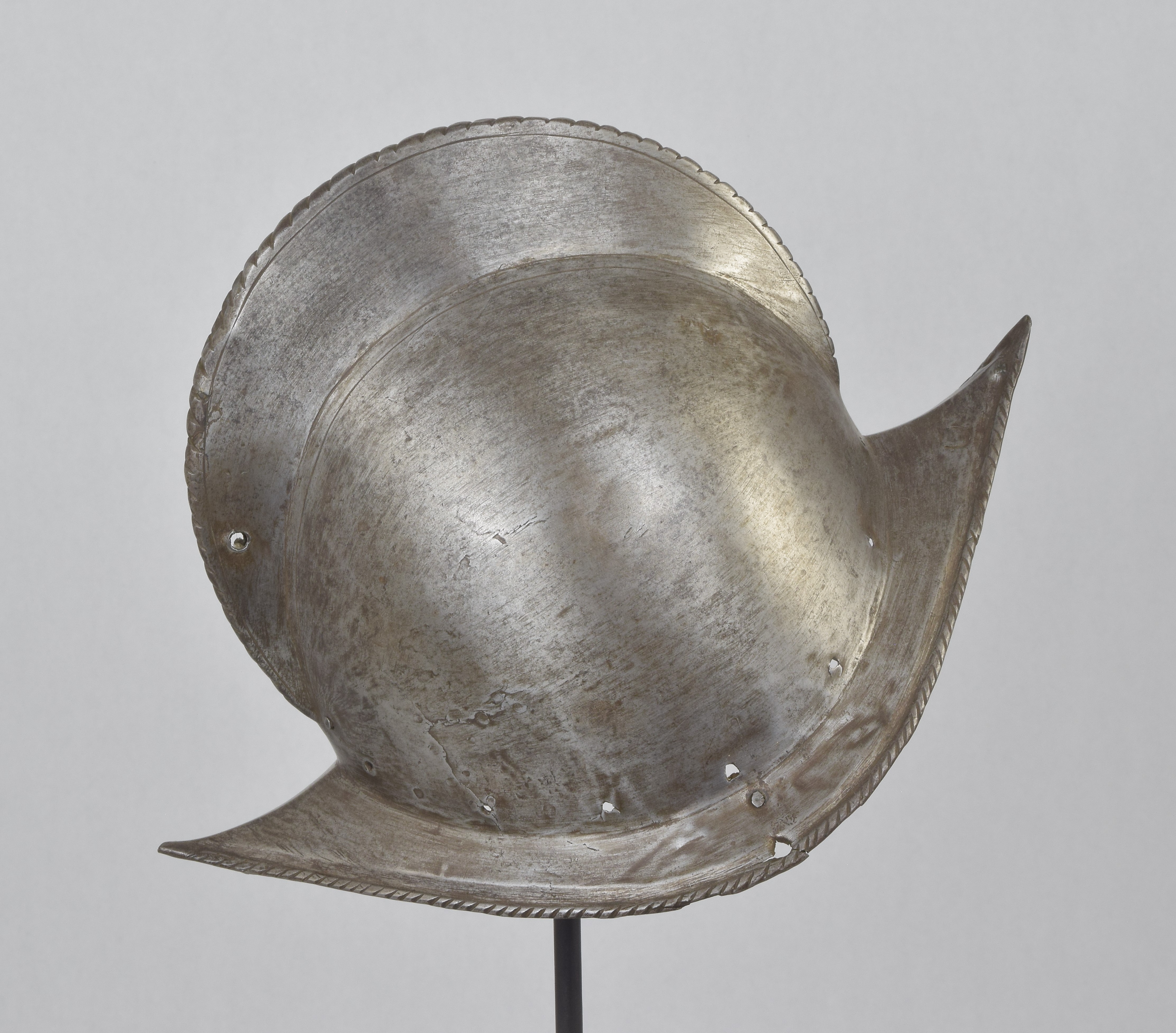 One piece morion. High crest. Typical brim rising to a point at the front and back. Edge of the brim rolled and roped. Top of the crest roped to match. Holes for lining and plume holder. There is a later hole in the crest and there are 2 patches - one small one in the crest and one larger one on the bottom of the bowl. Both are old and possibly working life patches. They are formed to the relevant portion of the helmet and have tapered edges to minimize catching. They are riveted to the bowl with a number of rivets which are filed flush on the outside, minimizing the look of the repair. Inspection of the surface shows that the surface appears to be nearly original, showing a typical set of rough grinding marks in the finish. This finish would have been polished, but not as well as the original finish on item number A-184. This is a nice example of a lower quality, but still polished finish. We also see two marks, one on each side of the forhead. One appears to be square, the other forming a small cross. These appear to be marks that would occur from square section weapon impacts.