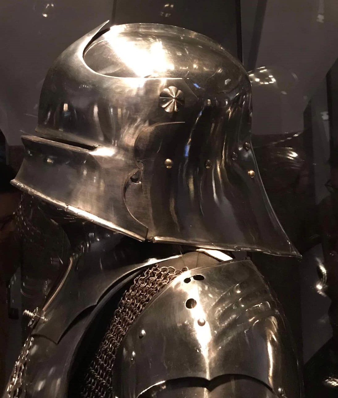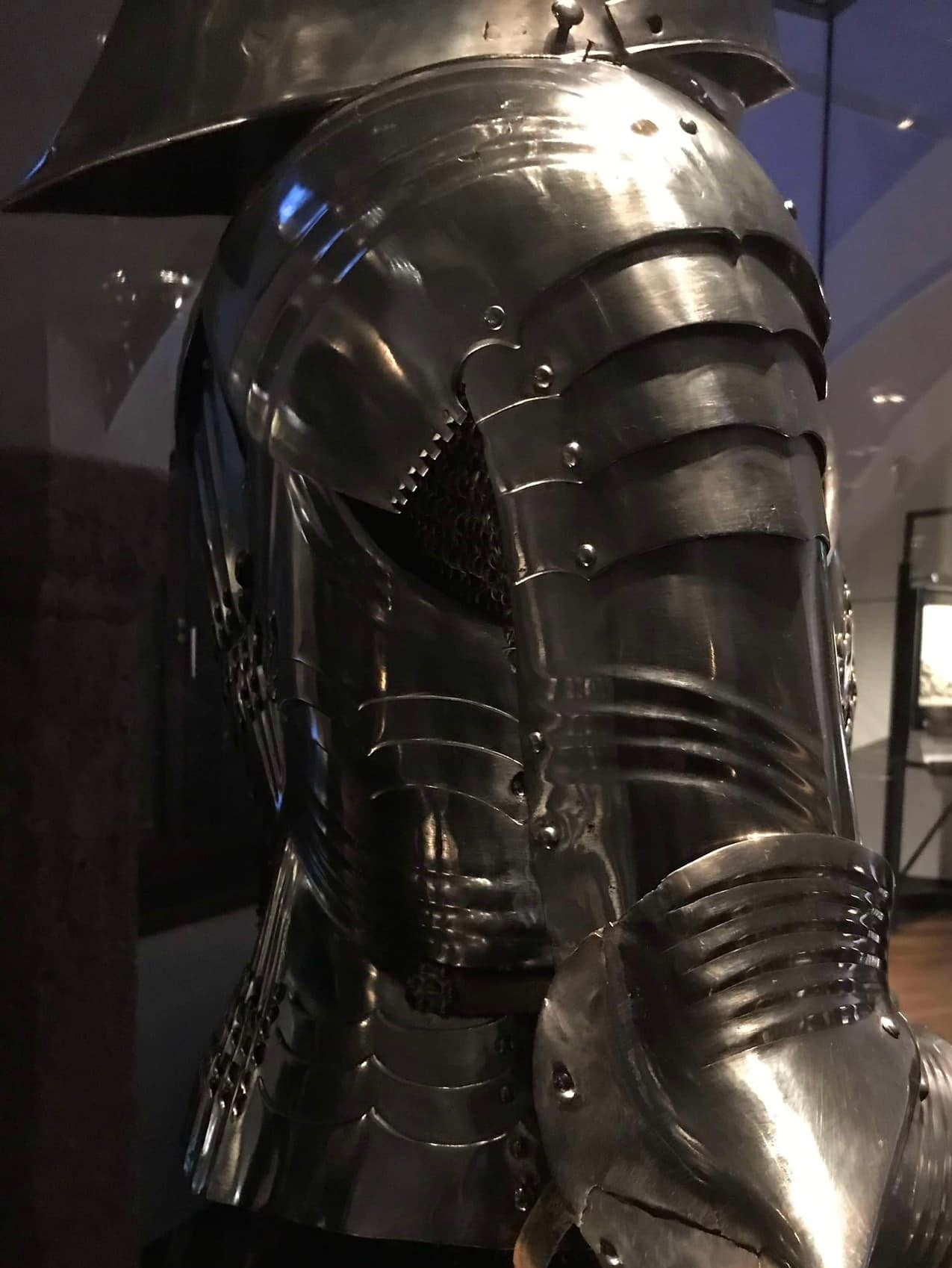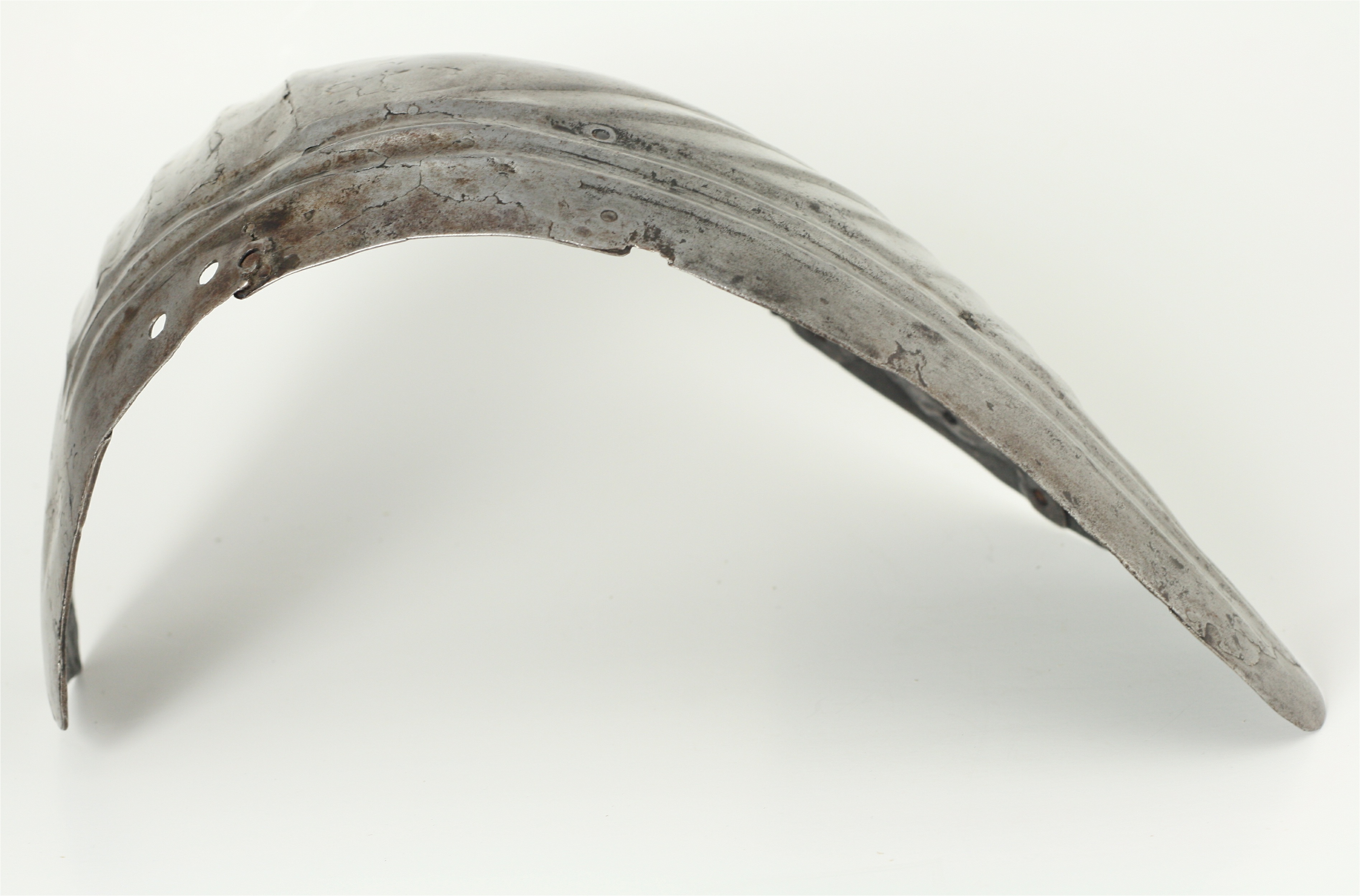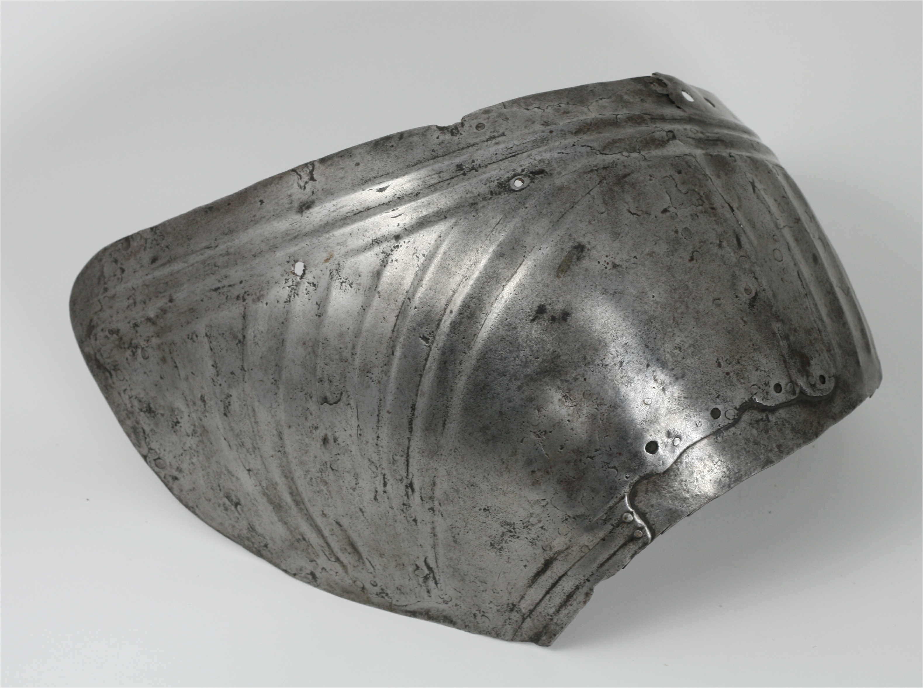 Main plate from a pauldron. One piece with radiating flutes in the back, parallel horizontal flutes at the top and vertical flutes on the side. The front appears to have been unfluted. Together with a modern copy made as a mate. This was in the Granscay collection, the well made mate was likely made by the armourers at the Metropolitan Museum of Art. The original has significant modern patches riveted inside. These patches are typical of the 19th/early 20th c. patch work done on the Rhodes pieces that came through the Bachereau shop. I have generally assumed that this pauldron would have had underlapping plates above this plate and underlapping plates fitted to the arm below this plate. We can see the former lower edge had a cut out for the arm plates.