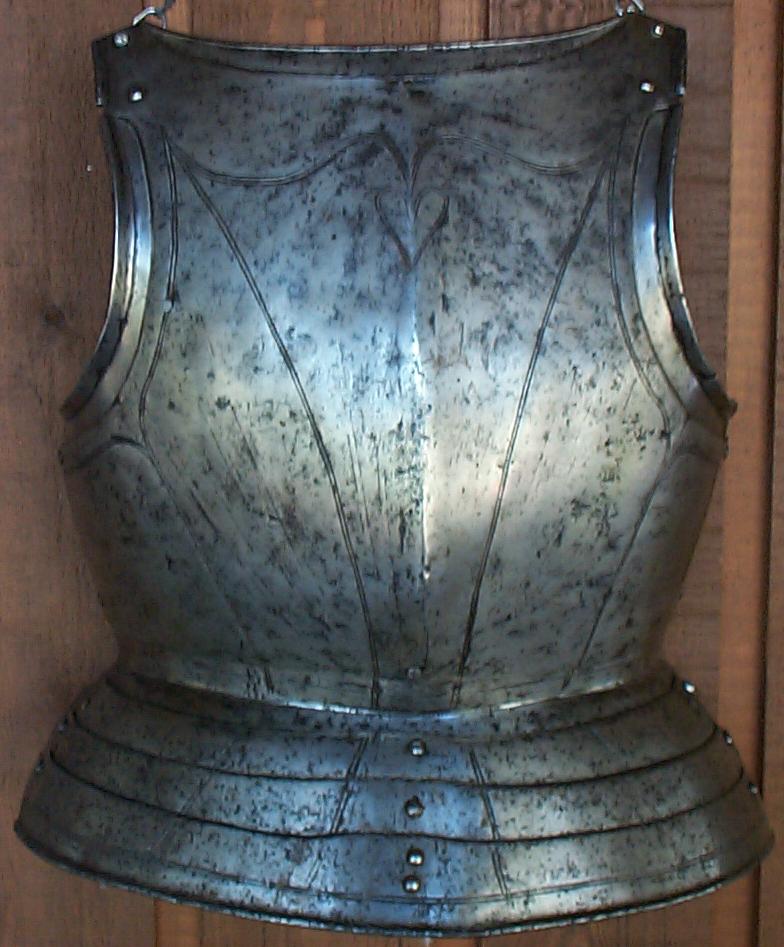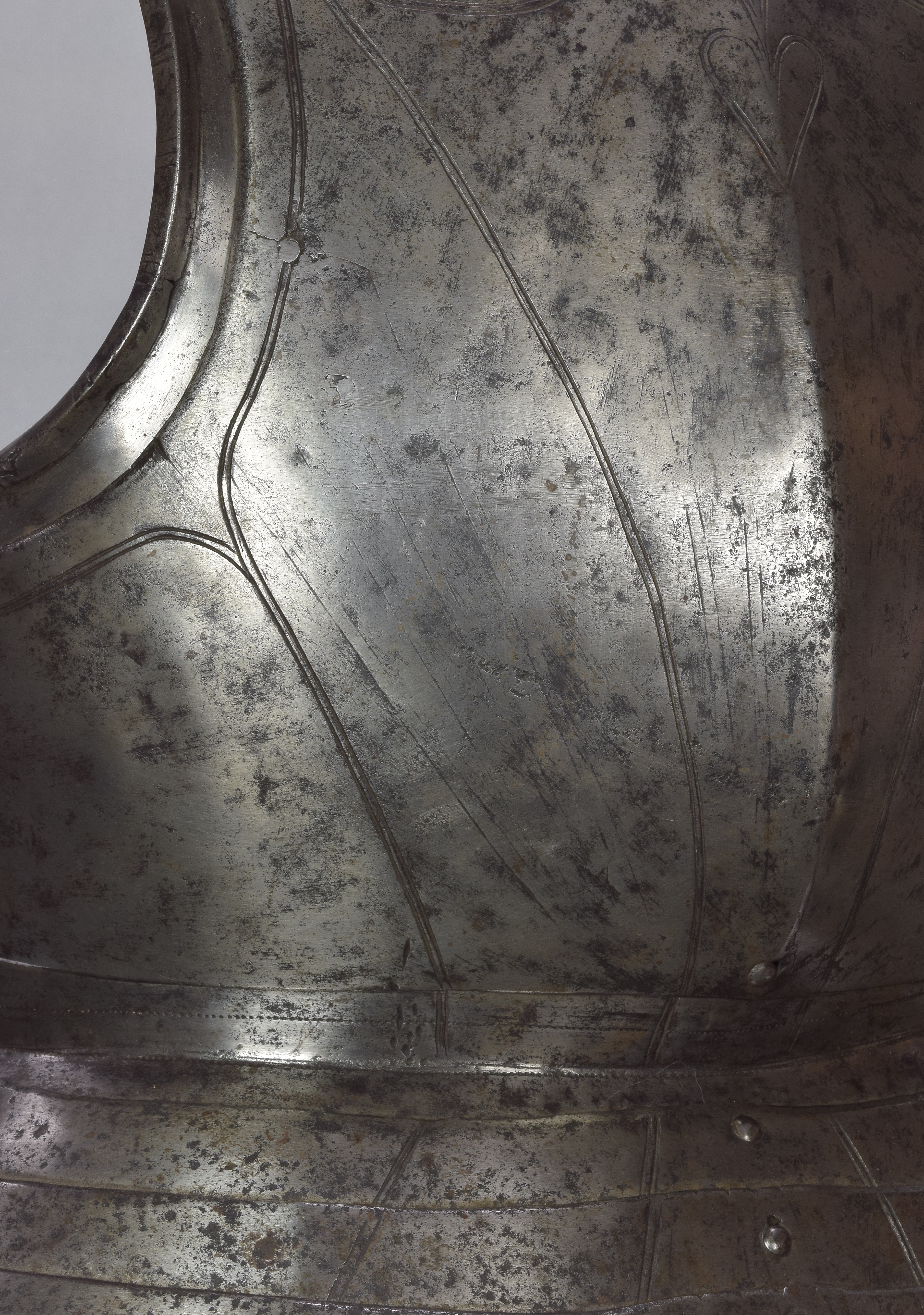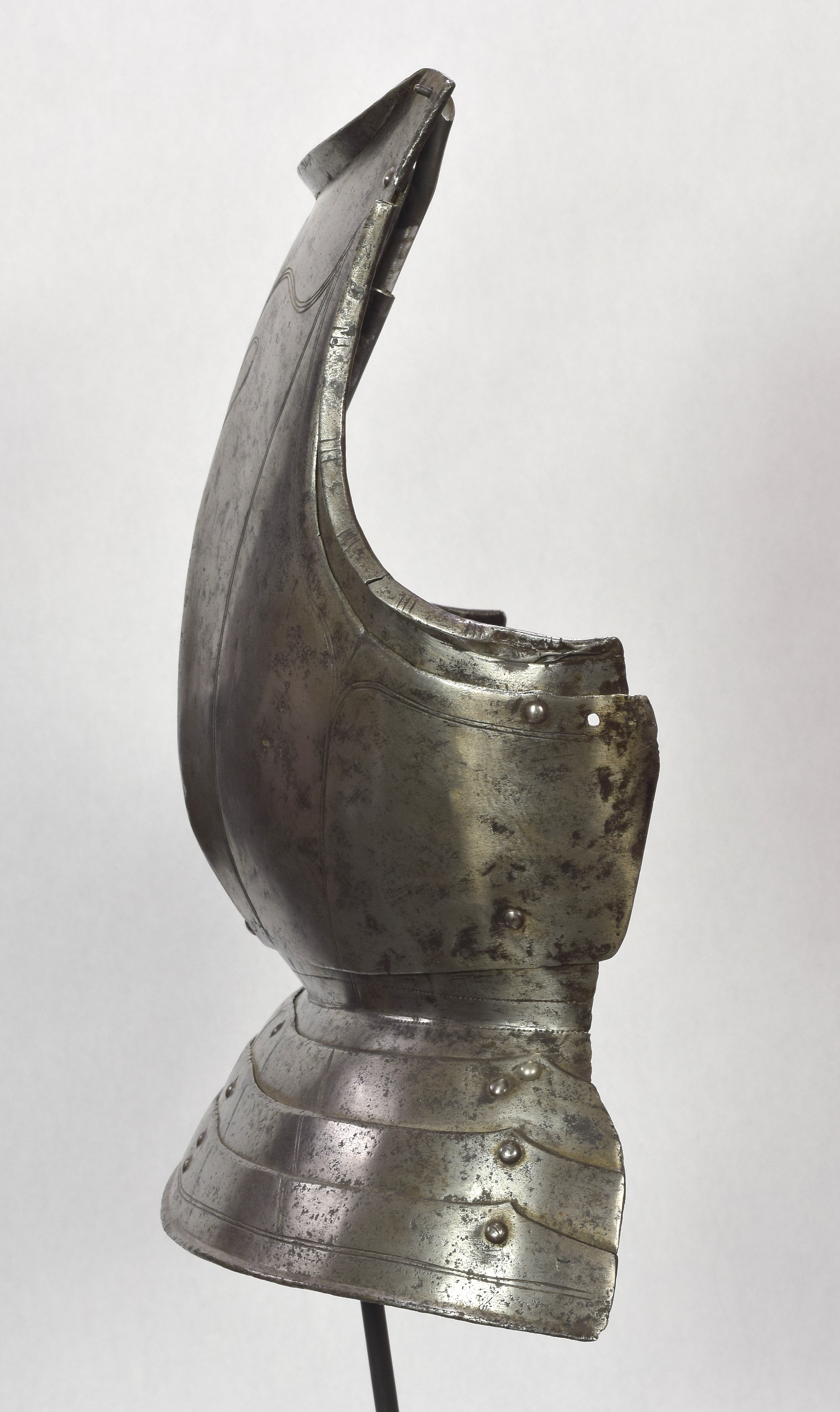 Breast and Back. Set up for infantry use. Decorated with pairs of incised lines (at the top border, tripples). Backplate with simple rolls at the arms, neck and base of the waist lame. Waist formed of a large waist lame. Additional lame at the top. Each plate attached by 3 sliding rivets. Breast with a central ridge of globose form. Neck and arms with outward triangular rolls. Arm holes with fixed gussets. Fauld of 3 lames decorated en suite with the breast and back.