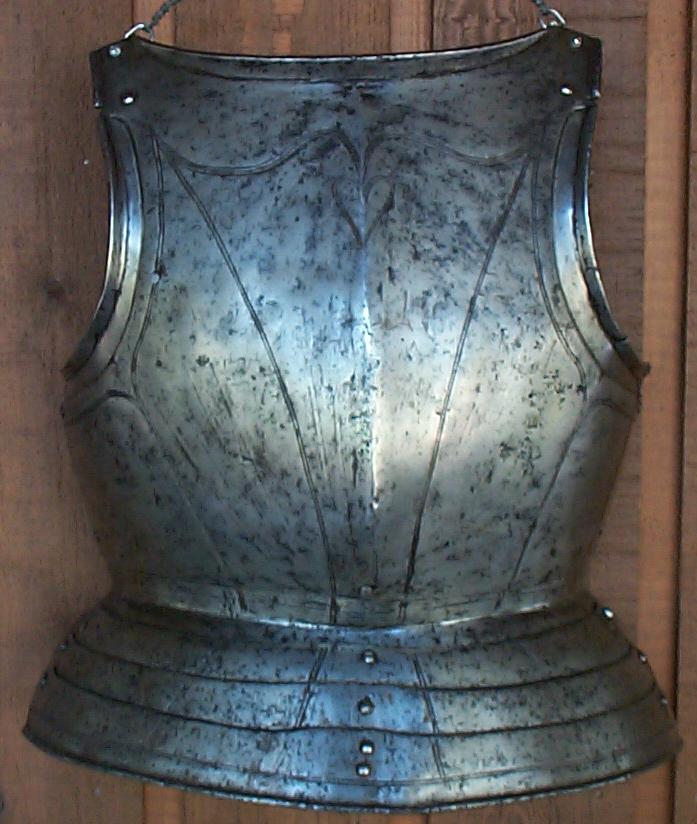 The breastplate is of heavier construction than the back. It is decorated with incised lines that match the backplate, with the addition of a heart below the upper center. The main plate is 12 1/2" high. The waist lame is 2" above the center line and 1 1/2" below. It is agressively flaired to match the breast and fauld. The fauld is formed of 3 upward lapping lames. Each has a point over the sliding rivets at the side and rises slightly at the center. The bottom plate has a small inward roll on its bottom edge. Close inspection of the lames of the fauld shows signs of cusping at the center of the upper edges of the plates and the remains of a central spray of flutes. The very straight form of the profile of the fauld confirms the assumption that the fauld was originally a late 15th c. German culet. This breastplate illustrates the adaptation of older pieces of armour to bring them up-to-date.