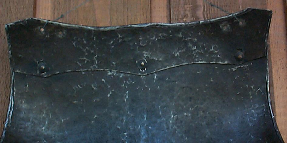 Upper lame is 3 inches high at its tallest points (near the ends). It is scalloped to form points at the sliding rivets on the bottom edge. It is scalloped on the upper edge to form a point in the center and to rise up at the ends. Upper edge formed into a narrow inward roll.