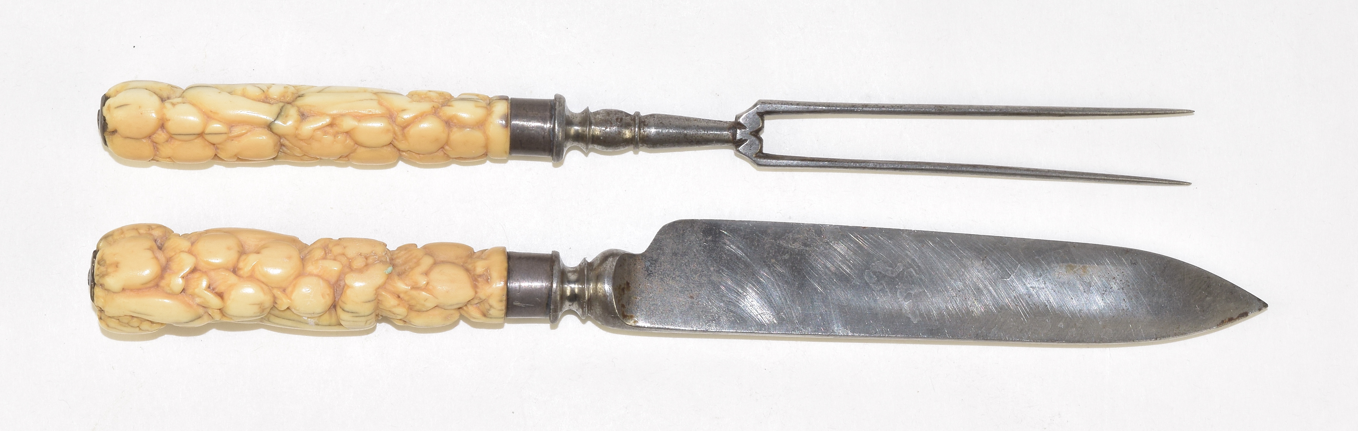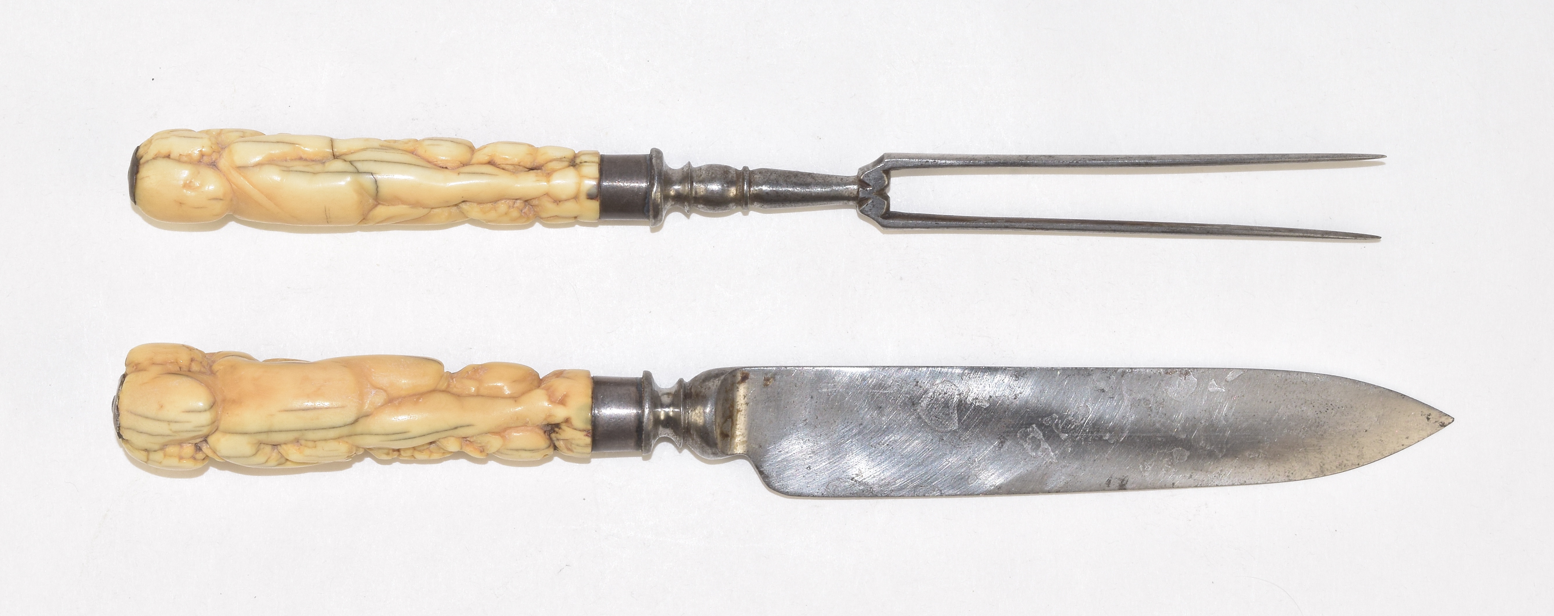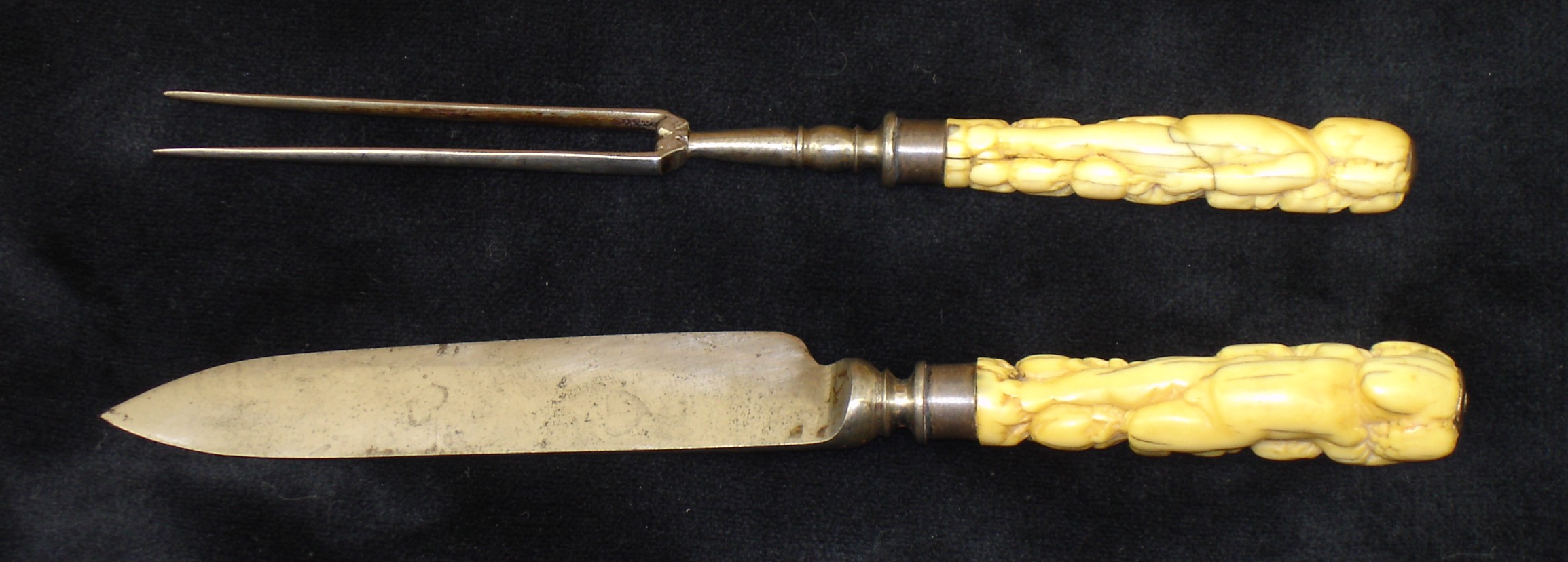 knife and fork. Carved bone or ivory handles in the form of naked figures on one side and garlands of fruit on the other. Very nice example, in good condition. Obvious original wear to the handles from original use.