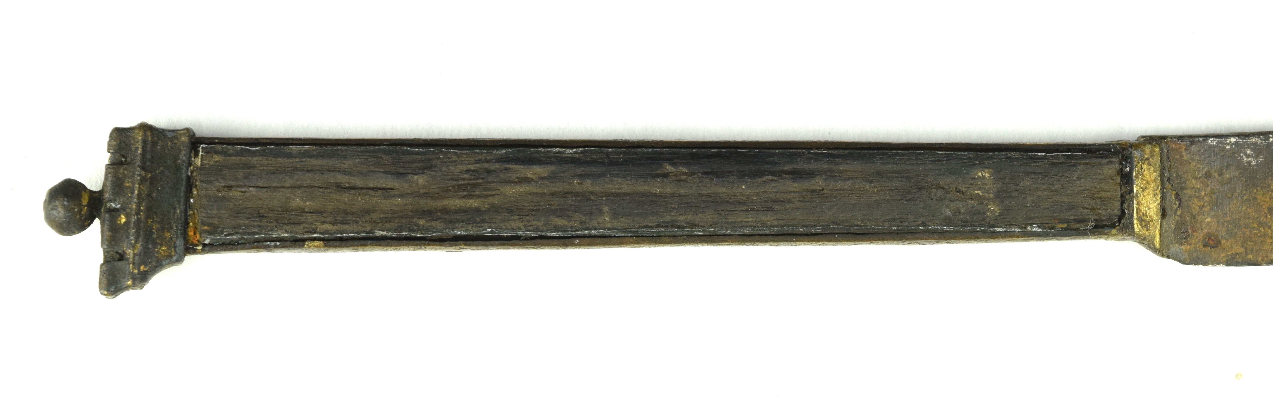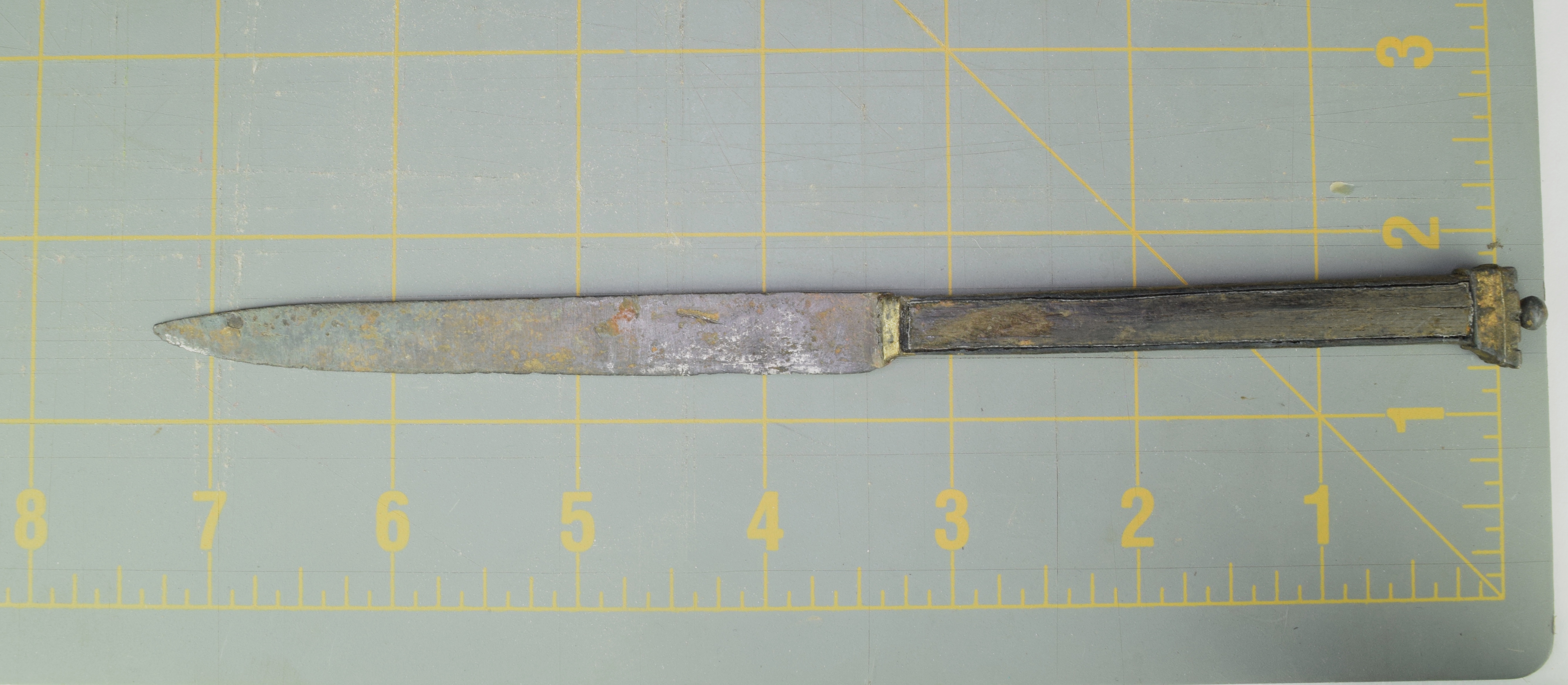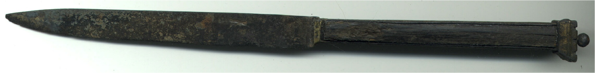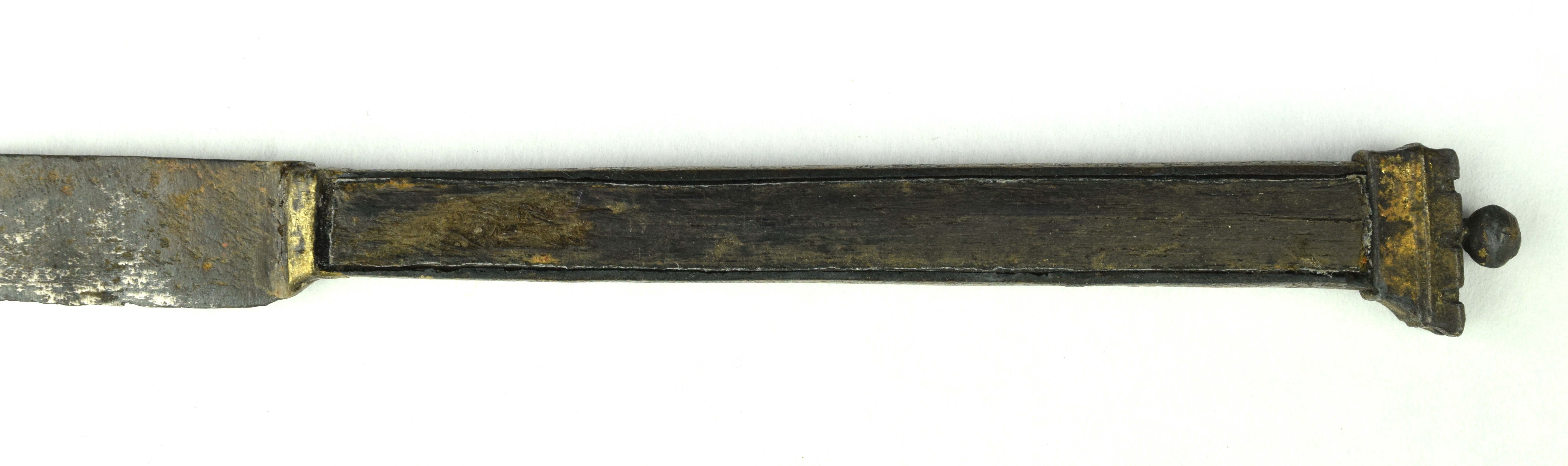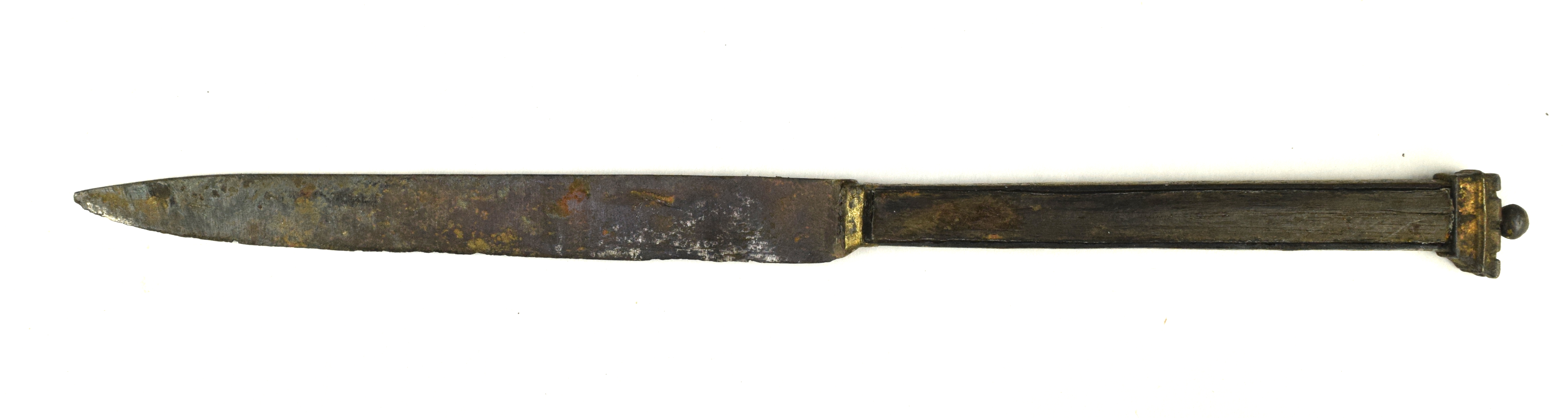 Knife from the Avon at Salisbury, marked with a saw, wooden scales in a brassy surround, pommelled. Very nice condition. Copper alloy portions retaining portions of original gilt. Simple applied copper alloy bolster, back and front strips and a crenelated and decorated pommel surmounted by a ball finial. Ex. Coll. Simon Moore (inv. #90.23). An elegant and delicate knife weighing 18.98 grams (292 grains or .669 ounces). Length including ball finial 7 7/16 inches (18.9 cm). The back of the blade is app. .085 in thick for much of the length of the blade, tapering to .050 where painted with the Simon Moore inventory number.