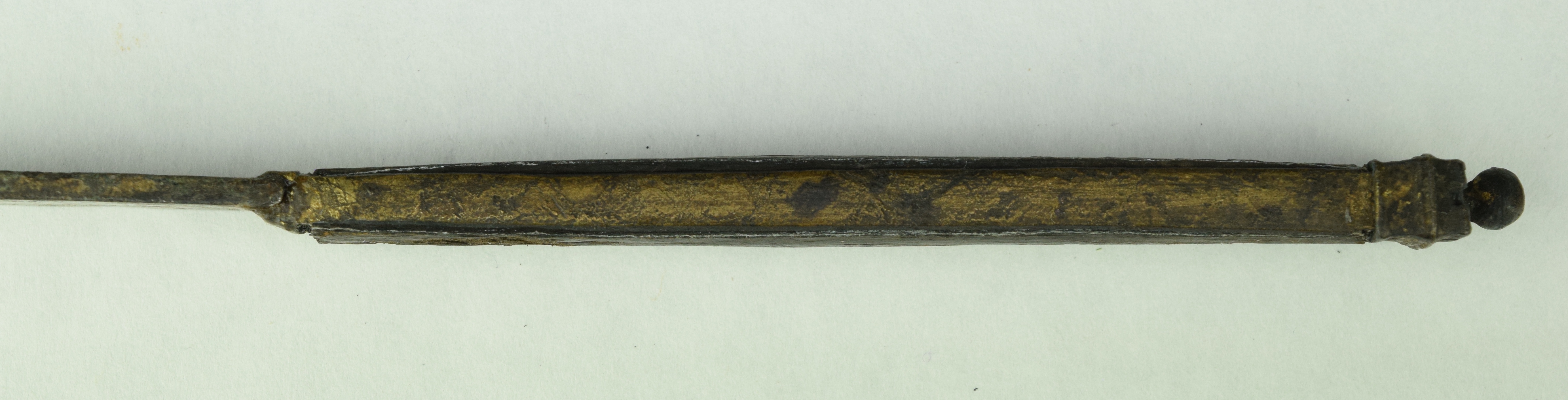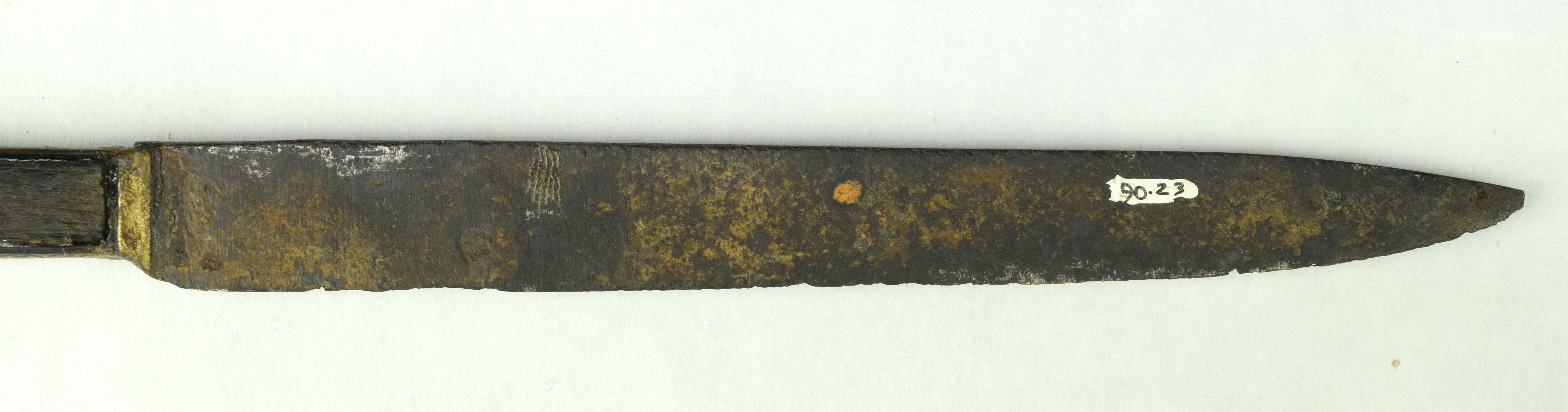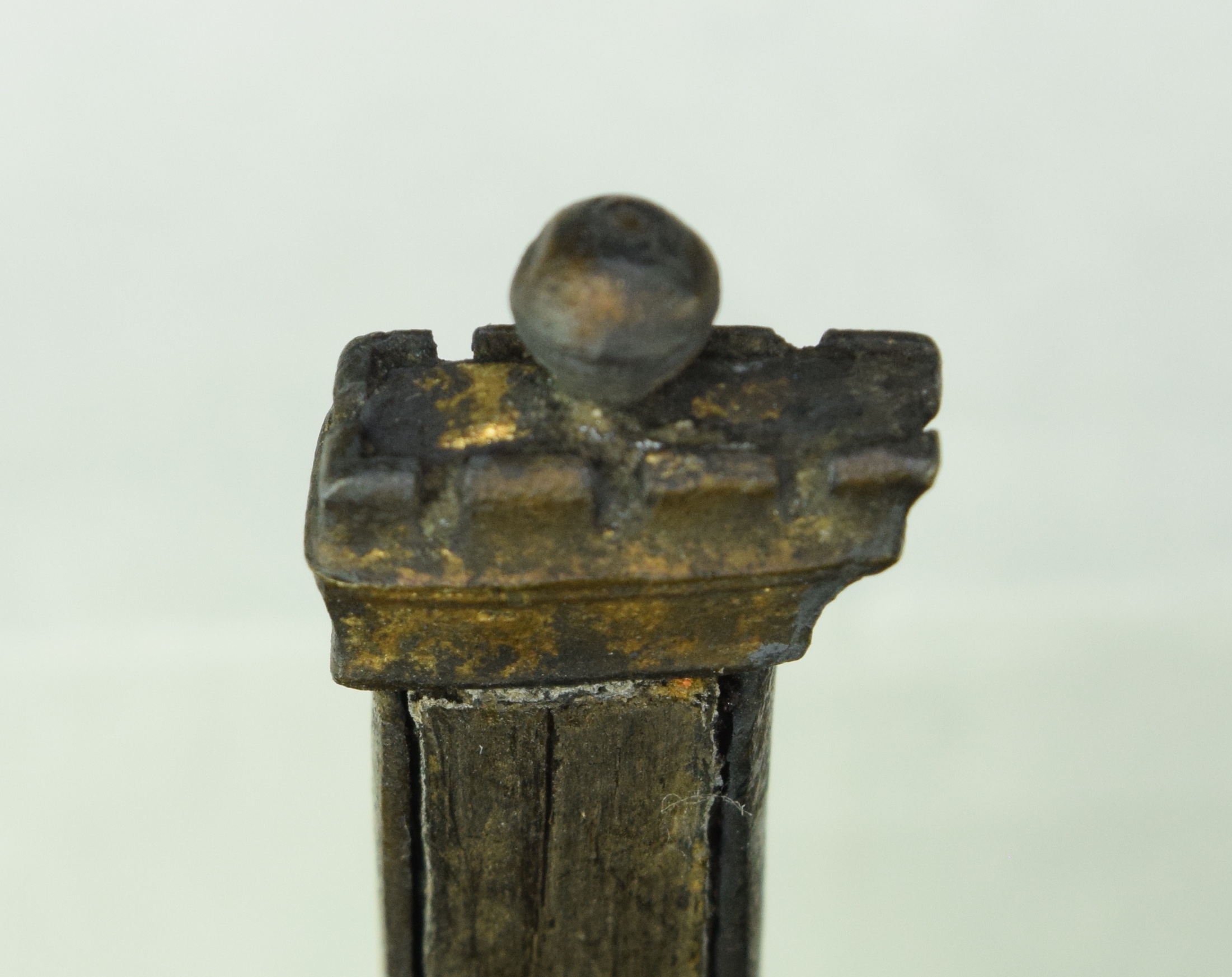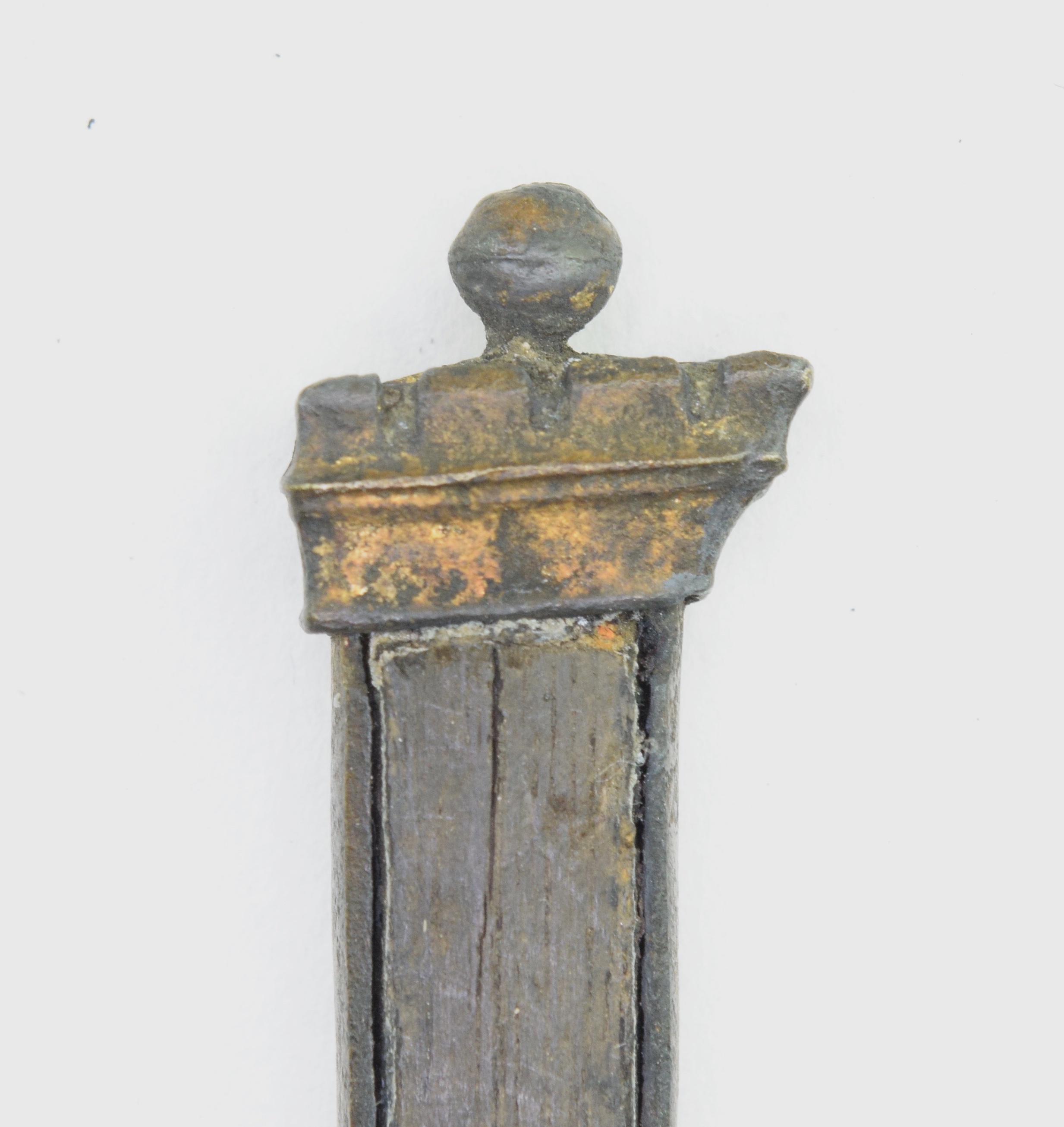 Knife from the Avon at Salisbury, marked with a saw, wooden scales in a brassy surround, pommelled. Very nice condition. Copper alloy portions retaining portions of original gilt. Simple applied copper alloy bolster, back and front strips and a crenelated and decorated pommel surmounted by a ball finial. Ex. Coll. Simon Moore (inv. #90.23). An elegant and delicate knife weighing 18.98 grams (292 grains or .669 ounces). Length including ball finial 7 7/16 inches (18.9 cm). The back of the blade is app. .085 in thick for much of the length of the blade, tapering to .050 where painted with the Simon Moore inventory number.