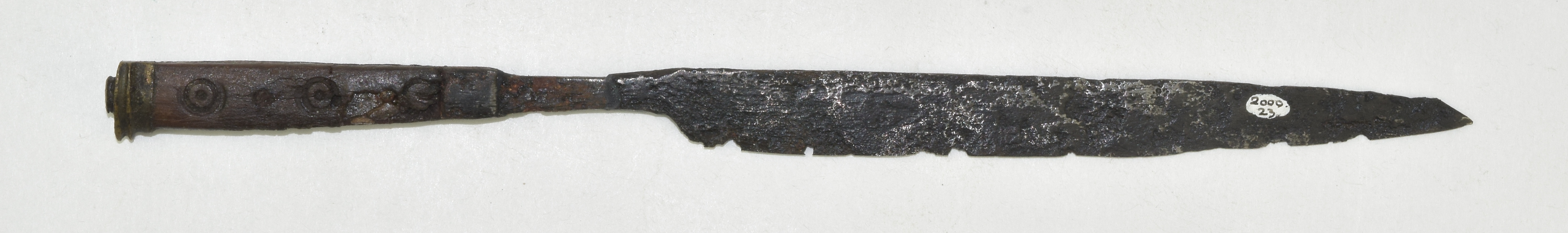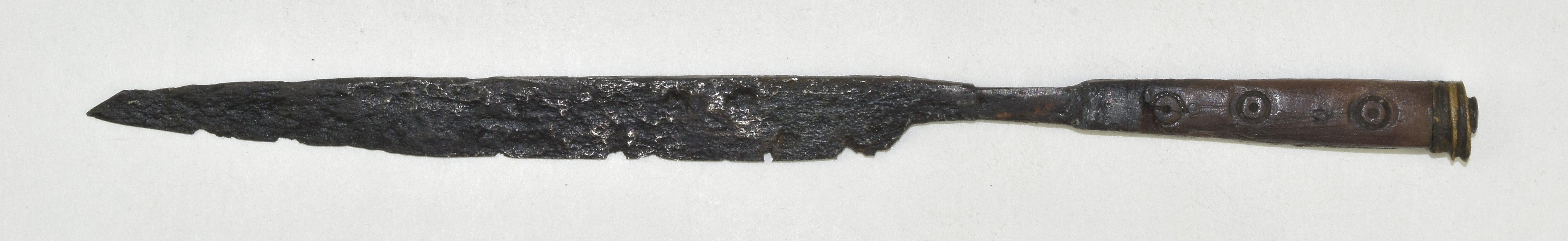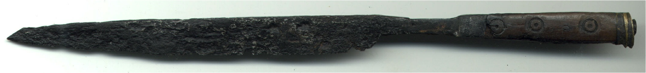 Narrow knife from the Thames, marked twice with ??, iron bolster and bone scales decorated ring and dot, small wafered brass tang plate. 6 3/4 in. long. Ex. Col. Simon Moore #2000.23