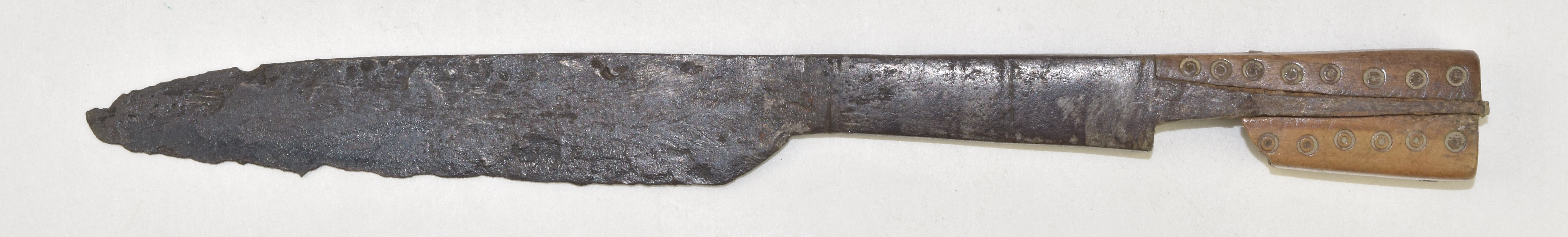 Blade with drop point. Integral long bolster of rectangular form. through tang at 90 degrees from the blade. Horn handle with spot and circle decoration. Handle of 2 plates. One whole, the other missing the forward portion. Terminal plate lacking. Overall very good condition for the age.