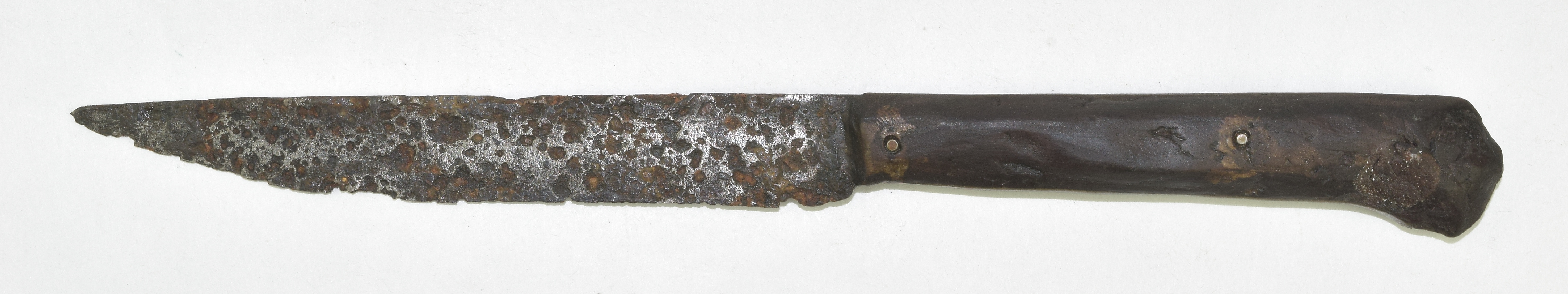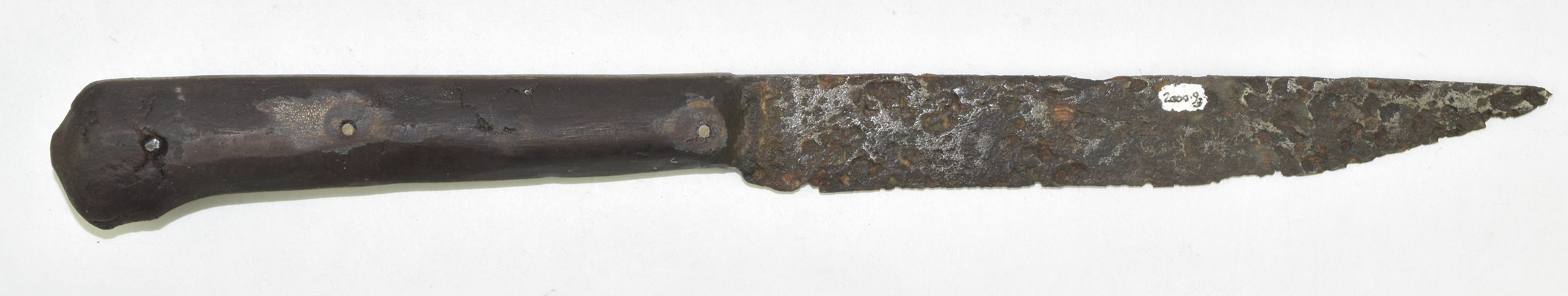 bellied blade with straight back. Solid flat through tang with copper alloy edge. Handle of two wooden scales secured by solid iron pins.