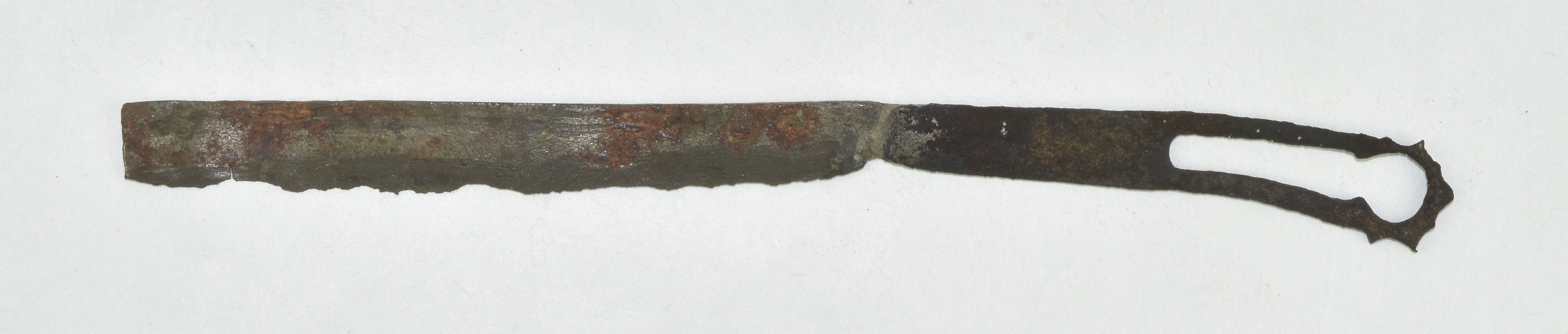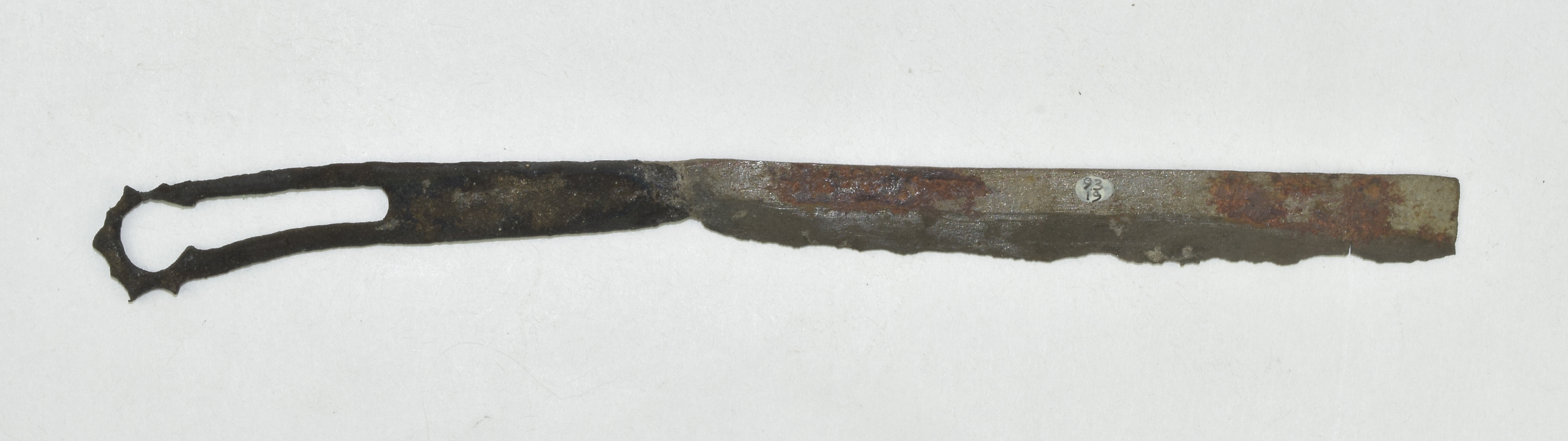 Knife with sunburst finialled latten haft (repaired at join to blade, also the blade tip - app. 1cm - is missing), c.1350 The blade has a triple mark - 2 crosses with a circle between. Marks at this date are extremely rare.